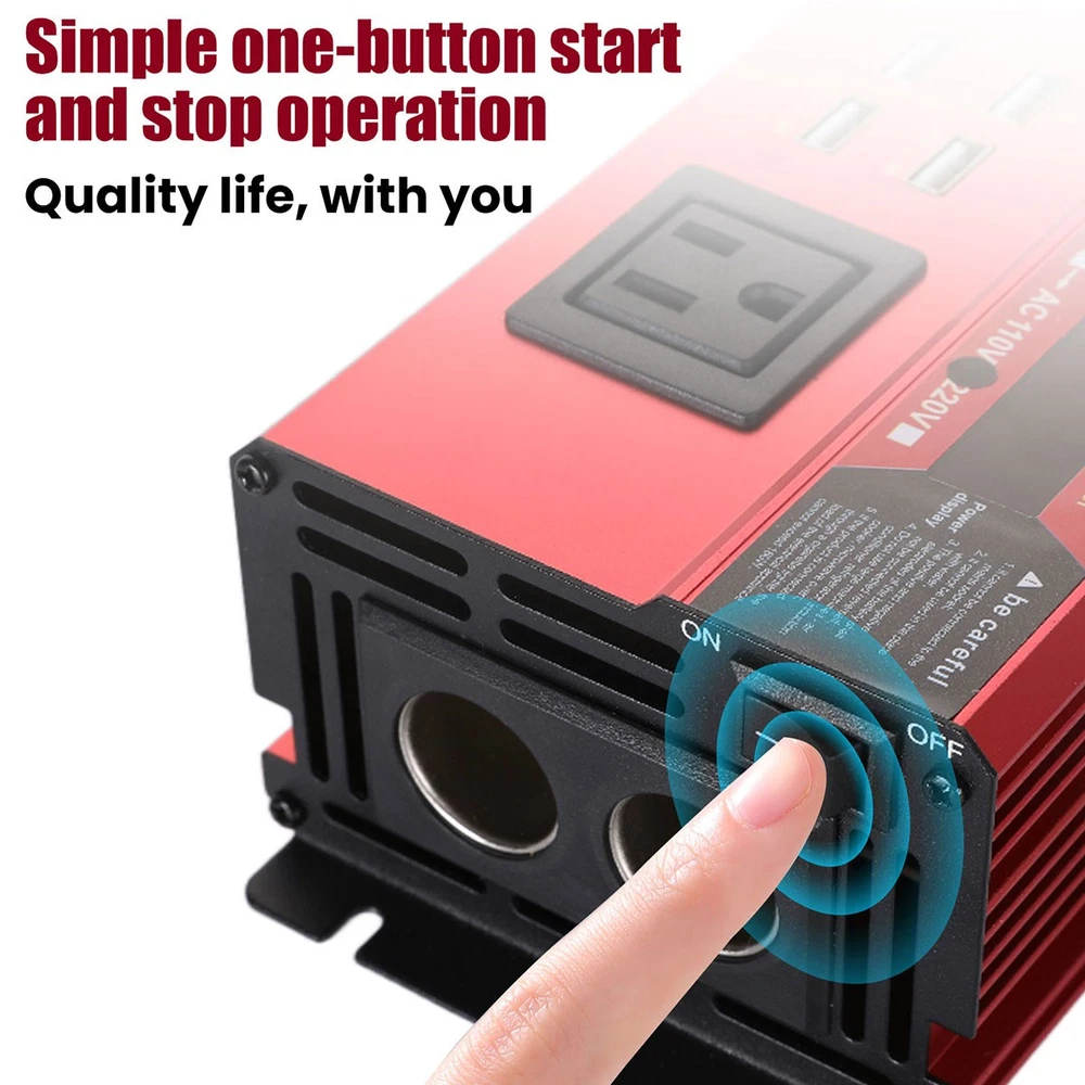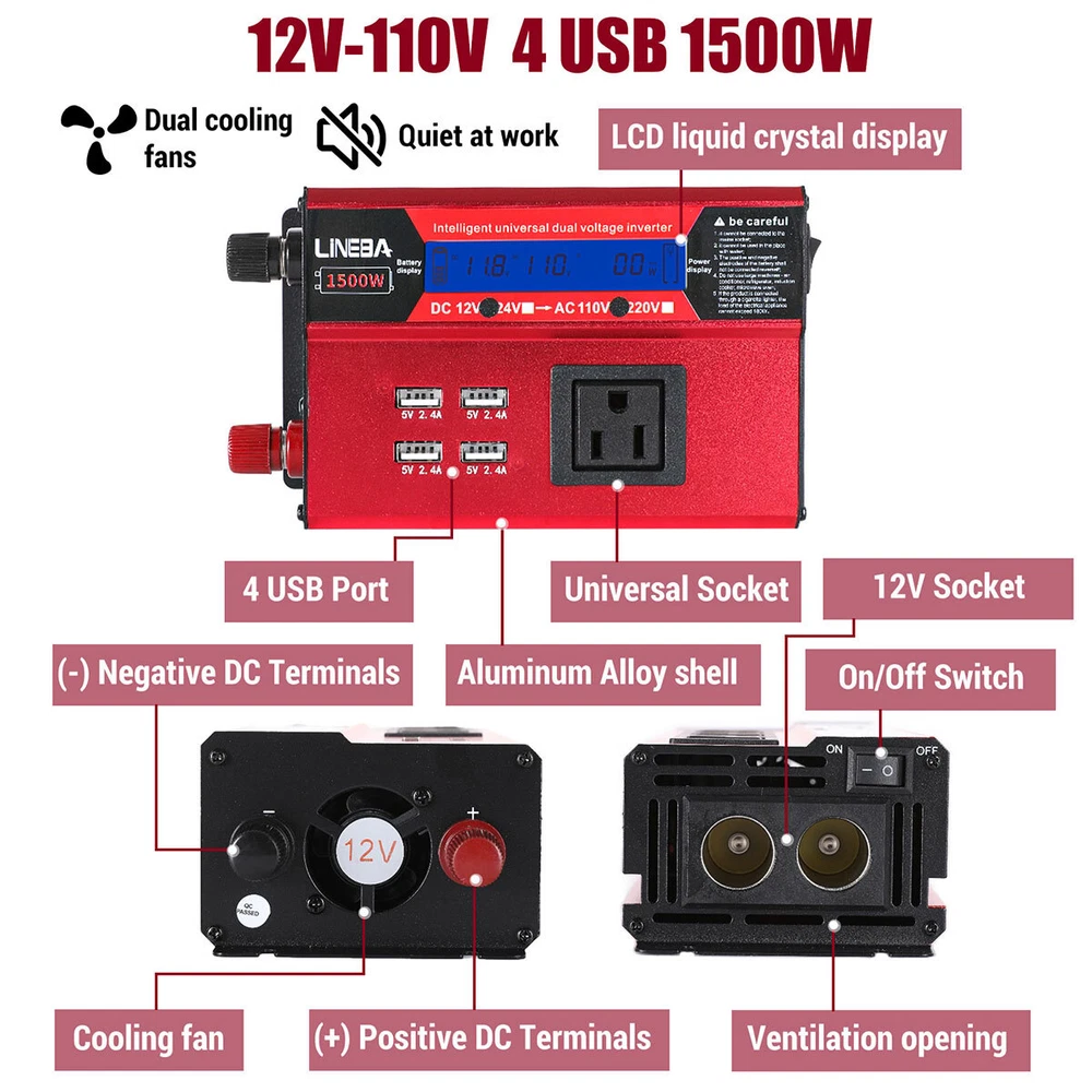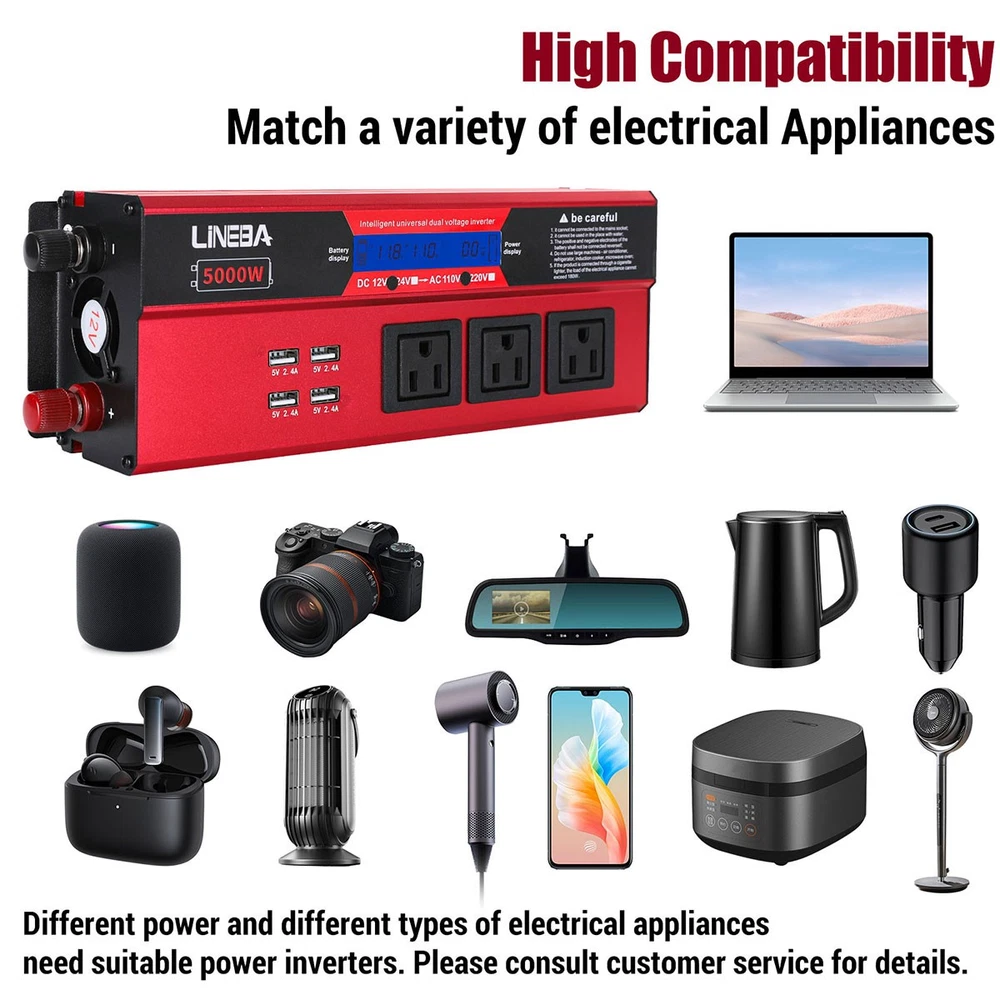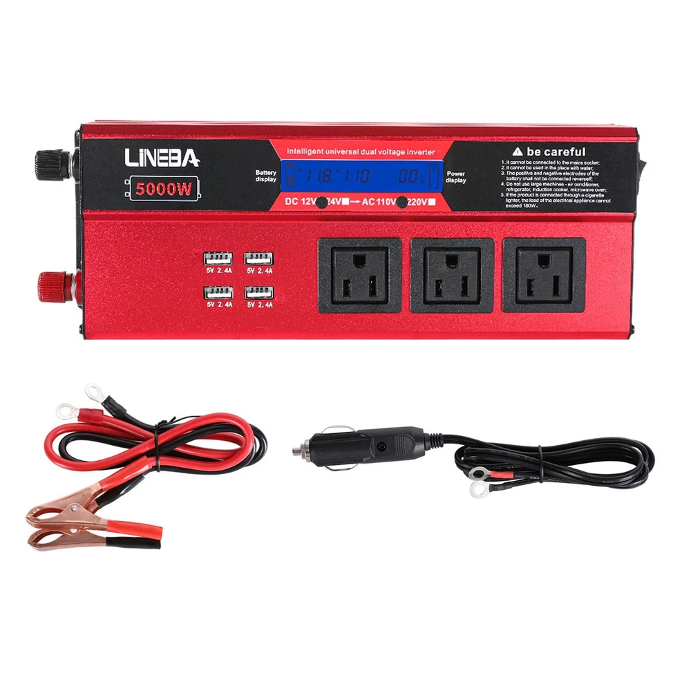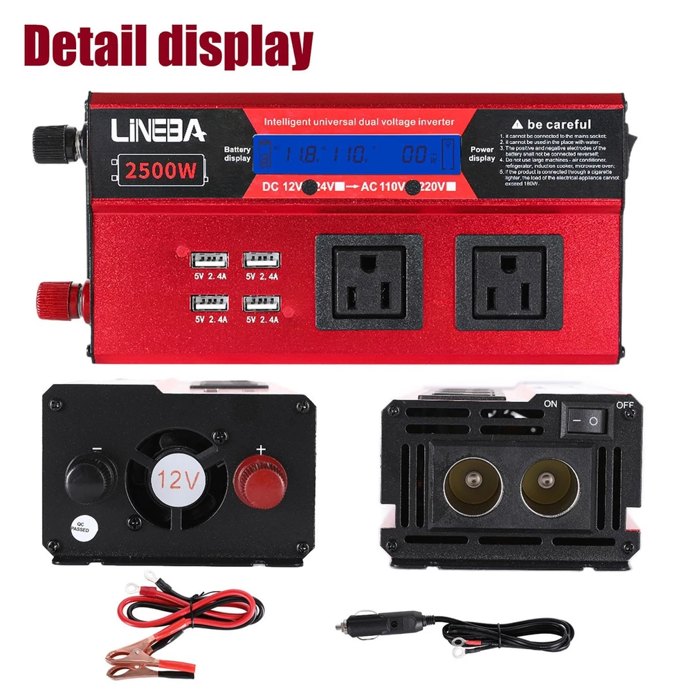 5000W Power Inverter Modified Sine Wave DC 12V to AC 110V Solar Converter 4 USB 5000W Power Inverter Modified Sine Wave DC 12V to AC 110V Solar Converter 4 USB 100% Brand New & Excellent quality ✈️ Free & fast shipping, with tracking number provided ANY PROBLEM please email us before leaving feedback Feature: * 5000W High-power Inverter: Provides 900W continuous modified sine wave power and 5000W peak power. The inverter can convert DC 12V battery power into AC 110V. * 2500W High-power Inverter: Provides 500W continuous modified sine wave power and 2500W peak power. The inverter can convert DC 12V battery power into AC 110V. * 1500W High-power Inverter: Provides 350W continuous modified sine wave power and 1500W peak power. The inverter can convert DC 12V battery power into AC 110V. * 4 USB Charging Ports: The inverter comes with two cigarette lighting holes, three universal socket, four 5V USB charging ports, which can be used to charge multiple machines, manual switch control, very convenient. * Intelligent LED Display: Displays input and output voltages, can monitor battery capacity and load capacity in real time, and easily understands the battery full, normal or empty status. * Built-in Cooling Fan: The inverter has a built-in cooling fan with low noise, comes with a pair of battery cables, is easy to use, and has overvoltage, overload, overcurrent, overheating, and short circuit protection. * Widely Used: Can be used for charging lamps, fans, printers, computers, TVs, DVD players, household appliances, heaters, rice cookers, juicers, hand drills, etc. It is a must-have for self-driving tours, vacation trips, outdoor activities, emergency kits, etc. Specifications: 5000W【3 AC Outlet & 4 USB】 Color: Red Material: Aluminum Alloy Rated Power: 900W Peak Power: 5000W Input voltage: 12V Output voltage: 110V±5% Output frequency: 50Hz Output waveform: Modified sine wave No-load loss: <0.2A Conversion efficiency: >95% Low voltage alarm: 10V±0.2V Low voltage shutdown: 9.5V±0.2V High voltage shutdown: 15.5V±0.2V USB: 5V/2.4A Display: LCD color screen Charging port: 4 USB ports Over-temperature protection: 55°C-75°C Working temperature: 0°C-40°C Product size:280*102*65mm/11.0*4*2.55inch 2500W【2 AC Outlet & 4 USB】 Color: Red Material: Aluminum Alloy Rated Power: 500W Peak Power: 2500W Input voltage: 12V Output voltage: 110V±5% Output frequency: 50Hz Output waveform: Modified sine wave No-load loss: <0.2A Conversion efficiency: >95% Low voltage alarm: 10V±0.2V Low voltage shutdown: 9.5V±0.2V High voltage shutdown: 15.5V±0.2V USB: 5V/2.4A Display: LCD color screen Charging port: 4 USB ports Over-temperature protection: 55°C-75°C Working temperature: 0°C-40°C Product size:235*102*65mm/9.2*4*2.55inch 1500W【1 AC Outlet & 4 USB】 Color: Red Material: Aluminum Alloy Rated Power: 350W Peak Power: 1500W Input voltage: 12V Output voltage: 110V±5% Output frequency: 50Hz Output waveform: Modified sine wave No-load loss: <0.2A Conversion efficiency: >95% Low voltage alarm: 10V±0.2V Low voltage shutdown: 9.5V±0.2V High voltage shutdown: 15.5V±0.2V USB: 5V/2.4A Display: LCD color screen Charging port: 4 USB ports Over-temperature protection: 55°C-75°C Working temperature: 0°C-40°C Product size:185*102*65mm/7.28*4*2.55inch Package include: 1 x Vehicle Inverter 1 x Manual 2 x Clip Wire 1 x Cigarette Lighter Head 1 x Packing Box Payment Shipment Return Feedback Contact us Payment * We Accept Payment via PAYPAL ONLY . * Payment Must be Made within 4 Days of Auction Closing. * Non-Payment may Result in a UPI (Unpaid Item) being Put on Your Account. eBay will Automatically Close Your Account if You Accumulate 4 UPI's total. * Please List Your Special Requests ( Color, Size, Packages, etc. ) in the PAYPAL NOTES SECTION when you make payment. Shipment * Shipping will be handled in 24 business hours after payment got. Ship to PayPal Address only , please confirm it before paying. * Please leave your phone number in the address in case there is an address problem. Return * Returns and Exchange accepted within 60 Days. * Refund will be given as Money Back. * Free Return shipping. * Before you return the defective item,please email us for the RMA, and we will reply you in 24 hours in working days. If you do not get reply please check if your mail box has refused our reply or not, then send to us again, thanks! Feedback If you are satisfied with the transaction please remember to leave us a positive feedback (5-Star) will be much appreciated. Please DO remember to contact us before leaving the neutral (3 stars) , negative feedback (1-2 stars) or opening a case/dispute if any problem caused by the item . Normally your email would get replied within 24 hours on working day and your issue would be followed up carefully until we've reached a consensus! We will try our best to solve the problem and leave you a happy shopping mood here. Thank you! We are not only selling good items, but also selling with excellent after-sale service and a strong sense of responsibility. We will always try our best to find you a satisfactory solution if any problem takes place! Contact us Email muchbuy-outlet at Paypal registered email or ebay message. On Aug 9, 2025 at 19:06:19 PDT, seller added the following information:
