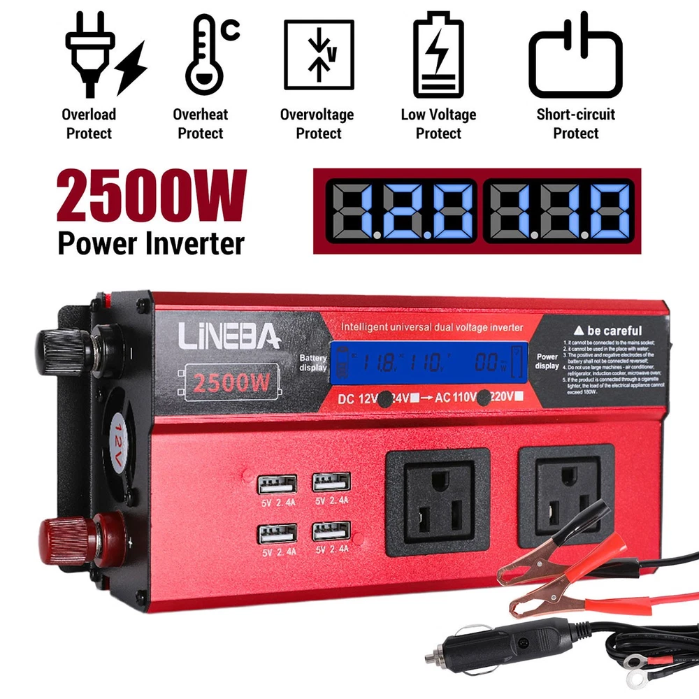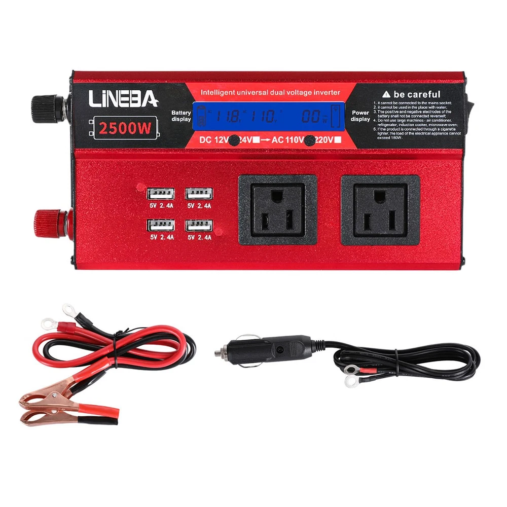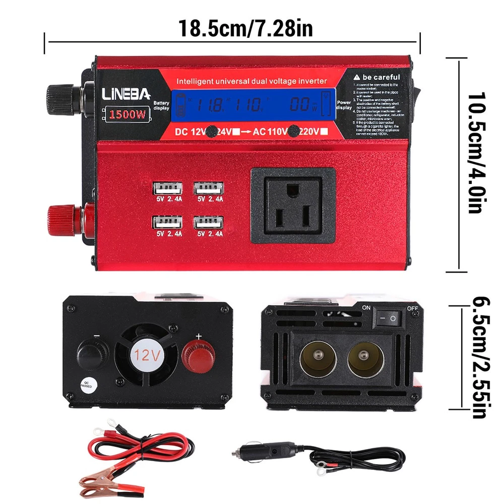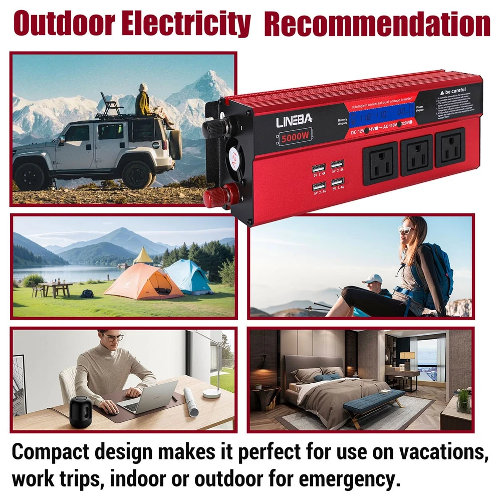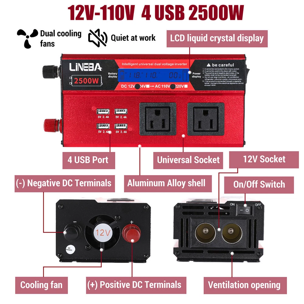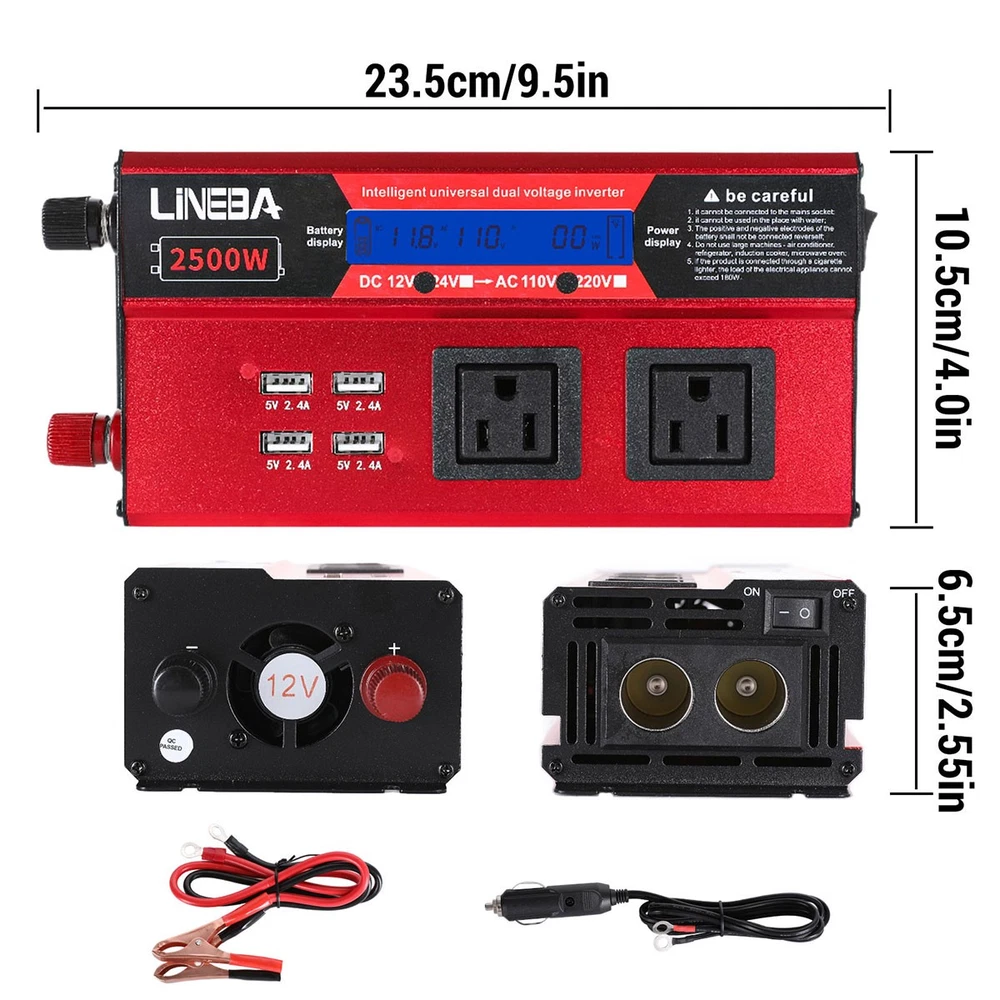 5000W Power Inverter Modified Sine Wave DC 12V to AC 110V Solar Converter 4 USB 5000W Power Inverter Modified Sine Wave DC 12V to AC 110V Solar Converter 4 USB 100% Brand New & Excellent quality ✈️ Free & fast shipping, with tracking number provided ANY PROBLEM please email us before leaving feedback Feature: * 5000W High-power Inverter: Provides 900W continuous modified sine wave power and 5000W peak power. The inverter can convert DC 12V battery power into AC 110V. * 2500W High-power Inverter: Provides 500W continuous modified sine wave power and 2500W peak power. The inverter can convert DC 12V battery power into AC 110V. * 1500W High-power Inverter: Provides 350W continuous modified sine wave power and 1500W peak power. The inverter can convert DC 12V battery power into AC 110V. * 4 USB Charging Ports: The inverter comes with two cigarette lighting holes, three universal socket, four 5V USB charging ports, which can be used to charge multiple machines, manual switch control, very convenient. * Intelligent LED Display: Displays input and output voltages, can monitor battery capacity and load capacity in real time, and easily understands the battery full, normal or empty status. * Built-in Cooling Fan: The inverter has a built-in cooling fan with low noise, comes with a pair of battery cables, is easy to use, and has overvoltage, overload, overcurrent, overheating, and short circuit protection. * Widely Used: Can be used for charging lamps, fans, printers, computers, TVs, DVD players, household appliances, heaters, rice cookers, juicers, hand drills, etc. It is a must-have for self-driving tours, vacation trips, outdoor activities, emergency kits, etc. Specifications: 5000W【3 AC Outlet & 4 USB】 Color: Red Material: Aluminum Alloy Rated Power: 900W Peak Power: 5000W Input voltage: 12V Output voltage: 110V±5% Output frequency: 50Hz Output waveform: Modified sine wave No-load loss: <0.2A Conversion efficiency: >95% Low voltage alarm: 10V±0.2V Low voltage shutdown: 9.5V±0.2V High voltage shutdown: 15.5V±0.2V USB: 5V/2.4A Display: LCD color screen Charging port: 4 USB ports Over-temperature protection: 55°C-75°C Working temperature: 0°C-40°C Product size:280*102*65mm/11.0*4*2.55inch 2500W【2 AC Outlet & 4 USB】 Color: Red Material: Aluminum Alloy Rated Power: 500W Peak Power: 2500W Input voltage: 12V Output voltage: 110V±5% Output frequency: 50Hz Output waveform: Modified sine wave No-load loss: <0.2A Conversion efficiency: >95% Low voltage alarm: 10V±0.2V Low voltage shutdown: 9.5V±0.2V High voltage shutdown: 15.5V±0.2V USB: 5V/2.4A Display: LCD color screen Charging port: 4 USB ports Over-temperature protection: 55°C-75°C Working temperature: 0°C-40°C Product size:235*102*65mm/9.2*4*2.55inch 1500W【1 AC Outlet & 4 USB】 Color: Red Material: Aluminum Alloy Rated Power: 350W Peak Power: 1500W Input voltage: 12V Output voltage: 110V±5% Output frequency: 50Hz Output waveform: Modified sine wave No-load loss: <0.2A Conversion efficiency: >95% Low voltage alarm: 10V±0.2V Low voltage shutdown: 9.5V±0.2V High voltage shutdown: 15.5V±0.2V USB: 5V/2.4A Display: LCD color screen Charging port: 4 USB ports Over-temperature protection: 55°C-75°C Working temperature: 0°C-40°C Product size:185*102*65mm/7.28*4*2.55inch Package include: 1 x Vehicle Inverter 1 x Manual 2 x Clip Wire 1 x Cigarette Lighter Head 1 x Packing Box Payment Shipment Return Feedback Contact us Payment * We Accept Payment via PAYPAL ONLY . * Payment Must be Made within 4 Days of Auction Closing. * Non-Payment may Result in a UPI (Unpaid Item) being Put on Your Account. eBay will Automatically Close Your Account if You Accumulate 4 UPI's total. * Please List Your Special Requests ( Color, Size, Packages, etc. ) in the PAYPAL NOTES SECTION when you make payment. Shipment * Shipping will be handled in 24 business hours after payment got. Ship to PayPal Address only , please confirm it before paying. * Please leave your phone number in the address in case there is an address problem. Return * Returns and Exchange accepted within 60 Days. * Refund will be given as Money Back. * Free Return shipping. * Before you return the defective item,please email us for the RMA, and we will reply you in 24 hours in working days. If you do not get reply please check if your mail box has refused our reply or not, then send to us again, thanks! Feedback If you are satisfied with the transaction please remember to leave us a positive feedback (5-Star) will be much appreciated. Please DO remember to contact us before leaving the neutral (3 stars) , negative feedback (1-2 stars) or opening a case/dispute if any problem caused by the item . Normally your email would get replied within 24 hours on working day and your issue would be followed up carefully until we've reached a consensus! We will try our best to solve the problem and leave you a happy shopping mood here. Thank you! We are not only selling good items, but also selling with excellent after-sale service and a strong sense of responsibility. We will always try our best to find you a satisfactory solution if any problem takes place! Contact us Email muchbuy-outlet at Paypal registered email or ebay message. On Aug 9, 2025 at 19:06:19 PDT, seller added the following information: