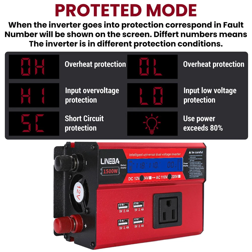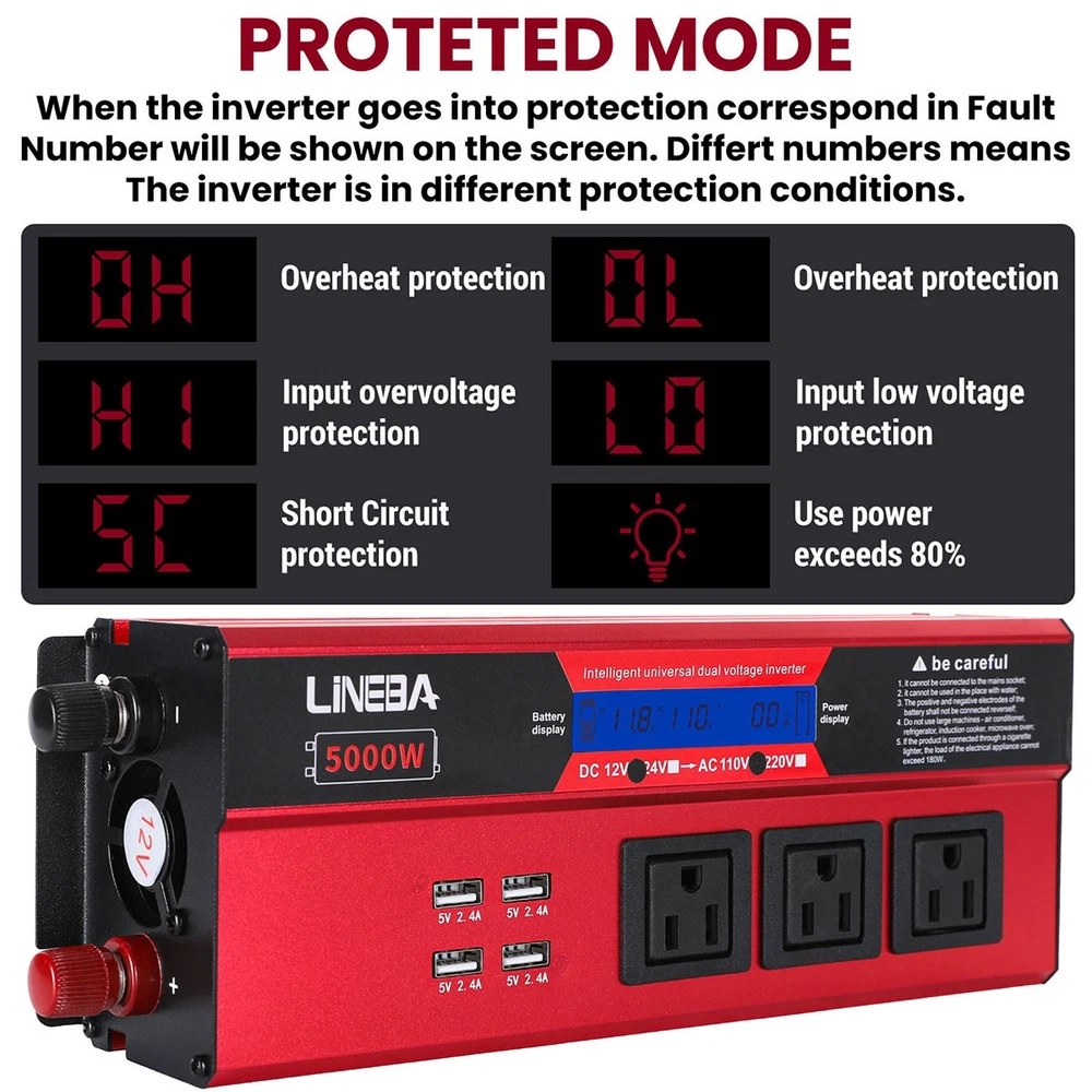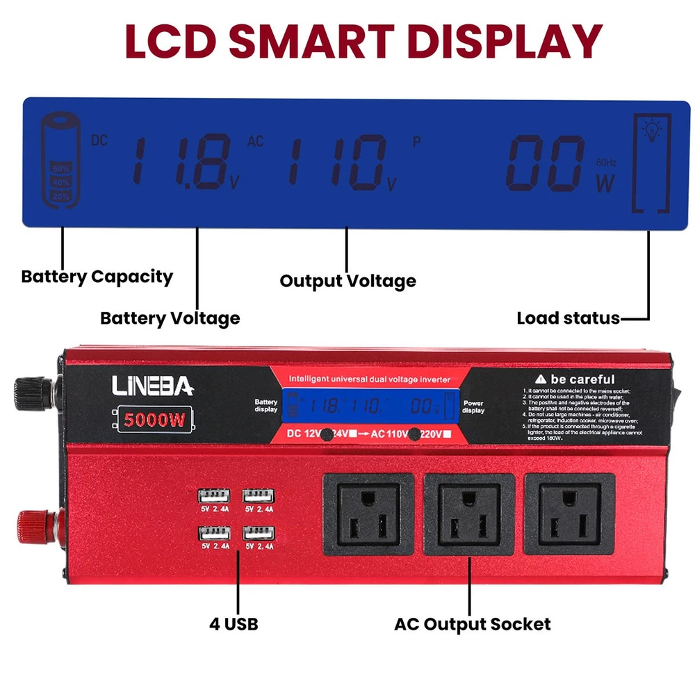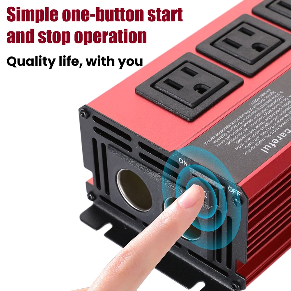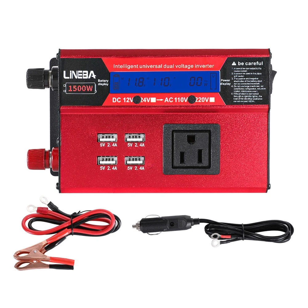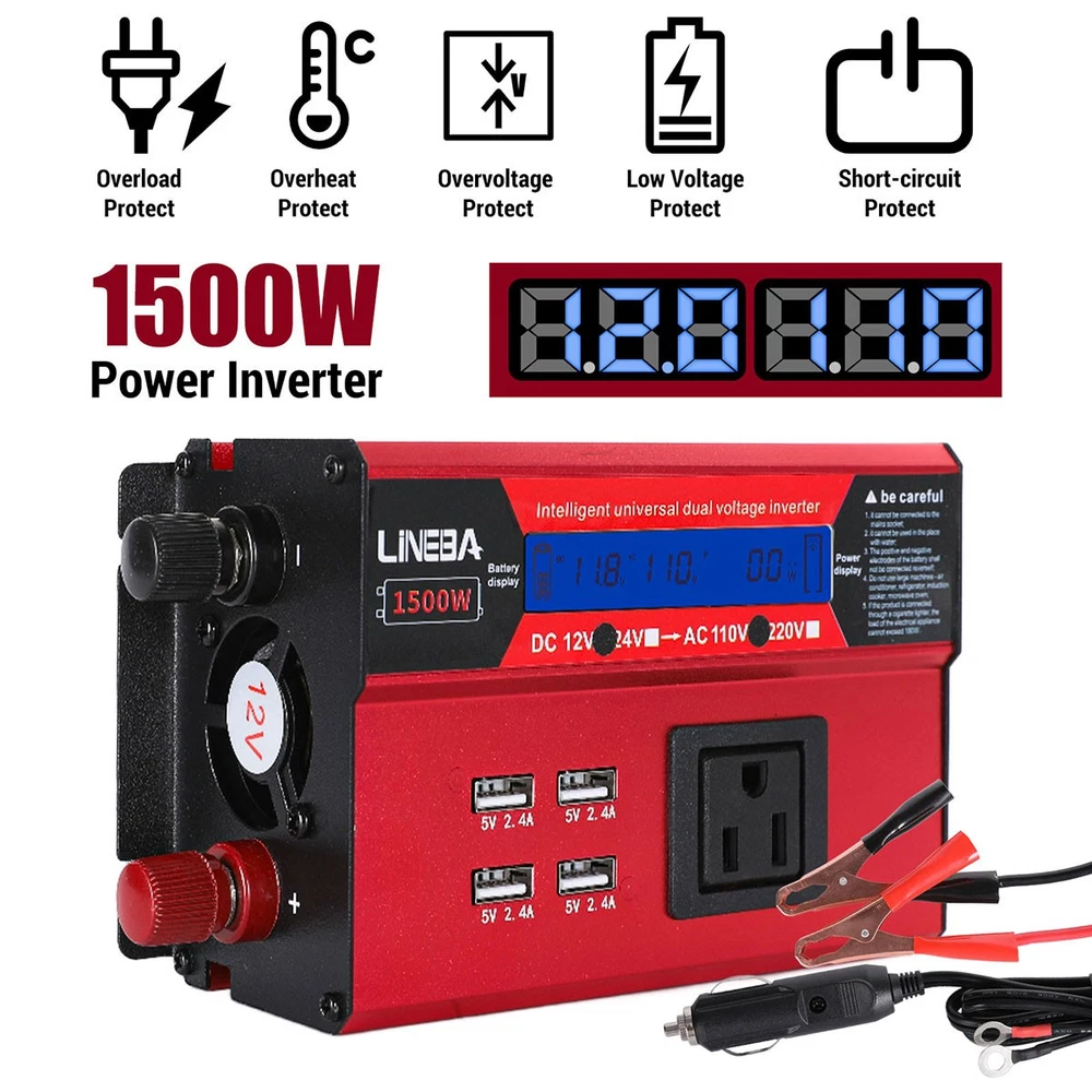 5000W Power Inverter Modified Sine Wave DC 12V to AC 110V Solar Converter 4 USB 5000W Power Inverter Modified Sine Wave DC 12V to AC 110V Solar Converter 4 USB 100% Brand New & Excellent quality ✈️ Free & fast shipping, with tracking number provided ANY PROBLEM please email us before leaving feedback Feature: * 5000W High-power Inverter: Provides 900W continuous modified sine wave power and 5000W peak power. The inverter can convert DC 12V battery power into AC 110V. * 2500W High-power Inverter: Provides 500W continuous modified sine wave power and 2500W peak power. The inverter can convert DC 12V battery power into AC 110V. * 1500W High-power Inverter: Provides 350W continuous modified sine wave power and 1500W peak power. The inverter can convert DC 12V battery power into AC 110V. * 4 USB Charging Ports: The inverter comes with two cigarette lighting holes, three universal socket, four 5V USB charging ports, which can be used to charge multiple machines, manual switch control, very convenient. * Intelligent LED Display: Displays input and output voltages, can monitor battery capacity and load capacity in real time, and easily understands the battery full, normal or empty status. * Built-in Cooling Fan: The inverter has a built-in cooling fan with low noise, comes with a pair of battery cables, is easy to use, and has overvoltage, overload, overcurrent, overheating, and short circuit protection. * Widely Used: Can be used for charging lamps, fans, printers, computers, TVs, DVD players, household appliances, heaters, rice cookers, juicers, hand drills, etc. It is a must-have for self-driving tours, vacation trips, outdoor activities, emergency kits, etc. Specifications: 5000W【3 AC Outlet & 4 USB】 Color: Red Material: Aluminum Alloy Rated Power: 900W Peak Power: 5000W Input voltage: 12V Output voltage: 110V±5% Output frequency: 50Hz Output waveform: Modified sine wave No-load loss: <0.2A Conversion efficiency: >95% Low voltage alarm: 10V±0.2V Low voltage shutdown: 9.5V±0.2V High voltage shutdown: 15.5V±0.2V USB: 5V/2.4A Display: LCD color screen Charging port: 4 USB ports Over-temperature protection: 55°C-75°C Working temperature: 0°C-40°C Product size:280*102*65mm/11.0*4*2.55inch 2500W【2 AC Outlet & 4 USB】 Color: Red Material: Aluminum Alloy Rated Power: 500W Peak Power: 2500W Input voltage: 12V Output voltage: 110V±5% Output frequency: 50Hz Output waveform: Modified sine wave No-load loss: <0.2A Conversion efficiency: >95% Low voltage alarm: 10V±0.2V Low voltage shutdown: 9.5V±0.2V High voltage shutdown: 15.5V±0.2V USB: 5V/2.4A Display: LCD color screen Charging port: 4 USB ports Over-temperature protection: 55°C-75°C Working temperature: 0°C-40°C Product size:235*102*65mm/9.2*4*2.55inch 1500W【1 AC Outlet & 4 USB】 Color: Red Material: Aluminum Alloy Rated Power: 350W Peak Power: 1500W Input voltage: 12V Output voltage: 110V±5% Output frequency: 50Hz Output waveform: Modified sine wave No-load loss: <0.2A Conversion efficiency: >95% Low voltage alarm: 10V±0.2V Low voltage shutdown: 9.5V±0.2V High voltage shutdown: 15.5V±0.2V USB: 5V/2.4A Display: LCD color screen Charging port: 4 USB ports Over-temperature protection: 55°C-75°C Working temperature: 0°C-40°C Product size:185*102*65mm/7.28*4*2.55inch Package include: 1 x Vehicle Inverter 1 x Manual 2 x Clip Wire 1 x Cigarette Lighter Head 1 x Packing Box Payment Shipment Return Feedback Contact us Payment * We Accept Payment via PAYPAL ONLY . * Payment Must be Made within 4 Days of Auction Closing. * Non-Payment may Result in a UPI (Unpaid Item) being Put on Your Account. eBay will Automatically Close Your Account if You Accumulate 4 UPI's total. * Please List Your Special Requests ( Color, Size, Packages, etc. ) in the PAYPAL NOTES SECTION when you make payment. Shipment * Shipping will be handled in 24 business hours after payment got. Ship to PayPal Address only , please confirm it before paying. * Please leave your phone number in the address in case there is an address problem. Return * Returns and Exchange accepted within 60 Days. * Refund will be given as Money Back. * Free Return shipping. * Before you return the defective item,please email us for the RMA, and we will reply you in 24 hours in working days. If you do not get reply please check if your mail box has refused our reply or not, then send to us again, thanks! Feedback If you are satisfied with the transaction please remember to leave us a positive feedback (5-Star) will be much appreciated. Please DO remember to contact us before leaving the neutral (3 stars) , negative feedback (1-2 stars) or opening a case/dispute if any problem caused by the item . Normally your email would get replied within 24 hours on working day and your issue would be followed up carefully until we've reached a consensus! We will try our best to solve the problem and leave you a happy shopping mood here. Thank you! We are not only selling good items, but also selling with excellent after-sale service and a strong sense of responsibility. We will always try our best to find you a satisfactory solution if any problem takes place! Contact us Email muchbuy-outlet at Paypal registered email or ebay message. On Aug 9, 2025 at 19:06:19 PDT, seller added the following information: