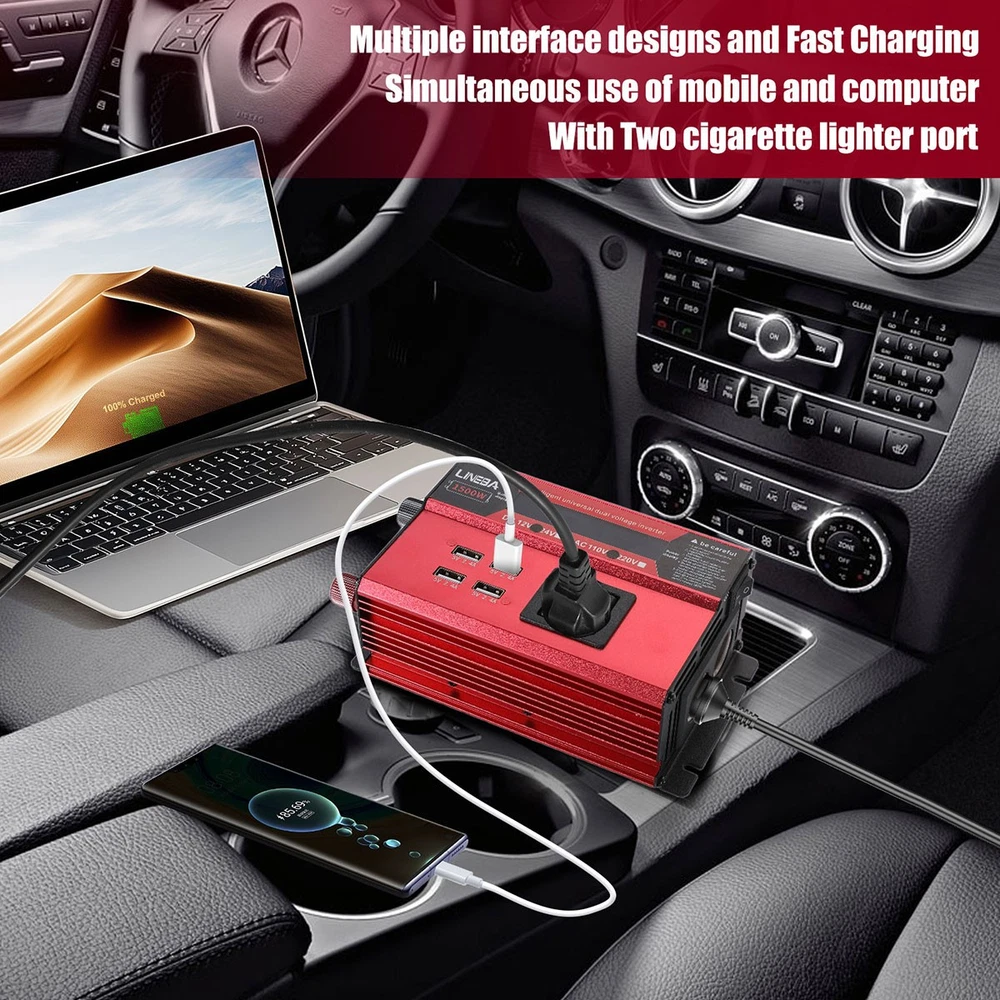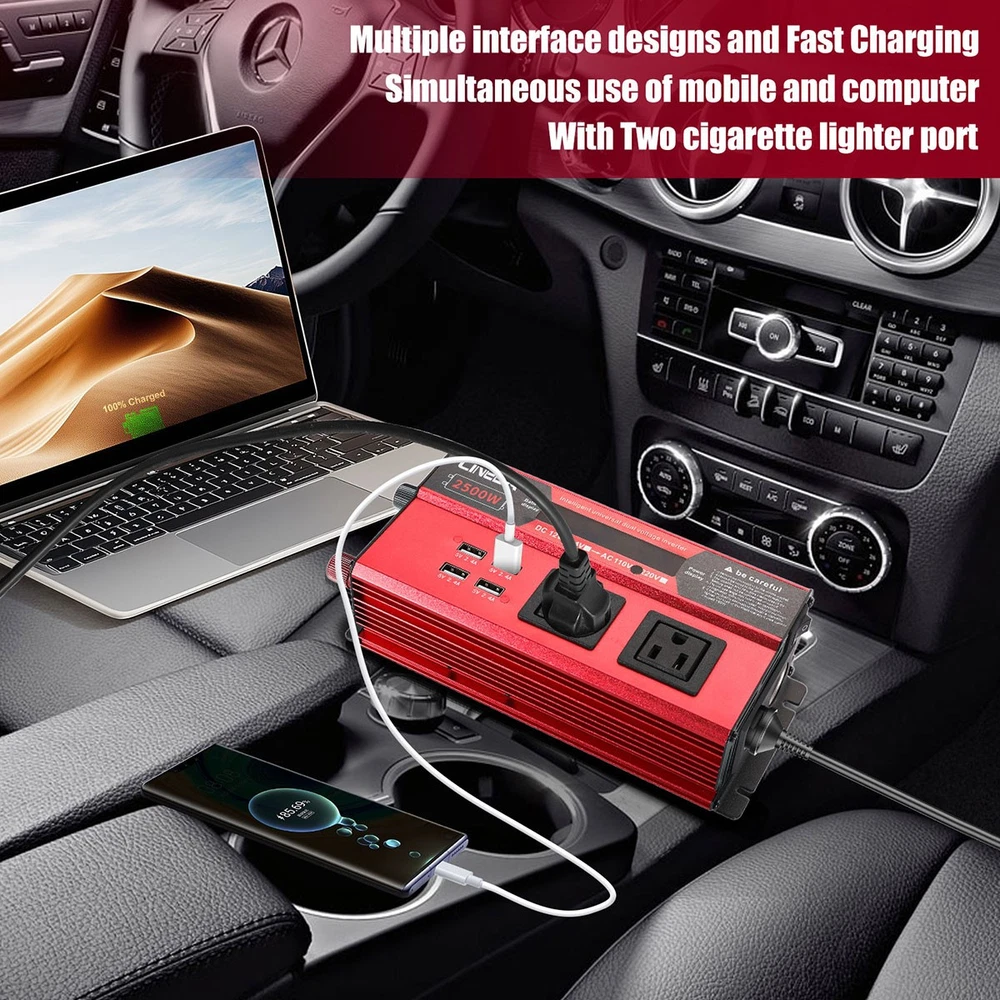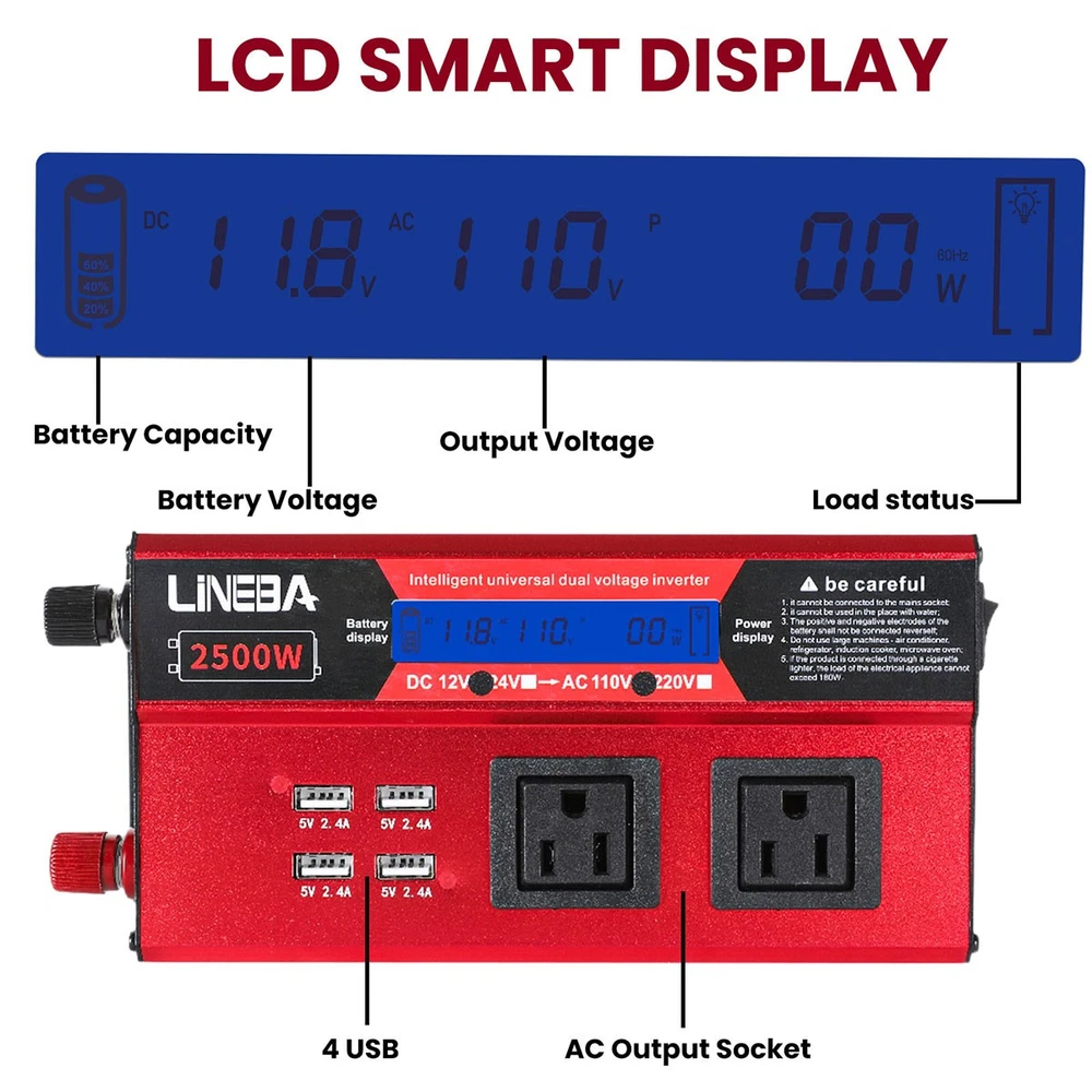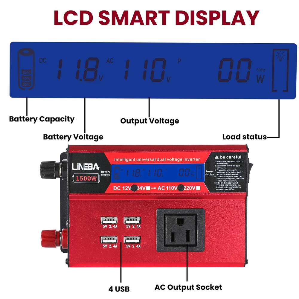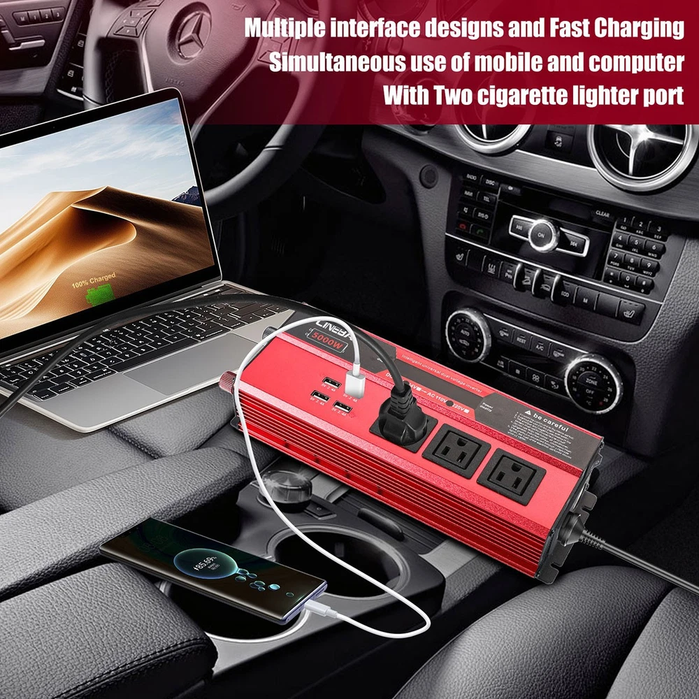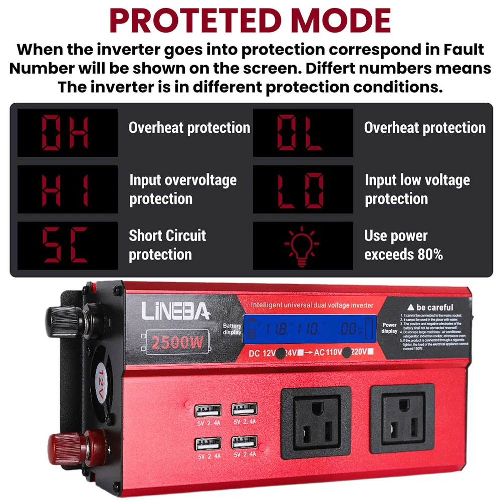 5000W Power Inverter Modified Sine Wave DC 12V to AC 110V Solar Converter 4 USB 5000W Power Inverter Modified Sine Wave DC 12V to AC 110V Solar Converter 4 USB 100% Brand New & Excellent quality ✈️ Free & fast shipping, with tracking number provided ANY PROBLEM please email us before leaving feedback Feature: * 5000W High-power Inverter: Provides 900W continuous modified sine wave power and 5000W peak power. The inverter can convert DC 12V battery power into AC 110V. * 2500W High-power Inverter: Provides 500W continuous modified sine wave power and 2500W peak power. The inverter can convert DC 12V battery power into AC 110V. * 1500W High-power Inverter: Provides 350W continuous modified sine wave power and 1500W peak power. The inverter can convert DC 12V battery power into AC 110V. * 4 USB Charging Ports: The inverter comes with two cigarette lighting holes, three universal socket, four 5V USB charging ports, which can be used to charge multiple machines, manual switch control, very convenient. * Intelligent LED Display: Displays input and output voltages, can monitor battery capacity and load capacity in real time, and easily understands the battery full, normal or empty status. * Built-in Cooling Fan: The inverter has a built-in cooling fan with low noise, comes with a pair of battery cables, is easy to use, and has overvoltage, overload, overcurrent, overheating, and short circuit protection. * Widely Used: Can be used for charging lamps, fans, printers, computers, TVs, DVD players, household appliances, heaters, rice cookers, juicers, hand drills, etc. It is a must-have for self-driving tours, vacation trips, outdoor activities, emergency kits, etc. Specifications: 5000W【3 AC Outlet & 4 USB】 Color: Red Material: Aluminum Alloy Rated Power: 900W Peak Power: 5000W Input voltage: 12V Output voltage: 110V±5% Output frequency: 50Hz Output waveform: Modified sine wave No-load loss: <0.2A Conversion efficiency: >95% Low voltage alarm: 10V±0.2V Low voltage shutdown: 9.5V±0.2V High voltage shutdown: 15.5V±0.2V USB: 5V/2.4A Display: LCD color screen Charging port: 4 USB ports Over-temperature protection: 55°C-75°C Working temperature: 0°C-40°C Product size:280*102*65mm/11.0*4*2.55inch 2500W【2 AC Outlet & 4 USB】 Color: Red Material: Aluminum Alloy Rated Power: 500W Peak Power: 2500W Input voltage: 12V Output voltage: 110V±5% Output frequency: 50Hz Output waveform: Modified sine wave No-load loss: <0.2A Conversion efficiency: >95% Low voltage alarm: 10V±0.2V Low voltage shutdown: 9.5V±0.2V High voltage shutdown: 15.5V±0.2V USB: 5V/2.4A Display: LCD color screen Charging port: 4 USB ports Over-temperature protection: 55°C-75°C Working temperature: 0°C-40°C Product size:235*102*65mm/9.2*4*2.55inch 1500W【1 AC Outlet & 4 USB】 Color: Red Material: Aluminum Alloy Rated Power: 350W Peak Power: 1500W Input voltage: 12V Output voltage: 110V±5% Output frequency: 50Hz Output waveform: Modified sine wave No-load loss: <0.2A Conversion efficiency: >95% Low voltage alarm: 10V±0.2V Low voltage shutdown: 9.5V±0.2V High voltage shutdown: 15.5V±0.2V USB: 5V/2.4A Display: LCD color screen Charging port: 4 USB ports Over-temperature protection: 55°C-75°C Working temperature: 0°C-40°C Product size:185*102*65mm/7.28*4*2.55inch Package include: 1 x Vehicle Inverter 1 x Manual 2 x Clip Wire 1 x Cigarette Lighter Head 1 x Packing Box Payment Shipment Return Feedback Contact us Payment * We Accept Payment via PAYPAL ONLY . * Payment Must be Made within 4 Days of Auction Closing. * Non-Payment may Result in a UPI (Unpaid Item) being Put on Your Account. eBay will Automatically Close Your Account if You Accumulate 4 UPI's total. * Please List Your Special Requests ( Color, Size, Packages, etc. ) in the PAYPAL NOTES SECTION when you make payment. Shipment * Shipping will be handled in 24 business hours after payment got. Ship to PayPal Address only , please confirm it before paying. * Please leave your phone number in the address in case there is an address problem. Return * Returns and Exchange accepted within 60 Days. * Refund will be given as Money Back. * Free Return shipping. * Before you return the defective item,please email us for the RMA, and we will reply you in 24 hours in working days. If you do not get reply please check if your mail box has refused our reply or not, then send to us again, thanks! Feedback If you are satisfied with the transaction please remember to leave us a positive feedback (5-Star) will be much appreciated. Please DO remember to contact us before leaving the neutral (3 stars) , negative feedback (1-2 stars) or opening a case/dispute if any problem caused by the item . Normally your email would get replied within 24 hours on working day and your issue would be followed up carefully until we've reached a consensus! We will try our best to solve the problem and leave you a happy shopping mood here. Thank you! We are not only selling good items, but also selling with excellent after-sale service and a strong sense of responsibility. We will always try our best to find you a satisfactory solution if any problem takes place! Contact us Email muchbuy-outlet at Paypal registered email or ebay message. On Aug 9, 2025 at 19:06:19 PDT, seller added the following information: