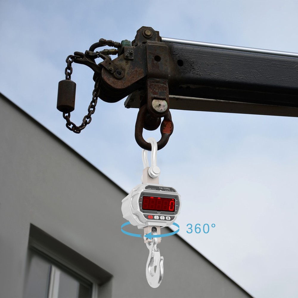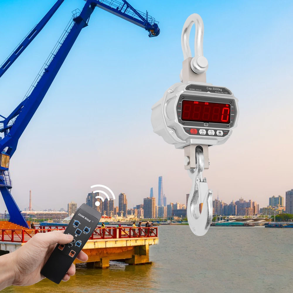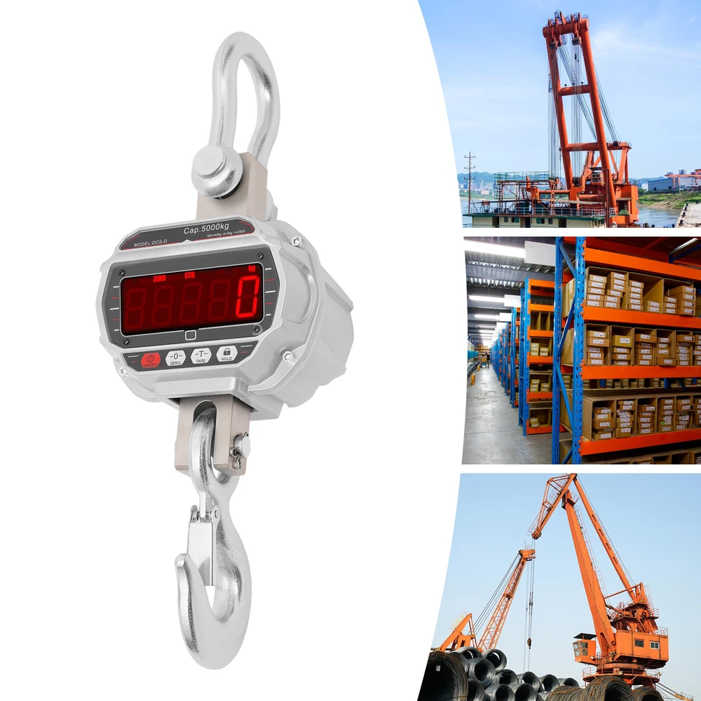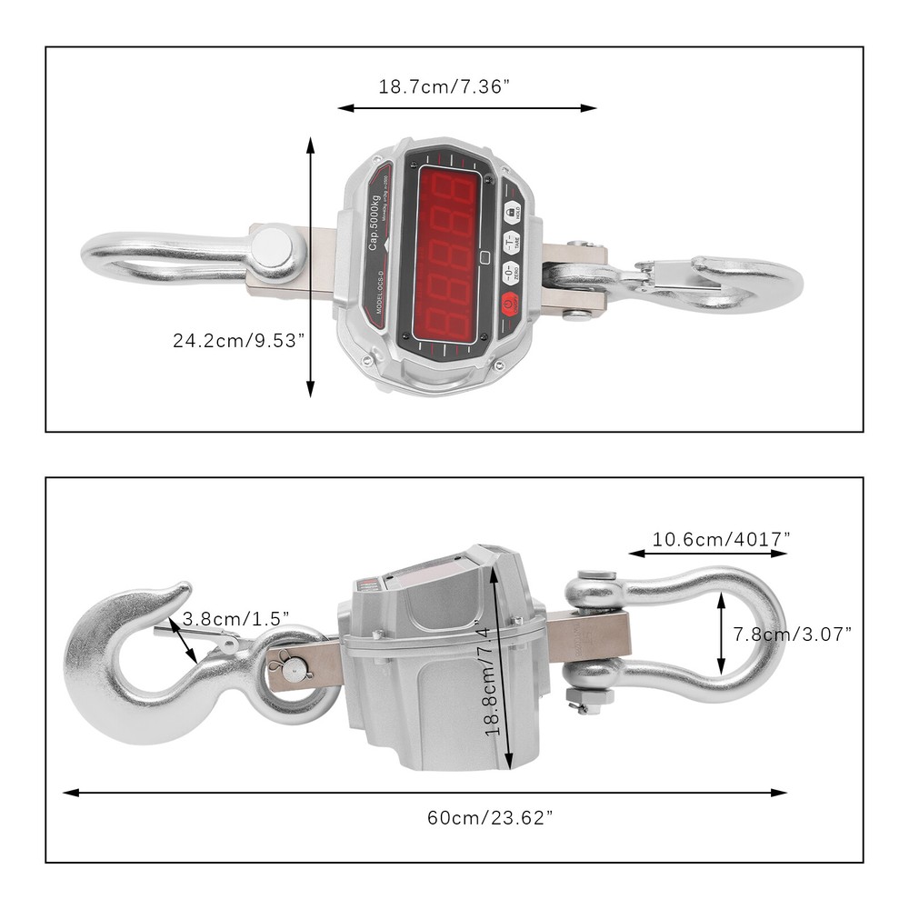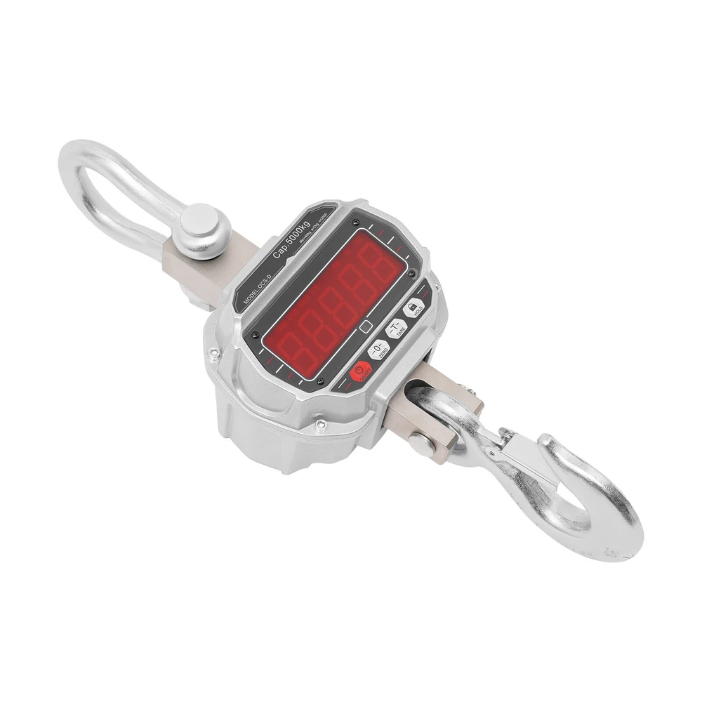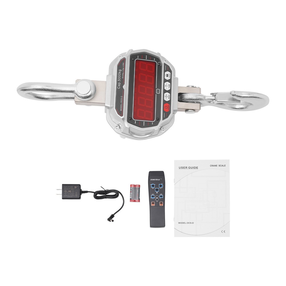 5000kg/11000lbs Aluminum Hanging Weight Digital Scale +Infrared Remote Control E lectronic C rane S cale, Digital Hanging Scale, Industrial Crane Hanging Scale Description This electronic crane scale is made of high-quality materials for rugged durability. The one-piece alloy steel sensor provides you with accurate and precise measurements. Equipped with a high-definition LED display and remote control, it is convenient for you to operate. In addition, it has a strong load-bearing capacity and easy-to-use procedure, which greatly facilitates our lives. This is a product that you should buy with confidence and is a good helper in weighing. Key Features Build to Last: It is made of alloy aluminum and alloy steel, which is strong, durable, wear- resistant , wate rproof, and can ensure long-term use. Accurate Weighing : This electronic crane scale uses an integral alloy steel sensor to provide you with precise and accurate weighing. By pressing the "Tare" button, the weight of the container is subtracted, making it easy to get an accurate reading of the item, which is especially handy when weighing liquids or powders. Superior Weighing Capacity : It is equipped with alloy steel hooks and can weigh up to 11023lbs, which can meet your daily weighing needs. Integrated Design : The electronic crane scale adopts the integrated design of a lifting ring, sensor, and hook, which not only saves the trouble of installation but also is easy to operate and improves stability. Ultra-long Battery Life : This product is powered by a 6V, 4Ah rechargeable battery, which can be fully charged in about 10 hours, providing 60-100 hours of ultra-long battery life, which is convenient for your daily use. Easy to Use: The display has markings for On/Off, Zero, Tare, and Hold, which can be done by simply pressing the buttons. In addition, the electronic crane scale is equipped with a remote control, which can be operated from a distance. Comprehensive Function : The crane scale has the functions of zeroing, tare, display value hold, voltage display, overload warning, automatic shutdown, and unit switching. Such a complete range of functions can meet most of your work requirements. Ideal Gift : This product is practical and has a simple and generous appearance, you can give it as a Christmas gift or housewarming gift to your friends, family, or colleagues. Protective Package: To prevent the product from being damaged during transportation, we packed it with a sponge to protect your products to the maximum extent possible. Details LED Display : This product features a large LED display that makes it easy to read the numbers even from a distance. Lifting Ring: It makes the scale body more durable and ensures its carrying capacity. Hook : The hook has a snap-on design, which can hold the item well and prevent the item from slipping. Application It can be used in a wide range of applications such as daily weighing, factories, workshops, places of trade, farms or construction sites, or other heavy-duty work. Specifications Model: OCS-D Material: Alloy Aluminum, Alloy Steel Color: Silver, Red Style: Modern Display Type: LED Adapter Model: XSC-1401000S Input: 100-240V-50/60Hz 0.4A Output: 14V——1000mA Remote Battery Type: 2*AAA Batteries (Included) Scale Battery: 6V 4Ah Tare Range: 100% F.S. Zeroing Range: 4% F.S. Safe Load: 120% F.S. Ultimate Load: 400%F.S. Overload Warning Value: 100%F.S.+9e Temperature Range: -10°C~40°C/14°F-104°F Charge Time: About 10 Hours Endurance Time: 60-100 Hours Indexing Value: 2kg/4.41lbs Indexing Number: 2500 Maximum Weighing: 5000 kg/11023lbs Minimum Weighing: 40kg/88.2lbs Product Overall Size: 24.2*18.8*60cm/9.53*7.4*23.62in Upper Ring Size: 7.8*10.6cm/3.07*4.17in Lower Hook Opening Size: 3.8cm/1.5in Gross Weight: 16.5kg/36.4lbs Package Size: 65*39*26cm/25.6*15.4*10.2in Package Included 1*Electronic Crane Scale 1*Remote Control 1*Adapter 2*AAA Batteries 1*English Manual Notes For daily use, please make sure that the product is not subject to heavy impact or dropping. Please allow the slight color difference caused by the shooting light and 1-3cm error due to manual measurement, and make sure you do not mind before you order. Payment Delivery details Terms of sales About us Contact us Payment We accept ebay payment 。 Fees such as import duties, taxes are not included in the item price or shipping costs. These charges are the buyer's responsibility. Delivery details Shipping: 2-9 working days to: USA Terms of sales We maintain high standards of excellence and strive for hundred percent customer satisfaction. Feedback is very important to us. We hope that you contact us immediately before you give neutral or negative feedback, so that we can address your concerns. It is impossible to address issues if we do not know about them! About us Your satis faction is our ultimate goal. We work hard to earn your trust and future business. Our certified technicians have tested each item before shipping. The unit comes with 1 year limited warranty on all manufacturing defects. a) If you receive a defective item, you may return it or ask for a discount. Please contact us within 14 days after you receive the package. b) What you returned must be intact and in its original packaging as re? u. Customer is responsible for shipping costs of the returned item. c) We will cover the cost of shipping back t with the shipping rate indicated in the registration page. We will send you a new unit or refund the full payment you paid. Thank you. Contact us Business Hour Business Hour: Monday To Friday: 8:30 AM to 5:00 PM (Beijing China time) Due to time zones, our reply to your questions may not be immediately. But within above working time, we will reply your email within 24 hours. If it's non-workdays, please kindly be patient and wait till Monday. Please contact us with ebay message. Please feel free to contact us if you have any questions. Monday To Friday: 8:30 AM to 5:00 PM (Beijing China time) Due to time z