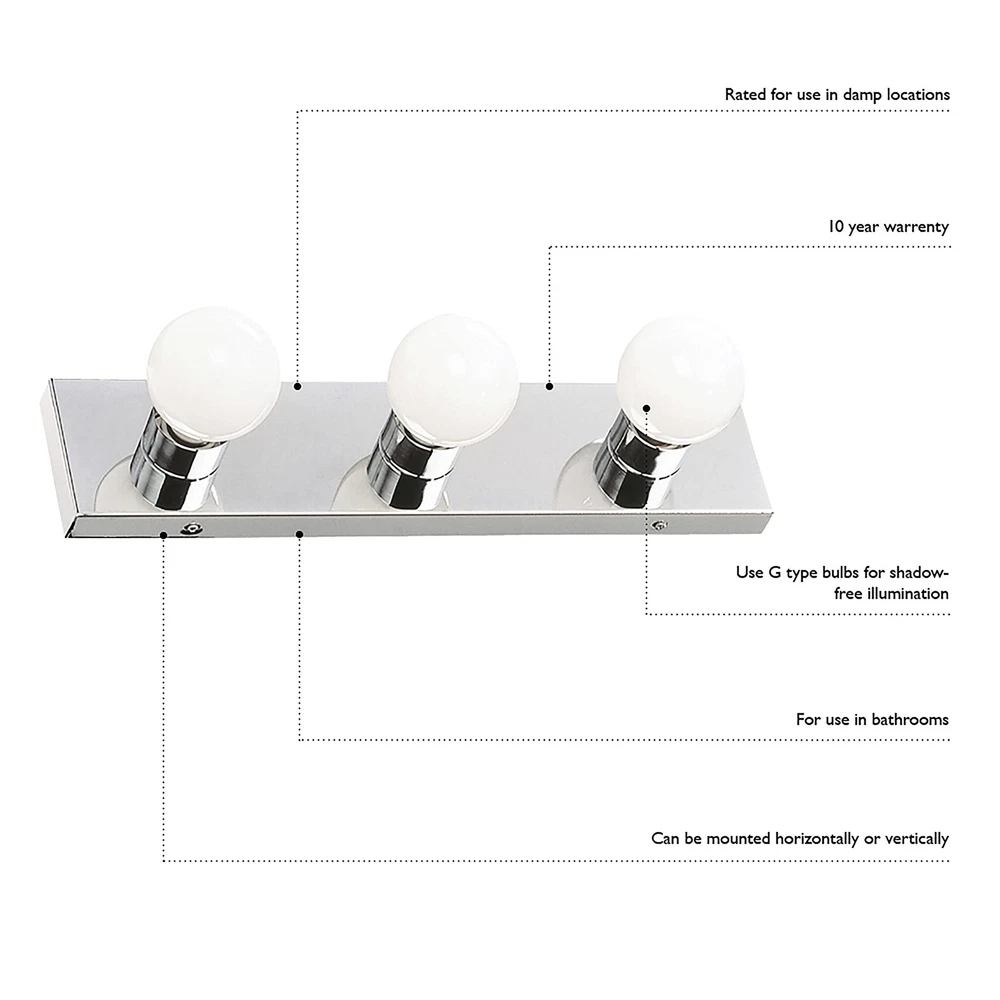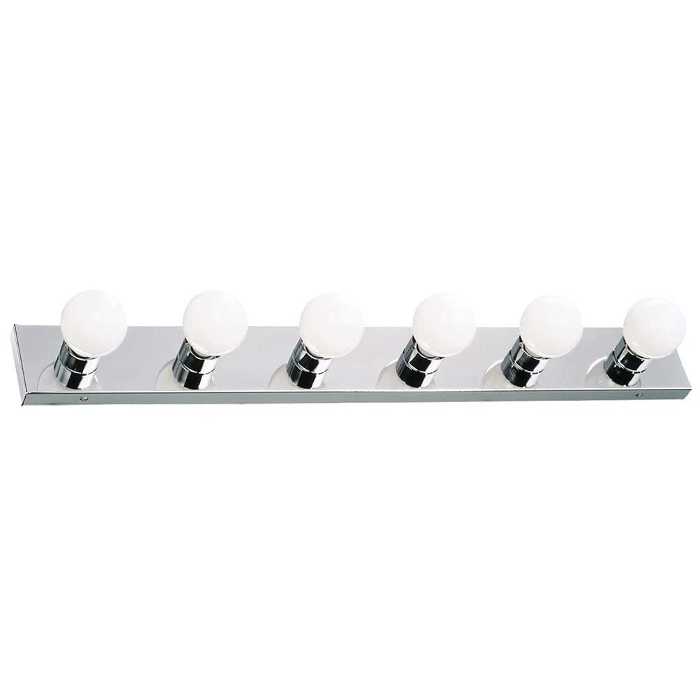 Product Description The 500942 6-Light Vanity Light illuminates your bathroom with its timeless configuration and bright aesthetics. This fixture is constructed of formed steel with a polished chrome finish and uses (6) 60-watt medium base incandescent bulbs. This wall mount's petite design mounts seamlessly to the wall without a chain or visible wires. This fixture can easily be paired with traditional furnishings and mimics the classic Hollywood design. Measuring 4.3-inches (H) by 36-inches (W), this 3.25-pound vanity can be mounted facing up or down depending on location and preference. This vanity is UL listed, cUL listed and approved for damp areas and is for 120-volts. Coordinate your home with the rest of fixtures and furnishings. The 500942 6-Light Vanity comes with a 10-year limited that protects against defects in materials and workmanship. offers products in multiple home decor categories including lighting, ceiling fans, hardware and plumbing products. With years of hands-on experience, understands every aspect of the home decor industry, and devotes itself to providing quality products across the home decor spectrum. Providing value to their customers, uses industry leading merchandising solutions and innovative programs. is committed to providing high quality products for your home improvement projects.Light Bulb Base Code:E26.Features: Ambient Light,No Additional Features From the Manufacturer The Village Collection's easy lines fit any space and budget. The polished chrome finish will go with any décor. IDEAL FOR bathrooms, bedrooms, spa areas, and more, this modern wall light has a sleek polished chrome finish and exposed bulbs USES (6) 60 Watt Medium base bulbs or LED equivalent (Not included).Light Bulb Base Code:E26 DIMMABLE: Designed to be dimmable when used with a dimmer switch (not included); allowing you to adjust the preferred light brightness UL Listed for use in Damp Locations