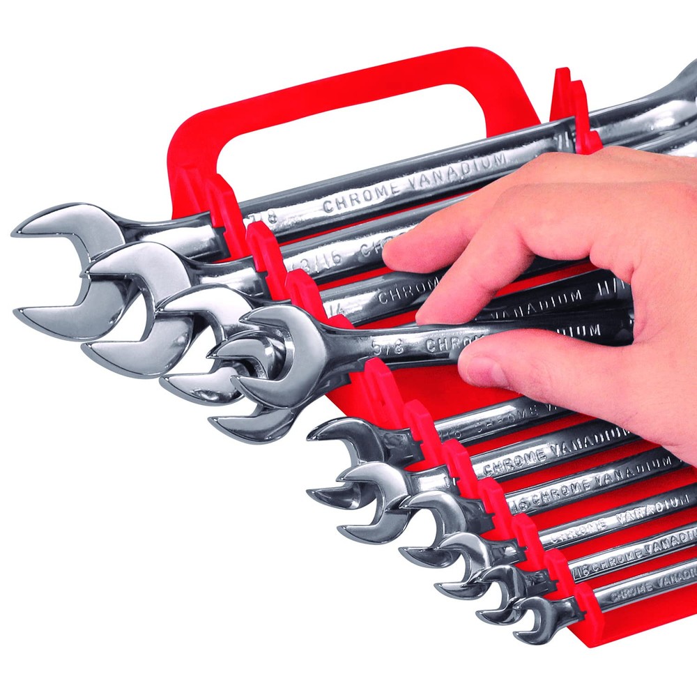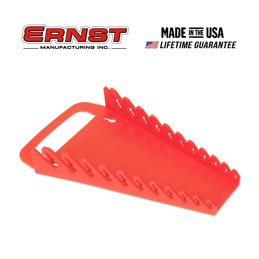 Product Description The Ernst 11-tool Gripper Wrench Organizer helps you organize your wrenches and securely transport wrenches to the job site. This superior organizer provides the ultimate in tool box storage. It holds 1/4-inch to 7/8-inch and 6 mm to 16 mm wrenches and allows for immediate recognition of a missing wrench. While holding wrenches secure for transportation, it also allows for easy -handed engagement and removal of wrenches. The Ernst Wrench Gripper series offers versatility, as you can hang the product on walls, pegboard, even the side of your mobile tool cart using the Vertical Cart Mount Kit. It also features a folding space saver handle. The soft, non-marring material is fuel and solvent resistant. Made in the USA. Tools not included. From the Manufacturer The Ernst 11-tool Gripper Wrench Organizer helps you organize your wrenches and securely transport wrenches to the job site. This superior organizer provides the ultimate in tool box storage. It holds 1/4-Inch to 7/8-Inch and 6 mm to 16 mm wrenches and allows for immediate recognition of a missing wrench. While holding wrenches secure for transportation, it also allows for easy -handed engagement and removal of wrenches. The Ernst Wrench Gripper series offers versatility, as you can hang the product on walls, pegboard, even the side of your mobile tool cart using the Vertical Cart Mount Kit. It also features a folding space saver handle. The soft, non-marring material is fuel and solvent resistant. Made in the USA. . Tools not included. 11-wrench portable organizer Holds 1/4-inch to 7/8-inch and 6 mm to 16 mm wrenches Allows for easy -handed engagement and removal of wrenches Can hang on walls, pegboard, or side of a mobile tool cart using the Vertical Cart Mount Kit