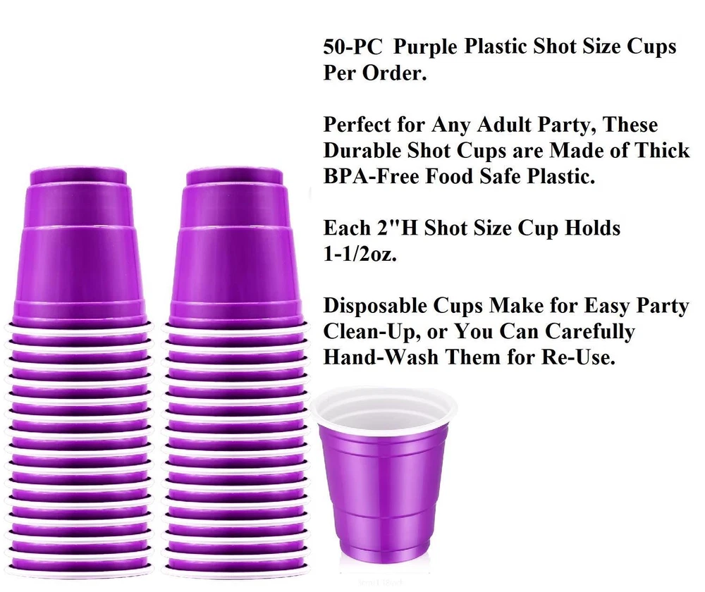 Number of Items: 50 Style: Contemporary Production Technique: Manufactured Vintage: No Occasion: Bachelor Party Holiday Birthday ANY Type: Party Shot Glasses Drinking Cup UPC: 603305317585 Pattern: Solid Character: Shot Glasses, Mini Cups Color: Purple Material: Plastic gtin13: 603305317585 Character Family: Adult Beverage Shots Personalize: No Bundle Description: 50 Pieces Antique: No Brand: NE-AS Features: Disposable, BPA Free, Bulk Set Country/Region of Manufacture: Unknown MPN: ADC-71549, AS-ADC-71550 Origin: Unknown Custom Bundle: No Theme: Any Theme Department: Adults