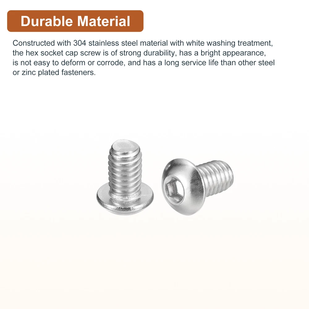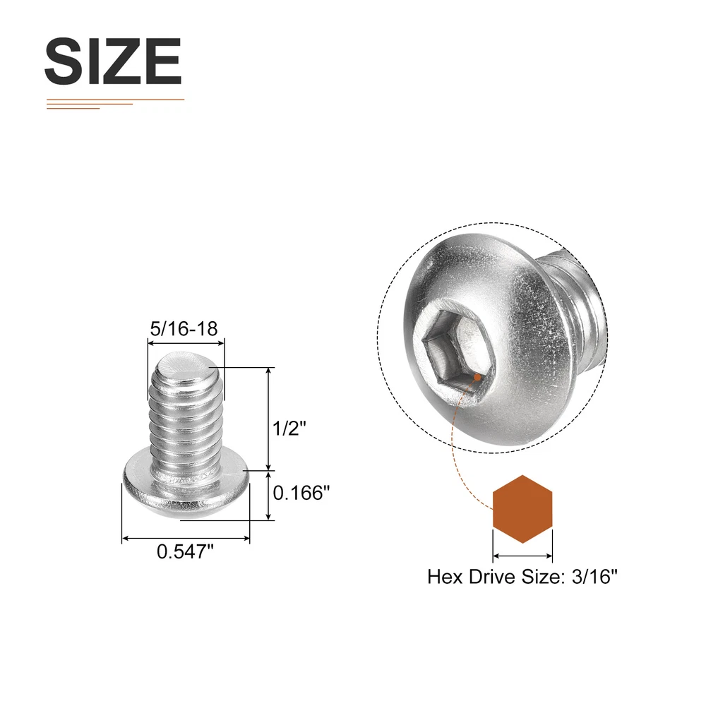 Document Product Details:Color: SilverMaterial: 304 Stainless Steel 18/8Thread Type: Full Thread; UNC ThreadThread Dia: 0.3125inchNumber of Teeth: 18Thread Length: 1/2inchHead Dia.: 0.547inchHead Thickness: 0.166inchPackage Content: 50pcs x Button Head Hex Socket ScrewsMaterial - Constructed with 304 stainless steel material with white washing treatment, the hex socket cap screw is of strong durability, has a bright appearance, is not easy to deform or corrode, and has a long service life than other steel or zinc plated fasteners.Feature - The button socket head cap screw is designed with an inner hex drive style and pan head, providing a higher torque and clamping force, as well as offering a wider bearing surface and high tensile strength. Application - Good replacement parts and construction fasteners for use in most machinery industries, automotive industries, electronics industries, manufacturing applications, die fixtures, and clamps.Installation - To access this hex drive screw, you will need to use a hex wrench to tighten or loosen. The socket button head design enhances torque capabilities, allowing for greater clamping force. For optimal results, it is recommended to use a retaining washer to securely lock the hex drive in place. 50PCS 5/16-18x1/2" Button Head Socket Cap Screw Hex Drive Full Thread Fastener Product Details: Color: Silver Material: 304 Stainless Steel 18/8 Thread Type: Full Thread; UNC Thread Thread Dia: 0.3125inch Number of Teeth: 18 Thread Length: 1/2inch Head Dia.: 0.547inch Head Thickness: 0.166inch Package Content: 50pcs x Button Head Hex Socket Screws Material - Constructed with 304 stainless steel material with white washing treatment, the hex socket cap screw is of strong durability, has a bright appearance, is not easy to deform or corrode, and has a long service life than other steel or zinc plated fasteners. Feature - The button socket head cap screw is designed with an inner hex drive style and pan head, providing a higher torque and clamping force, as well as offering a wider bearing surface and high tensile strength. Application - Good replacement parts and construction fasteners for use in most machinery industries, automotive industries, electronics industries, manufacturing applications, die fixtures, and clamps. Installation - To access this hex drive screw, you will need to use a hex wrench to tighten or loosen. The socket button head design enhances torque capabilities, allowing for greater clamping force. For optimal results, it is recommended to use a retaining washer to securely lock the hex drive in place. Hot Item Payment 1.We accept eBay payment . 2.Payment must be received within 7 business days of auction closing. Shipping 1.We ship to your eBay or Paypal address. Please make sure your eBay and Paypal address is correct before you pay. 2.Items will be shipped within 1-3 business day when we received payment. 3.Delivery time depends on destination and other factors. Description Policy 50PCS 5/16-18x1/2" Button Head Socket Cap Screw Hex Drive Full Thread Fastener Product Details: Color: Silver Material: 304 Stainless Steel 18/8 Thread Type: Full Thread; UNC Thread Thread Dia: 0.3125inch Number of Teeth: 18 Thread Length: 1/2inch Head Dia.: 0.547inch Head Thickness: 0.166inch Package Content: 50pcs x Button Head Hex Socket Screws Material - Constructed with 304 stainless steel material with white washing treatment, the hex socket cap screw is of strong durability, has a bright appearance, is not easy to deform or corrode, and has a long service life than other steel or zinc plated fasteners. Feature - The button socket head cap screw is designed with an inner hex drive style and pan head, providing a higher torque and clamping force, as well as offering a wider bearing surface and high tensile strength. Application - Good replacement parts and construction fasteners for use in most machinery industries, automotive industries, electronics industries, manufacturing applications, die fixtures, and clamps. Installation - To access this hex drive screw, you will need to use a hex wrench to tighten or loosen. The socket button head design enhances torque capabilities, allowing for greater clamping force. For optimal results, it is recommended to use a retaining washer to securely lock the hex drive in place. Hot Item Payment 1.We accept eBay payment . 2.Payment must be received within 7 business days of auction closing. Shipping 1.We ship to your eBay or Paypal address. Please make sure your eBay and Paypal address is correct before you pay. 2.Items will be shipped within 1-3 business day when we received payment. 3.Delivery time depends on destination and other factors.