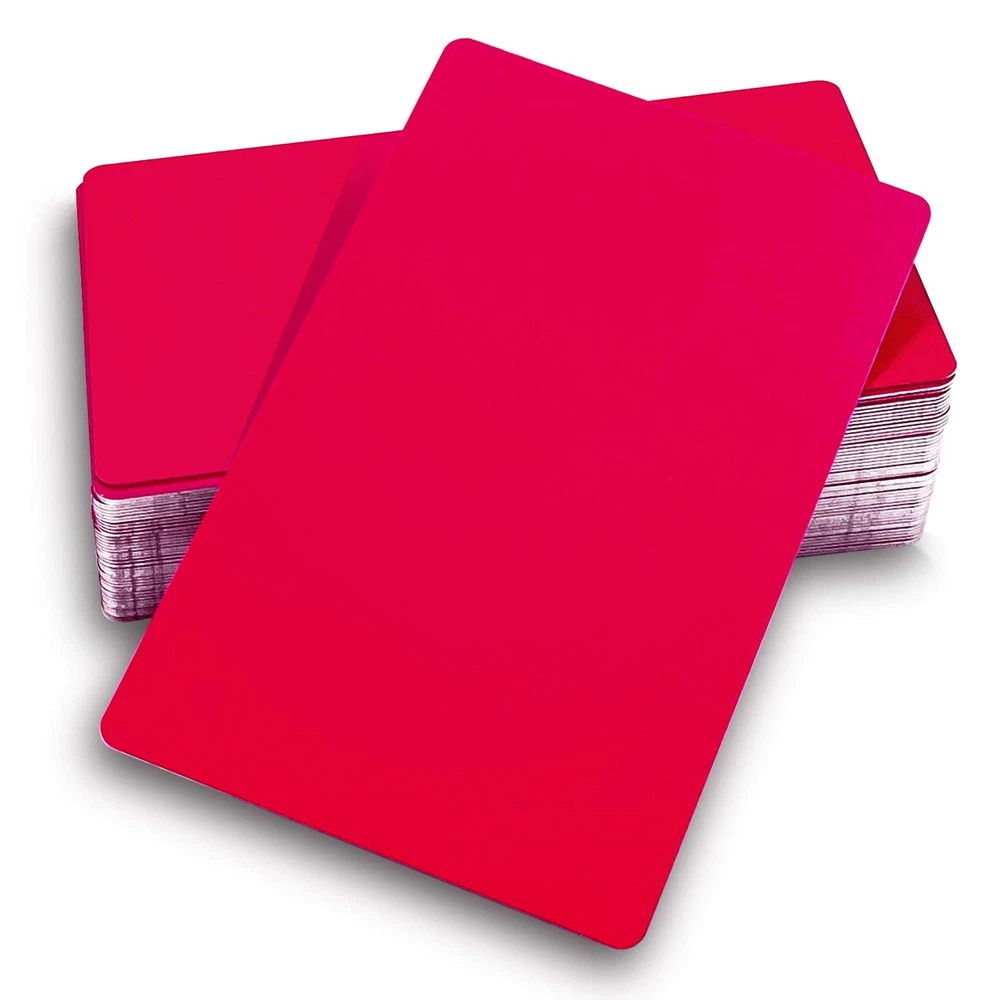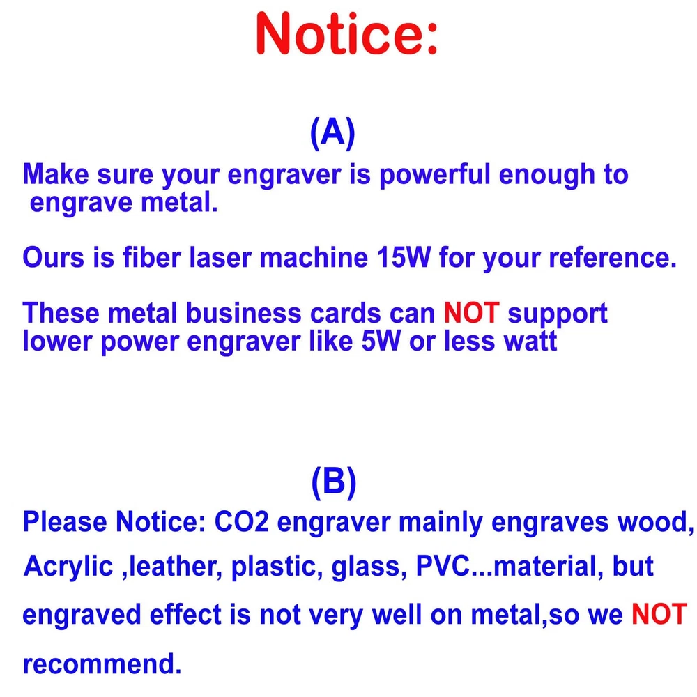 Specifications: Material: Metal aluminum Size: 86X54mm, about 0.45mm thickness Colors: Matte Black/ Blue/ Red for options Quantity: Single Color 50pcs per box Package: 50PCS X Single Color per Case, Seal Pack 1. Metal aluminum alloy cards ,coating red, 50pcs per case, solid thick type 86X54mm, about 0.45mm thickness, not easy to bend, seal pack 2. Blank / round corner / edge not rough / solid perfect packed, convenient for carry. Engraved effect will be closed to white, and will not be removed. 3. Make sure your engraver can engrave metal, ours is fiber laser machine 15W for your reference. Low watt like 5W or less might not come out a good effect 4. Please Notice: CO2 engraver mainly engraves wood ,Acrylic , plastic, glass..material, but engraved effect is not very well on metal,so we NOT recommend. 5. It is a good choice to be Metal Card / Promotion Metal Business Cards / Promotion Gift Card / Metal Plaque / Nameplate / Desk Tag / Lable tag / Name Card / Desk Number Tag / Gift Metal Cards to Personalized your artwork on it.