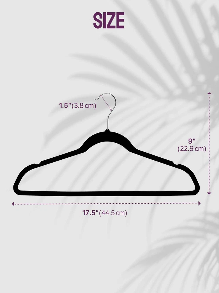 【Non-Slip Design】's 2023 NEWLY improved velvet hangers made of premium velvet surface and notched shoulder design prevents all types of clothing from shifting and slipping. The soft and luxurious velvet on the hangers is friendly to both clothes and skin, leaving no marks and keeping clothes in good condition! 【Space Saving Design】space saving hangers take up less space than plastic or wood hangers, adding up to 50% usable space. Velvet hangers made from sturdy premium grade ABS material that is strong enough to hold up to 10 pounds heavy coats without getting bent. Dorm room and closet essentials, easily organize and increase your closet space in a snap! 【Create Luxury Closet】used the finest velvet material for all our velvet hangers, which makes the closet more upscale, keep the fuzz from shedding off and stain your clothing. offer hangers 50 pack and 20 pack for choice. Let's Upgrade all hangers to be uniform colors. No more unsightly, mismatched hangers that detract from the overall aesthetic!! 【Practical Design】non slip hangers have 2 precisely cut shoulder notches can be used to hang clothes with thin shoulder straps. The specially developed shoulder line is added to promise worry-free preservation of the clothing's shape. Galvanized metal hook with a 360-degree swivel meets your different hanging angle needs, good for easy clothing sorting. 【Guarantee】is a brand specialized in most types of daily use hangers. If for any reason our clothes hangers do not meet your needs, please contact our customer service team. We offer quick and hassle-free assistance to resolve any issues that may arise!