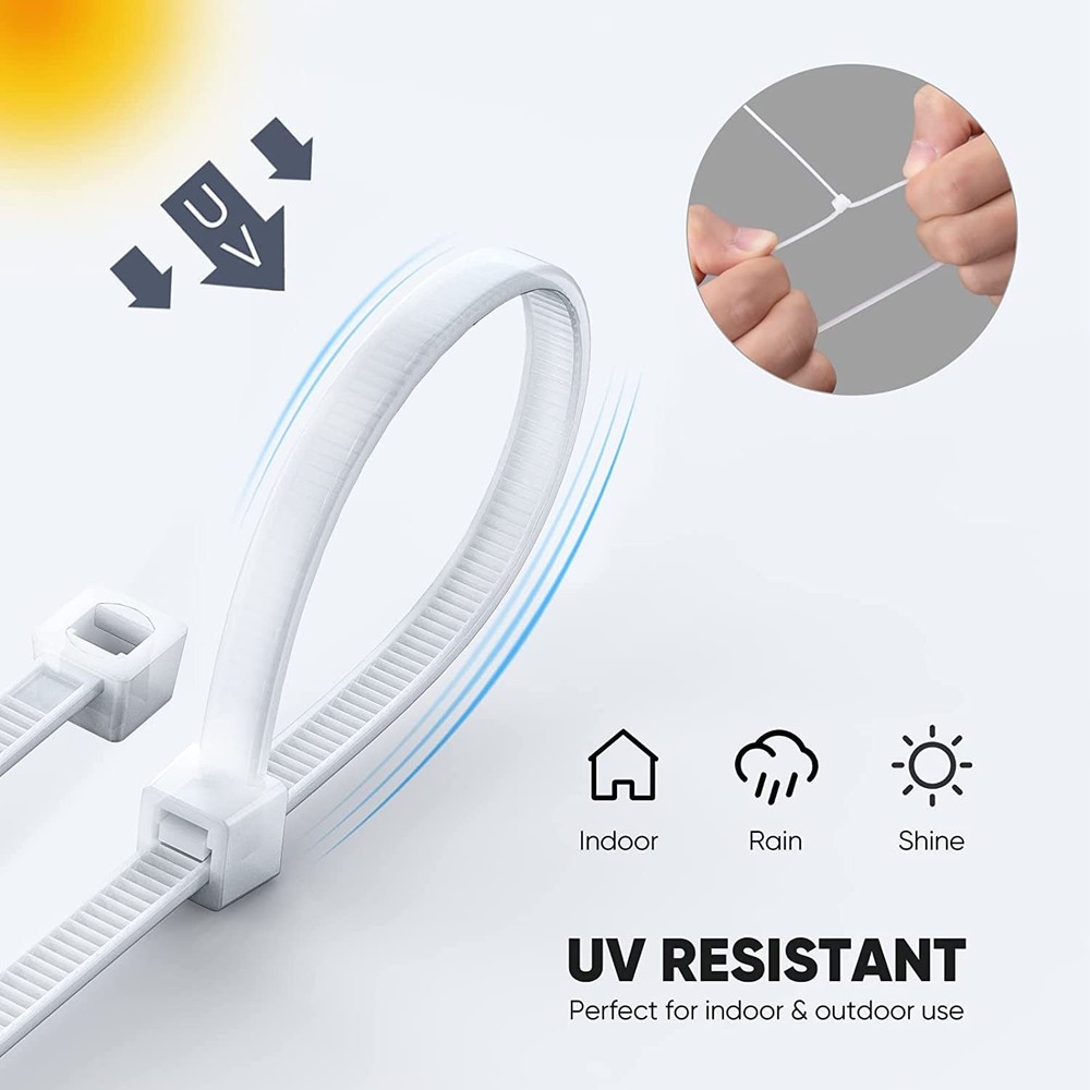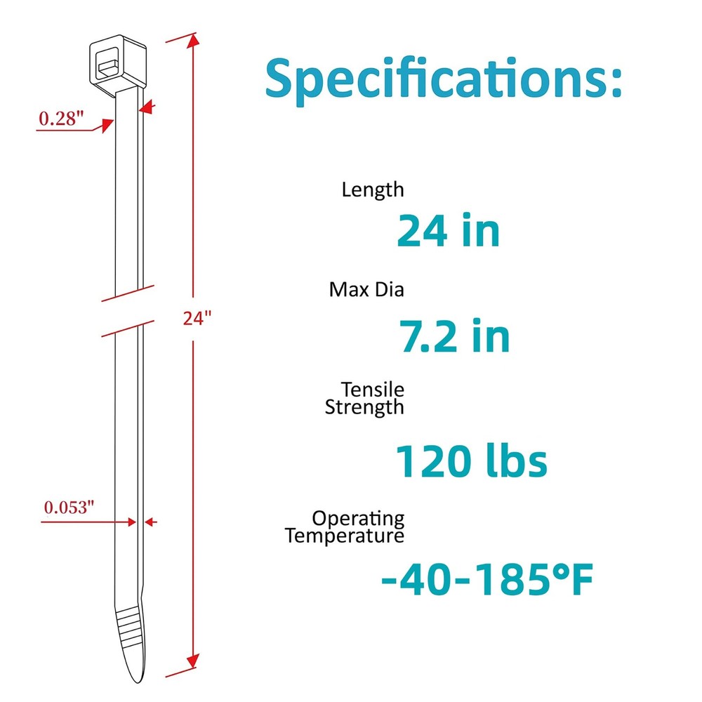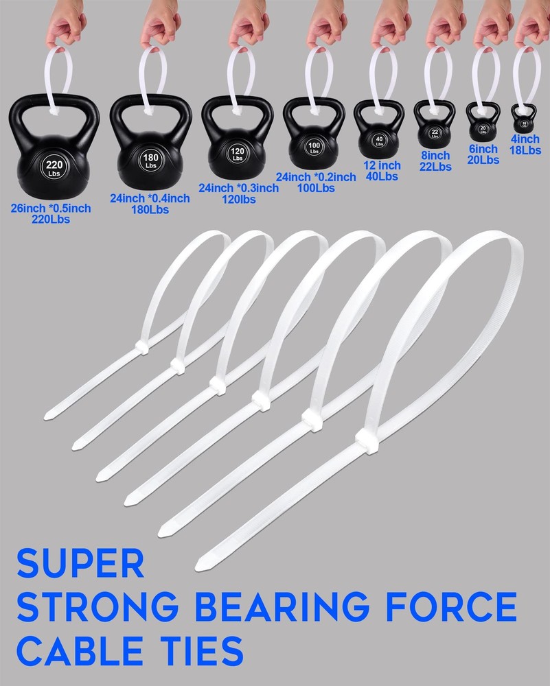 WLEAD Multi-Purpose Cable Zip Ties Organization Assistant The zip ties Self-Locking 12-Inch Nylon Cables Ties are a great choice for a range of uses from securing small items to organizing home theater cables. Designed for indoor use with small, medium or larger diameter wiring or cables. Keep in your toolbox, junk drawer, or trunk for quick fixes, and enjoy convenience and reliability in one. Self-Locking Fastener The zip ties operate by threading the tail through the self-locking fastener end and pulling to the desired tension. Easy to use, the ties offer a fast solution for securing items in the home, garden, office, or workshop. Easily double the tensile strength by using two cable ties side-by-side.Ties remain closed once fastened and require a scissors to remove. Strong Nylon Construction Made with resilient, industrial-strength 6/6 nylon, the 12 inch cable ties can be used for a variety of purposes. Featuring an 18 pound max supporting weight/tensile strength and a -40 to 85 degrees C or -40 to 185 degrees F temperature tolerance. Cold & Heat Resistant Cable Ties Zip ties are made from UV Resistant Nylon 66 giving them excellent durability in harsh conditions, weather resistant and outdoor in direct sunlight application is not an issue. Indoor / Outdoor Use Cable Zip Ties - Self-Locking Design - Cable Management - Heat & UV Resistant - Single-use locking cable tie - Ratcheting mechanism provides a secure connection - Locking teeth stop the cable tie at the desired length - Nylon construction rated with a 17 or 48-pound tensile strength 🪢【Upgrade Materials】Made of industrial strength nylon 66 fire-resistant material (fire rating 94V-2). It has high toughness, aging resistance, corrosion resistance, aging resistance, UV resistance, and good insulation. The excellent performance ensures their safe use, even when cables or other objects are inadvertently heated. It can be used in the temperature range of -40°F to +185°F (-40°C to 85°C) and outdoor in direct sunlight application is not an issue. 📌【Cable Ties Loop Tensile Strength】Loop tensile strength 24 inch x 0.3 inch-120lbs. it is longer, wider and stronger than ordinary zip ties.super strong and wide,Thanks to its UV resistance, our cable tie is a good helper in the harvest season and can be used for repairing fences, awnings and binding vegetables.Two or more cable ties can be combined to bring greater length or higher tensile strength. 📌【Zip Ties Assorted Sizes】Our store offers a variety of colors and sizes to meet your needs. These assorted cable ties are an excellent tool for home, office, garden, garage, travel and workshop organization. You can use it to manage cables, wires, and cords to keep them organized. It can also be used to fixing plants, bundling light strips, hanging curtains, Christmas decoration, etc. 🪢【Multi-purpose Applications】Our cable ties 24 inch Heavy Duty Zip Ties 50Pack. The tensile strength of our large zip tie is 200 pounds, higher than others. It is loved by plumbers, cable workers and construction enthusiasts. It can restore the space to Neat and clean picture. (Ex. Storing garden hose, hanging pedal bikes, repairing cosmetic issues on cars/trucks, securing copper wire, hanging shop signs, connecting fence poles, etc…) 🎁【After-Sales Service】Our swift exchange policy enables you to purchase without hesitation! 100% satisfaction guaranteed, Free lifetime return and exchange policy.When you have a problem in using the cable zip ties, please contact us and our customer service team will reply you and provide technical support within 24 hours.