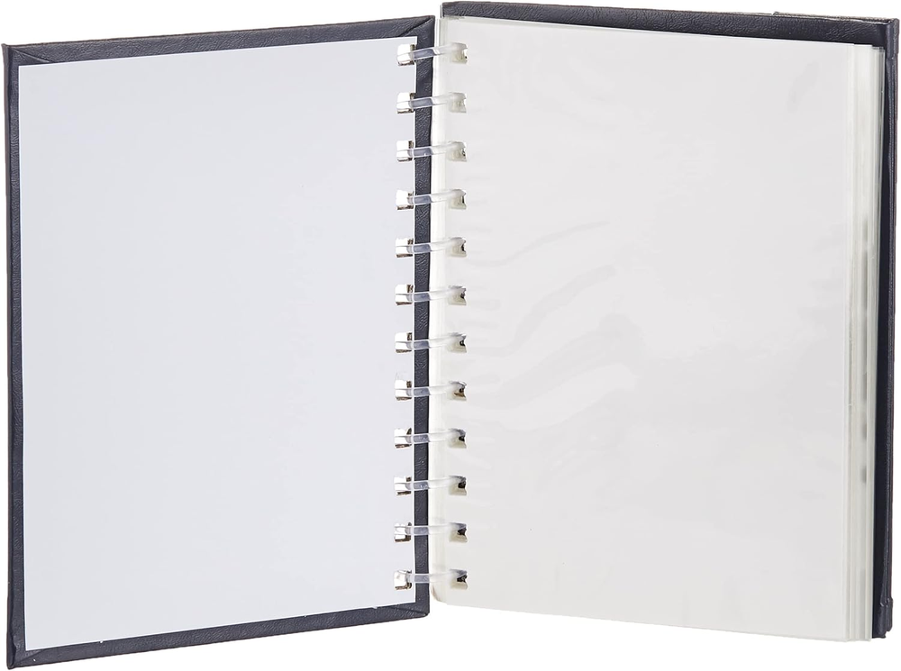 Leatherette cover Spiral binding Mini album or desktop easel Holds 50 photos up to 4"x6" Photo safe: acid, lignin and PVC free This leatherette album features spiral binding and a fold back cover allowing for use as a conventional photo album or tabletop easel. It holds 50 photos in optically clear plastic pockets with white paper backgrounds. The album measures 6.25"x5.125"x.875". Photo safe: acid, lignin and PVC free.