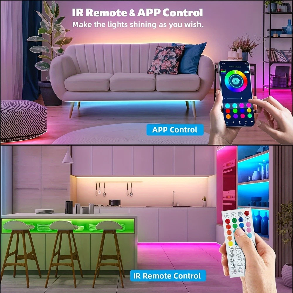 You may also like 1200W LED Solar Wall Light PIR MotionSensor Outdoor Garden Security Street Lamps 12.63 USD 13.29 USD Free shipping 5% off USB Rechargeable Under Cabinet Closet Lights LED Motion Sensor Kitchen Lamp 3IN1 9.49 USD 9.99 USD Free shipping 5% off Astronaut Projector Galaxy Starry Sky Night Light Ocean Star LED Lamp Remote USA 25.17 USD 26.49 USD Free shipping 5% off 2PCS 9900000lm LED Garage Light Super Bright Work Shop Ceiling Lights Deformable 18.26 USD 19.22 USD Free shipping 5% off 16.4FT 5m LED Strip TV Back Lights 5050 RGB Bluetooth Remote for 65 inch 70inch 9.99 USD 10.52 USD 1.99 USD 5% off BORUiT V10 LED Keychain EDC Flashlight Rechargeable Magnetic Torch Work Lamp New 7.55 USD 7.95 USD Free shipping 5% off 234LED Solar Power PIR Motion Sensor Light Outdoor Security Garden Waterproof US 15.99 USD Free shipping LED Strip TV Backlights 3-100ft 50ft Bluetooth APP Music Sync 5050 RGB Room USB 4.69 USD 4.94 USD Free shipping 5% off Super Bright LED Headlamp USB Rechargeable Headlight Flashlight Zoom Head Torch 8.54 USD 8.99 USD Free shipping 5% off 300 LED Curtain Fairy Lights USB String Lights Remote Room Party Wedding Decors 8.45 USD 8.89 USD 1.99 USD 5% off Product Description Led Strip Lights Music Sync RGB Lights Strip, Color Changing with Bluetooth Controller + 44 Key Remote Control LED Lights for Bedroom, Bar, Party, Home Decoration Specifications: 1. Model Number: 24V RGB Led Strip 2. Led Strip Size: L (10/15m) x W (0.8cm) 3. Emit Color: RGB Led Strip 5050 4. Working Voltage: DC 24V 5. LED Quantity: A+ 6. Power Supply: DC 24V ( US Plug) 7. Level:( Non-waterproof ) 8. Working Temperature: -20°C-60°C 9. Lifetime: 50,000+ hours Smart Phone Control: This smart led strip light is designed with three control mode: App, Remote Control, Control Box; Download the APP on your smartphone, turn on the Bluetooth and pair device with the light strip, then you can control the LED lights in your smartphone. Music Sync and Built-in Mic: High sensitivity built-in mic, the LED strip light colors would change following the music rhythm; It has DIY selection to create your great led mood lighting. Multifunctional Light Strips: LED lights For Room, lighting, backlighting, room, bar, restaurant, kitchen and you can cut the strip lights and use the connectors for DIY decoration. Memory and Timer Function : LED light strip has a memory function; it can remember the mode you have previously set. With the smart APP, you can automatically turn on and off at the present time and helping you control time and save energy. the light "Alarm Clock", that will eliminate your and your baby's fear of the dark, and you wake up in romantic lighting every morning. Easier and Safer to Use: Color changing lights have low voltage short-circuit protection and very low heat. Safe and touchable, long life of over 50,000 hours.it can be flexible installation on a clean, flat, and dry surface. Light strips can be cut , so you can adjust led lights to the right length. Better lighting effects: Brighter RGB LEDs and double-layer copper is used on the PCB board to make the RGB color mix more uniform and brighter. The led lights can also be controlled using 44key remote control. Multiple Scenes Available: It can be used for decorating your Dining room, Bedroom, Upstairs, Kitchen, Porch, Computer desk, Christmas tree, Bar and Living rooms, especially great for Holidays and Events like Christmas, Halloween, Parties, and more. It is an ideal gift for your family and friends. Note : 1. Length: 49.2ft=1roll 49.2ft 2. IR Remote Controller need to alignment signal receiver 3. The are 24V lights and can not be compatible with 12V power plug. Application : 1.Ideal for decoration of building outlines, landscape illumination, amusement themes, Indoor decorations,Party decoration 2.And TV Backlight, car, living room, bedroom, Party, KTV, storefronts, bar, nightclub, street, sidewalk, deck, park, porch, staircase, railing, ceiling, or driveway. Package included: 44 keys Music Set : 1* 49.2FT RGB LED Strip 5050 + Music Controller + 44 keys IR Remote Controller + 24V US Power Supply Your Light,World Light The LED strip light has 22 dynamic modes + 16 million lighting colors.It can create a romantic,relaxed and happy atmosphere,let's enjoy the colorful life LED Lights for Bedroom Ther RGB LED strip lights is very cool.It's the perfect decoration for your bedroom Gift for Children The led light strip is an interesting gift for your family & friends.Let's enjoy a happy time in the colorful world Best Home Decor The strip lights is suitable for different scenes.You can use the LED lights for living room,kitchen,TV,cabinet, bar,stair,dorm,classroom,hotels, malls,club a.Especially suitable for decorations of Christmas Day,Thanksgiving Day, New Year's You can use the led lights for room,design your led strip lighting as you like! Smart Dual Control The bluetooth LED lights support IR remote control & Lotus Lantern APP control.The APP has many functions,you can freely set the brightness,color,mode and timing function,let's enjoy the smart led strip lights Smart Time Setting The lights strip allows you to switch on or off the RGB lights at a preset time to enjoy smart home life Superior Quality & Easy Installation The Luces Led is easy to install,just tear off the adhesive and use it on a clean and dry surface.It equipped with high-quality 24V adapter,safe and secure.It can be DIY cutting.Note that connectors are required after cutting.(product does not contain connectors) Lights that Sync with Music The led light strips has a music mode,built-in high-sensitivity microphone,which can change color, rhythm with the music,it's so much fun! Let's dance with the music,enjoy the party Our LED strip is flexible. You can fold it by 90° or other degrees for corners. You do not need to cut and buy additional 8mm connectors. About Us 1.This is professional Seller.We will reply your message within 24 hours. 2.Please contact us whenever you have a