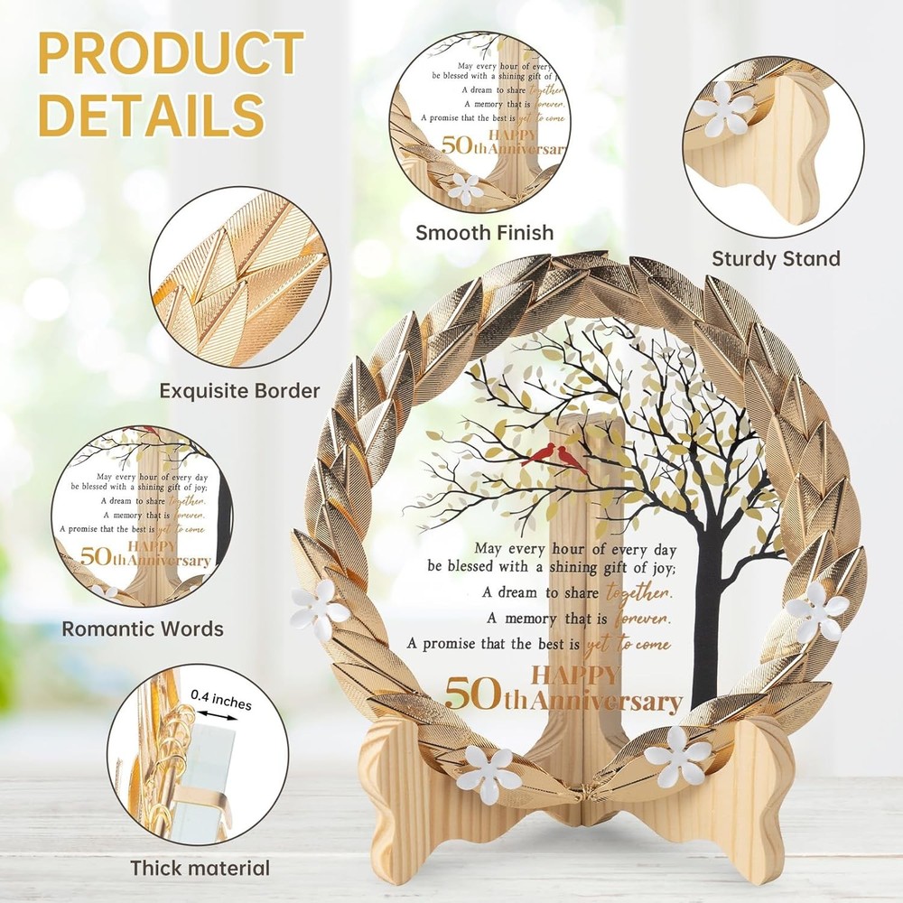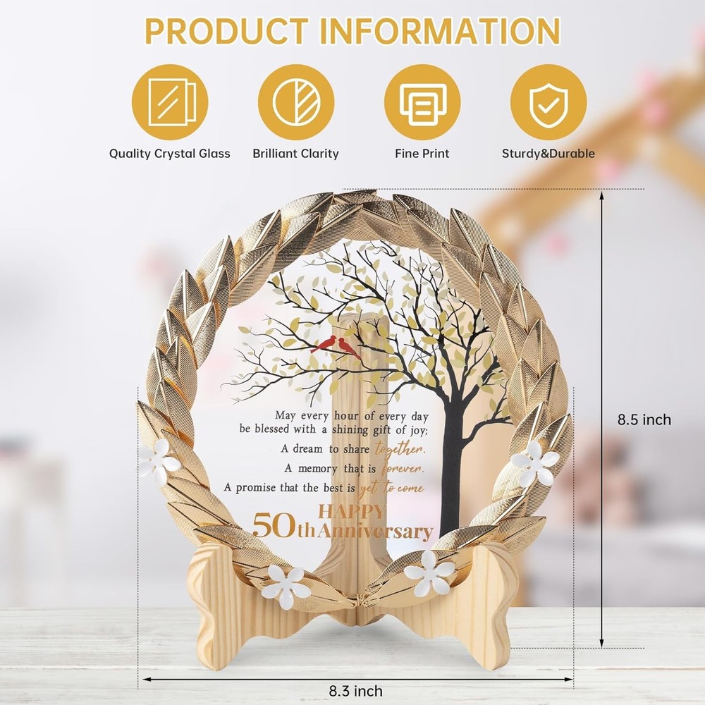 50th Anniversary Wedding Unique Gifts Ideas Crystal Plate with Gold Leaf Wreath - 50th Anniversary Wedding Gifts for Parents Couple - Cardinal Style About this item Unique 50th Anniversary Commemorative Gift - Celebrate a milestone of 50 years of marriage with our unique Golden Metal Wreath and Crystal Plaque. This exceptional gift is perfect for a memorable 50th anniversary celebration. Exquisite Craftsmanship - Meticulously crafted with exquisite craftsmanship, our gilded metal wreath encases a crystal plaque. The crystal disc elegantly showcases a heartfelt message, symbolizing the enduring bond of half a century together. Symbol of Love - Adorned with violets, the symbol of love, faith, and modesty, this meaningful gift serves as a beautiful reminder of the couple's enduring commitment. Celebrate 50 years of love and togetherness with this heartfelt tribute. Radiant Reflections - Radiating brilliance and clarity, the crystal plaque gracefully rests on the golden metal wreath, capturing the essence of the couple's enduring love. Displayed on the included wooden stand, it adds an elegant touch to any home or office decor. Timeless Treasure - This timeless treasure, featuring a golden metal wreath and crystal plaque, is the perfect gift to celebrate a 50th wedding anniversary. Delight the lucky couple with this meticulously crafted and beautifully packaged tribute.
