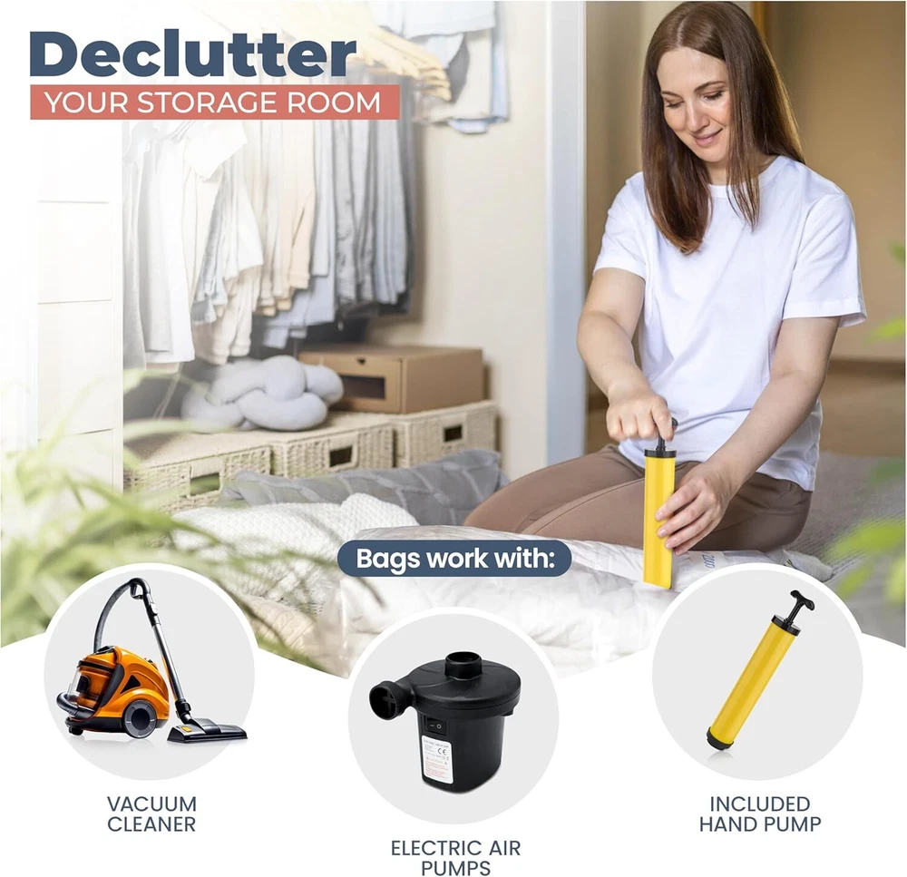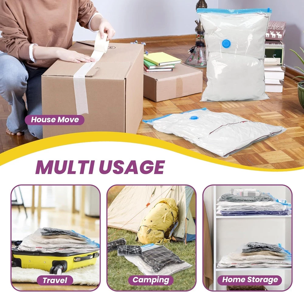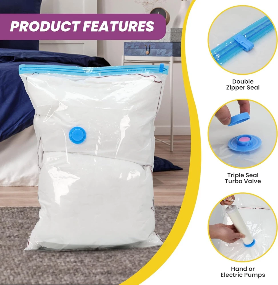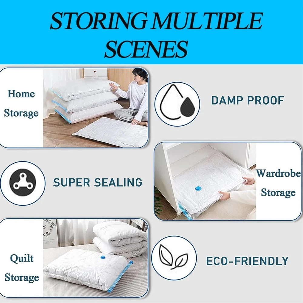 Features Maximize Storage Space: Our vacuum storage bags increase your storage capacity by up to 80%, making them an excellent solution for maximizing wardrobe, loft, and suitcase space. Ideal for clothes, comforters, pillows, duvets, beddings, and more. Long-lasting Protection: With robust double-zip sealers and triple-sealed turbo valves, our space-saving bags effectively vacuum out air and stay compressed and fresh, providing effective, long-term storage. Durable Construction: Crafted from an extra-thick blend of PA+PE materials, these vacuum-sealed storage bags offer excellent protection against dirt, dust, and potential damage to your stored items. Convenient Hand Pump Included: This combo pack includes an easy-to-use hand pump for quick air vacuuming. These vacuum seal bags are also compatible with all standard vacuum cleaners and can be reused multiple times for added convenience. Different sizes. Meet all needs. What's in the Package 5 x Bags 1 x Hand Pump Welcome to my e B a y store If you are interested in this product, please add it to your cart and we will send you an email when we have a major offer. Thanks! Please note that due to differences between computer monitors, colors may not be exactly the same as in real life. NOTE: This clothing size information is just for reference only,please allow 2-3cm (2.54cm=1inch) differences due to manual measurement. Promotions / Discounts There is currently an in-store promotion where you will automatically receive a 5%-20% discount when you purchase 2 or more items from the list or from our store. Shipping We ship worldwide. Items will be shipped within 1-2 business day after payment is received. Items are shipped by USPS - First Class Package (Standard 3-5 Business Days) business days. Delivery time depends on destination and other factors, it may takes up to 10-20 business days. If could connect us if package delay. Returns All items can be returned within 30 days of receipt. Please make sure this is the item you want before you buy. Customer satisfaction is our top priority. Return shipping costs are borne by the buyer Payment We only accepting payment through Paypal, apologize for any inconvenience. All major credit cards are accepted through secure payment processor PayPal Payment must be received within 7 business days after your bid. If you've bought multiple items from me, please connect me resend the invoice to save postage. Communication and Feedback. Your five-star reviews help us grow and improve our business, and help us keep eBay fees down. Please give us positive feedback when the item arrives and you are satisfied. Please contact us before leaving any neutral or negative feedback. We always consider our customers to be our number one asset. Please feel free to let us know if there are any problems or inquiries with an item and we will take care of it for you. so that we can resolve the issue in the best way possible without having to open a case through eBay and without negative feedback. We will leave (100%) positive feedback as soon as payment is received. We will reply all your questions within 24 hours.