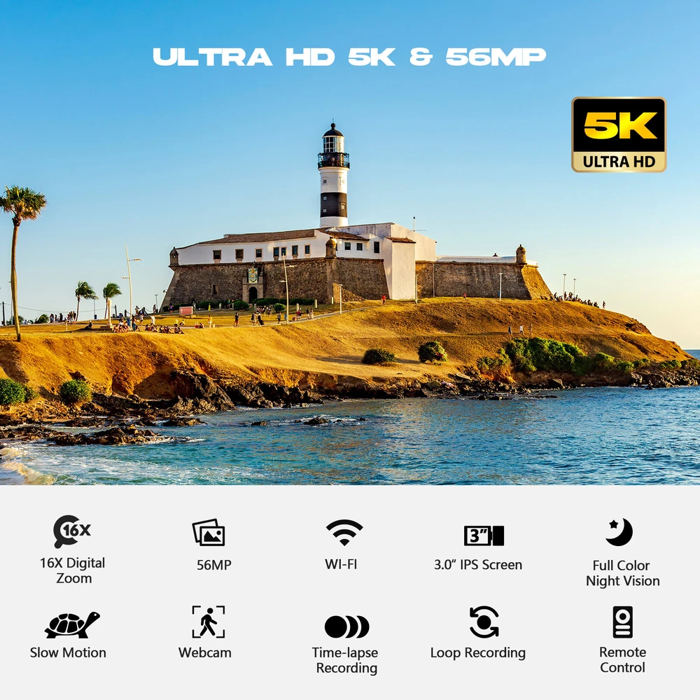 You may also like 4K Video Camera Camcorder Digital Camera Recorder 18XZoom with Flash&Dual Lens 88.99 USD Free shipping Video Camera Camcorder 5K 56MP Vlogging Camera YouTube WiFi Night Vision 3” 270° Rotatable Touchscreen Podcast Camera Recorder with Microphone,Handheld Stabilizer,Hood,Remote,2 Batteries,Tripod with 64GB SD Card CAMPARK 5K 56MP Video Camera Camcorder IR Night Vision YouTube Vlogging Podcast Camera 【UHD 5K Video Camera】 - 5K & 56MP Camcorders can capture video footage with a resolution of 5K (around 5120 x 2880 pixels) and 56MP image resolution. 3.0 inch touch screen can rotate at 270° allows you to take photos and record videos at any angle. 5K video camera supports WDR, playback, continuous shooting, time-lapse, slow motion, loop recording, ect. 【IR Night Vision & Super Long Battery Life】 -The 5K camcorder comes with 2×1700mAh rechargeable batteries. One full-charged battery can be sustainably used for 90-110 mins. The camcorder video camera supports U3 speed or above up to 256 GB MicroSDHC Card (not included).The vlogging camera youtube with infrared LED light allows you to shoot clear white/black photos or videos in the dark. 【Webcam Function & HDMI】 -The camcarders video camera 5K supports for video chatting and live streaming when used as webcam. Just connect with PC via USB cable, choose 'PC Camera' mode to enter webcam function. This digital video camera camcorder can be connected to TV by HDMI cable,share your videos with families and friends. 【Video Camera with Microphone & 2.4G Remote Control】 -The external microphone can effectively eliminate noise, improve stability of audio and receive clear, precise stereo. The Youtube Camera with a 2.4G 360° wireless remote control with a range of up to 20 ft.You can download and share photos and videos with your friends and family via your mobile device by using the WiFi function. 【Lens Hood & Stabilizer Holder】 -This 5K digital video camera comes with lens hood to block excess light and protect your podcast camera lens from accidental damage. Foldable handheld Stabilizer holder keep the 5K camera video stable when recording. If you have any question with vlog camera,please kindly contact to us,we will reply you within 8 hours. Package include: 1×Video Camera Camcorder 1×USB Cable, 1×HDMI Cable,2×Batteries 1×Camcorder Bag, 1×Handheld Stabilizer 1×Microphone, 1×Tripod, 1×Remote Control 1×User Manual 1x64GB SD Card Warm Tips: 1.The 5K camera video Supports U3 speed 64 GB SDHC Card(included). 2.Do not insert or remove the memory card during as this will damage the memory card lose date. 3.Before using the remote control, please remove the battery protection sheet of the remote control. PIease aim the remote control at the remote control receiver, and do not block it. 4.If choose "PC camera", you need to do download the corresponding software. 5.Once EIS is turned on, 5K/25fps resolution cannot be chosen. Once EIS is turned on, the "W/T" zoom function cannot used. 6.Once loop recording is turned on, new videos will overwrite old videos. Please save important files in time. 7.Loop Reording, Slow Motion and Time-lapse Record cannot work at the same time. After turning on the special recording mode, you need to press"REC" to make the camera work in the specified mode. 8.When Slow Motion or Time-lapse is enabled, the Reord Audio is turned off by default and this setting does not work. 9.The camera WiFi can only be connected to a mobile and cannot access the internet. 10.The digital video camera with night vision has a 16x digital zoom function, but it does not support the focus function. You should therefore keep the recording distance more than 0.6 m. 11.The 5K camcorders is design for the amateurs,not for the Professional users.(Auto focus is not supported, optical zoom is not supported) Webcam Function & HDMI Output The 5K vlogging camera for Youtbe can be used as a webcam to conduct video and audio conversations and communications on the network through the podcast camera. You can also connect the vlog camera to the TV with an HDMI cable, and you can playback videos or photos with your family or friends. 5K 25FPS & 56MP &16X Digital Zoom Video Resolution: MP4, 5K 25fps; 4K 30fps; 2.7K30fps; 1080p60fps; 1080p30fps; 720p60fps; 720p30fps Photo Resolution :JPG, 5M; 8M; 12M; 16M; 20M; 24M; 36M; 48M; 56M The Youtube camera support 4x,8x,16x digital zoom 3 Inch 270° Rotation IPS Touch Screen The video camera camcorder 5K has a 3.0” LCD 270° rotatable Touch Screen which you can swivel for selfies and see exactly what you're filming. Handheld Stabilizer The foldable handheld stabilizer saves space and easy to install.Suits for recording moving objects, reducing filming camera shake and shooting clearer pictures and videos. Video Camera with Microphone There is a hot shoe mount on the top of video camera for filming, and an external microphone is installed to eliminate surrounding noise during use, and the sound quality is clearer. WiFi Connection Downloading "Lercenker" APP, easy to connect the camcorders night vision with Android/iOS smartphones and tablets. 5K WiFi camcorder enable remote view, image capture and video shooting. Adjustable Camera Tripod The digital camcorder tripod can be rotated 360° to keep the 5K camcorder video camera for youtube stable at different shooting angles.