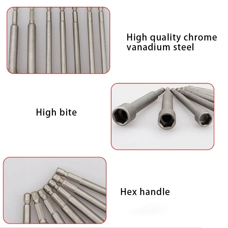 Features: Made of chrome-vanadium steel with long life and great durability for use. Strong inner & outer hexagon sleeve without There are 7 pieces in the package, 5-12mm socket wrench extension set. Size: 12mmx115mm ,11mmx115 mm, 10mmx112mm, 9mmx112mm ,8mmx112mm , 6mmx110mm, 5mmx110mm. Suitable for household DIY, woodworking, auto parts, professional machine repairing, Specifications: Material Type: for Key Size: 5/6/8/9/10/11/12mm Package Includes: 7 x Socket Wrench Extension Set note: Please allow 1-3cm error due to manual measurement. pls make sure you do not mind before you bid. Due to the difference between different monitors, the picture may not reflect the actual color of the item.