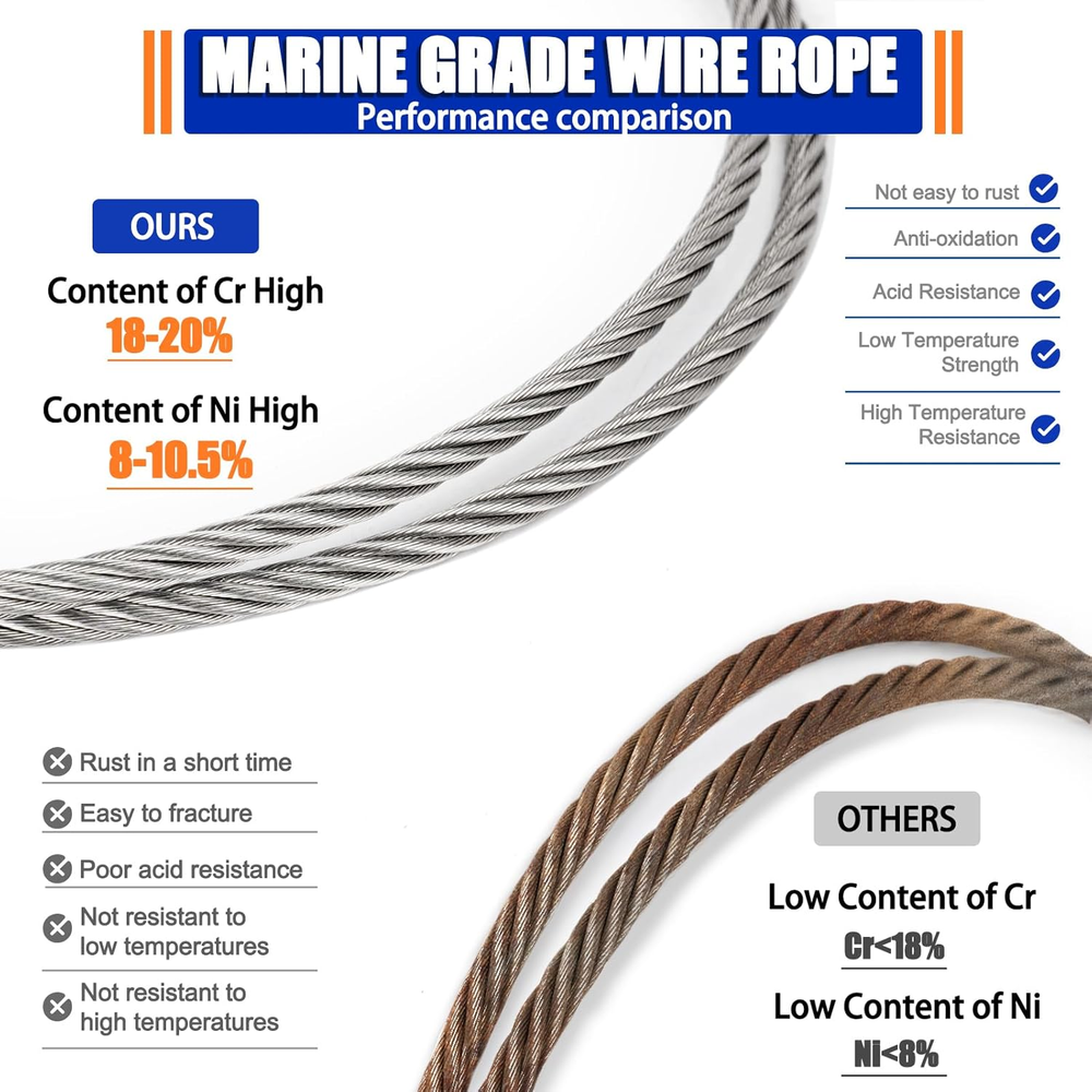 Store New Arrivals Add to Favorite View Feedback Contact 5/16 Stainless Steel Cable 25Ft Steel Cable with Loops 7 * 19 Strand Steel Rope for Zipline Boat Lifts Winch Cable Cable Wire Fence Heavy Duty Wire Rope Kit with Clamps and Thimbles Description Item model number WF-012 Unit Count 25.0 Feet Style 25FT Number of Items 1 Color Stainless Steel Material Stainless Steel Tensile Strength 9000 Pounds Item Weight 4.96 Pounds Recommended Uses For Product Home applications: balcony railings/plant climbing frames/fence lines/garden decorations/light strings/suspension, Outdoor applications: equipment towing/mechanical lifting operations/zip lines/rock climbing walls. Finish Type Polished Package Dimensions 9.21 x 7.76 x 3.9 inches Size 5/16 Inch (8mm) High-quality material: 5/16 steel cable are made of 304 stainless steel, with rigorous craftsmanship. Each process is strictly carried out in accordance with the process standards, and professional quality inspections are carried out layer by layer. The products produced are corrosion-resistant, rust-free, sturdy and durable, and are suitable for harsh environments such as the seaside. Widely used: 5/16 stainless steel cable are widely used in DIY garden railings, boat deck railings, stair cable railings, dock railings, step handrails, clotheslines, small diameter pulley ropeways, outdoor sports and other projects. Strong and durable: The surface of our 5/16 wire rope cables is treated with high-precision electrolytic polishing, which can not only effectively prevent rust corrosion, no burrs, and protect your hands. Provide safety guarantees for your cable railing hardware,outdoor sports projects, and DIY railing projects, add a touch of elegance and sophistication to your deck or stairs, and enhance the overall spatial beauty and safety of your project. Easy to install: Our 5/16 stainless wire is composed of a 7*19 structure. It consists of 7 strands of steel wire and 19 strands of steel wire rope per strand, safe load capacity is 1800 lbs, maximum load capacity is 9000 lbs. 7x19 strand stainless steel wire rope is the most flexible multi-purpose wire rope with bright surface, easy installation, time-saving and labor-saving, and good effect. Package List: You will get 1 25ft 5/16 stainless steel wire rope with loops , 6 stainless steel wire rope clips, 6 thimbles, 6 aluminum crimping ring sleeves, this is a strong wire rope kit. Product description 25ft Stainless Steel Wire Rope 5/16 Inch, 7X19 Strand Braided Aircraft Suspension Cable, Wire Railing Growglow stainless steel cable railing kit is complete The kit includes 1 100-foot 5/16-inch stainless steel wire rope, single-end double crimping with thimble, 6 stainless steel wire rope clamps, 6 thimbles, and 6 aluminum crimping rings. All parts are well-structured and beautifully made to complete the task well. Growglow 5/16 Inch 304 Stainless Steel Wire Rope Cable Series Features 1. Flexible and moderate size: 5/16-inch diameter wire rope, suitable for situations requiring fine control or medium-weight applications; at the same time, 5/16-inch wire rope is generally more flexible, easy to bend and tangle, and suitable for use in applications that require frequent bending. 2. Good load-bearing strength: The wire rope is composed of a 7*19 strand structure, with a fairly high tensile strength and can withstand a certain load. 3. Wear and corrosion resistance: The 7*19 structure wire rope made of 304 stainless steel has good wear and corrosion resistance, and is suitable for environments with humid and corrosive substances that are often rubbed or in contact with other objects. 4. Simple operation and controllable cost: Due to its moderate diameter, this wire rope is easier to install and operate, suitable for manual or small mechanical equipment; at the same time, moderate diameter wire rope is usually low cost and suitable for applications with limited budgets. Growglow Wire Rope Cable Is Carefully Manufactured, Safe And Reliable High-quality materials plus rigorous craftsmanship Our wire rope is made of 304 stainless steel material with rigorous craftsmanship. Each process is carried out strictly in accordance with the process standards, and professional quality inspections are carried out layer by layer. It has the characteristics of high strength, strong anti-rust ability, strong load-bearing capacity, strong and durable, and can cope with harsh environments. High-strength tensile force The 5/16-inch cable has excellent tensile force, with a measured safe load capacity of 1800 pounds and a maximum load capacity of 9000 pounds. It has strong load-bearing capacity, is strong and durable, and is the preferred accessory for DIY projects and outdoor sports enthusiasts. This wire rope will be suitable for any unique application you can think of. I believe it exceeds all expectations. Growglow Cable Wire Rope Adopts 7*19 Structure, Taking Into Account Flexibility And Strength Characteristics of 7*19 strand steel wire rope The 7*19 strand steel wire rope is made of 7 strands of 19 filaments twisted together. This structure makes the steel wire rope have higher strength and better toughness. Compared with the 7*7 structure steel wire rope, the 7*19 structure steel wire rope is softer and easier to install and use. The material is 304 stainless steel, which will not rust when used outdoors, ensuring its good corrosion resistance. As a flexible component, the steel wire rope has the advantages of light weight, good flexibility, flexible use, ability to withstand impact loads, no noise during high-speed operation, and a sign of broken wire before breaking. The 7*19 strand steel wire rope has high strength and toughness due to its unique structure and material, and is suitable for various workplaces. The 7*19 strand steel wire rope is suitable for a variety of application scenarios due to its high strength, high toughness, easy installation and use, and good corrosion resistance, especially in occasions th
