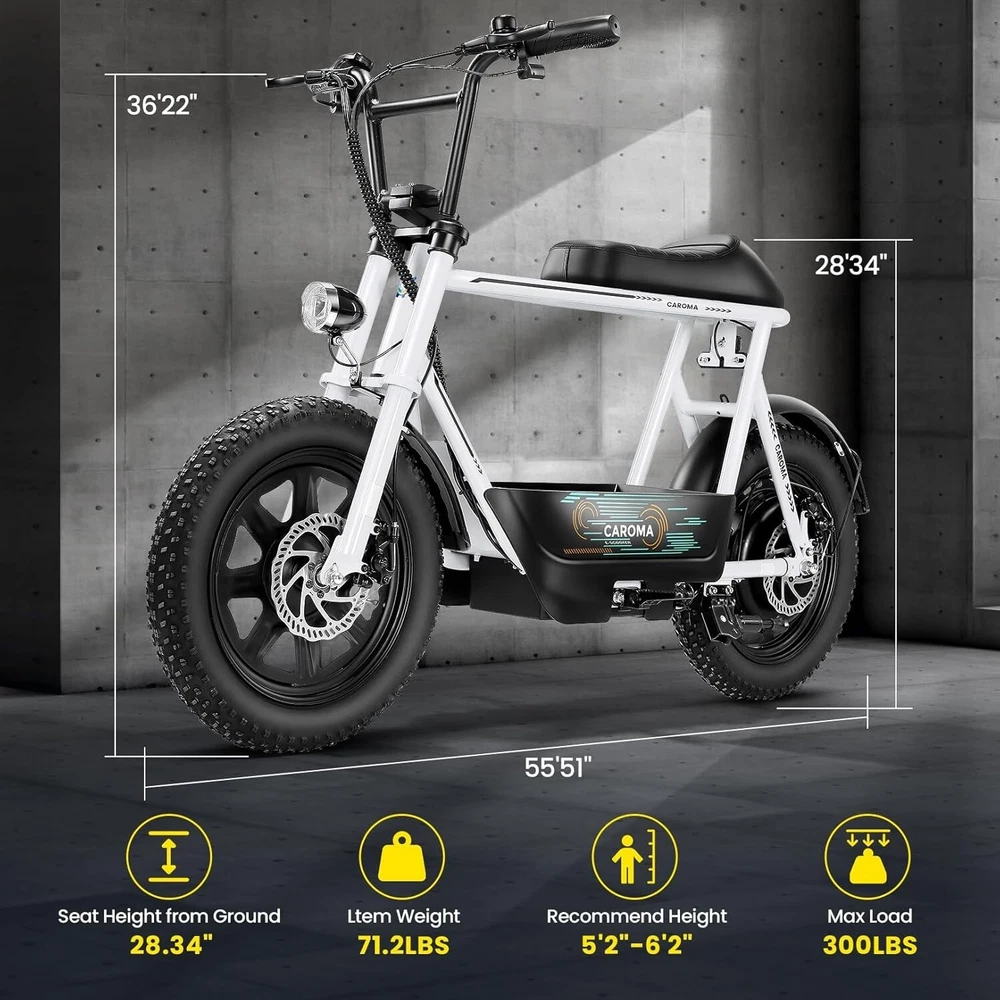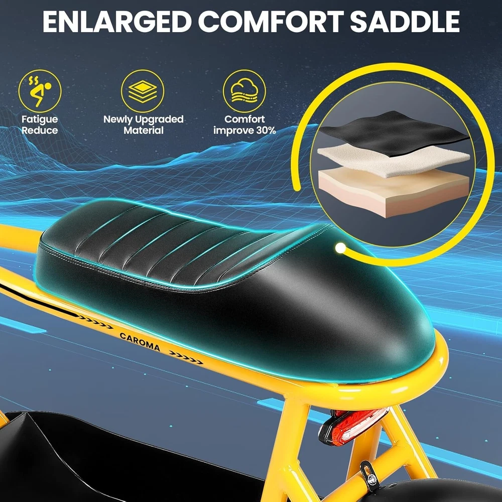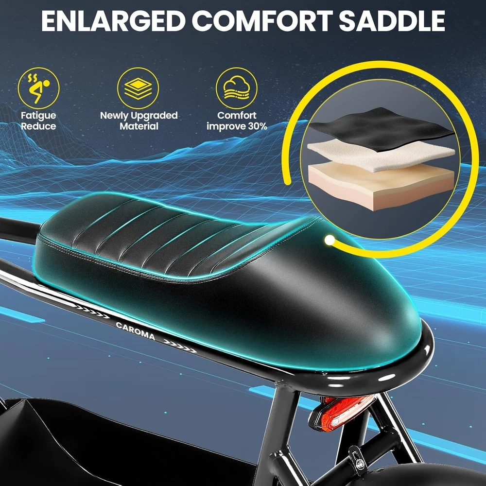 Product Description About this item ใ€๐™๐™ฃ๐™ž๐™ฆ๐™ช๐™š ๐™Ž๐™ฉ๐™ฎ๐™ก๐™š & ๐™Ž๐™ฅ๐™ค๐™ง๐™ฉ๐™จ ๐™‘๐™ž๐™จ๐™ž๐™ค๐™ฃใ€‘:This ๐—บ๐—ผ๐˜๐—ผ๐—ฟ๐—ฐ๐˜†๐—ฐ๐—น๐—ฒ ๐˜€๐˜๐˜†๐—น๐—ฒ electric scooter for adults features a ๐˜‚๐—ป๐—ถ๐—พ๐˜‚๐—ฒ ๐—ฎ๐—ป๐—ฑ ๐—ถ๐—บ๐—ฎ๐—ด๐—ถ๐—ป๐—ฎ๐˜๐—ถ๐˜ƒ๐—ฒ ๐—ฑ๐—ฒ๐˜€๐—ถ๐—ด๐—ป. The saddle is both delicate and soft, with a strengthened pole that creates a thrilling sports adventure experience. You'll turn heads with this bike and be the envy of others. Join us and try out the latest fashion trend. ใ€๐˜ผ๐™ก๐™ก-๐™๐™š๐™ง๐™ง๐™–๐™ž๐™ฃ ๐™ˆ๐™–๐™จ๐™ฉ๐™š๐™ง๐™ฎใ€‘:๐Ÿญ๐Ÿฒ*๐Ÿฏ" ๐—ณ๐—ฎ๐˜ ๐˜๐—ถ๐—ฟ๐—ฒ๐˜€ provide a larger contact area, giving the scooter better stability and grip on a variety of surfaces. Fat tires better absorb vibrations on the road, providing a smooth and comfortable ride even on uneven roads,๐—ฟ๐—ฒ๐—ฑ๐˜‚๐—ฐ๐—ถ๐—ป๐—ด ๐˜๐—ต๐—ฒ ๐—ฟ๐—ถ๐˜€๐—ธ of a blowout when driving over sharp objects, more suitable for extreme or irregular terrain, such as off-road mountain or beach, expanding the range of riding environments. ใ€๐™‹๐™š๐™–๐™  ๐Ÿญ๐Ÿฎ๐Ÿฌ๐Ÿฌ๐—ช ๐™ˆ๐™ค๐™ฉ๐™ค๐™ง & ๐Ÿฑ๐Ÿฌ๐Ÿฌ๐™’๐™ ๐˜ฝ๐™–๐™ฉ๐™ฉ๐™š๐™ง๐™ฎใ€‘: ๐—–๐—”๐—ฅ๐—ข๐— ๐—” ๐——๐Ÿฏ ๐—ฒ๐—น๐—ฒ๐—ฐ๐˜๐—ฟ๐—ถ๐—ฐ ๐˜€๐—ฐ๐—ผ๐—ผ๐˜๐—ฒ๐—ฟ with seat is equipped with a ๐Ÿณ๐Ÿฑ๐Ÿฌ๐—ช(๐—ฃ๐—ฒ๐—ฎ๐—ธ ๐Ÿญ๐Ÿฎ๐Ÿฌ๐Ÿฌ๐—ช) brushless hub motor and ๐Ÿฑ๐Ÿฌ๐Ÿฌ๐—ช๐—ต long lasting battery, so that it can reach ๐Ÿฎ๐Ÿฌ๐— ๐—ฃ๐—› top speed and travel up to ๐Ÿฏ๐Ÿฌ ๐—บ๐—ถ๐—น๐—ฒ๐˜€ on a single charge. The E sooter can run smoothly even on a ๐Ÿฎ๐Ÿฌยฐ road. ใ€๐™‹๐™š๐™ง๐™›๐™š๐™˜๐™ฉ ๐™€๐™ก๐™š๐™˜๐™ฉ๐™ง๐™ž๐™˜ ๐˜ฝ๐™ž๐™ ๐™š ๐™›๐™ค๐™ง ๐˜ผ๐™™๐™ช๐™ก๐™ฉ๐™จ ๐™๐™ฃ๐™™๐™š๐™ง $๐Ÿฑ๐Ÿญ๐Ÿฌใ€‘:๐—–๐—”๐—ฅ๐—ข๐— ๐—” ๐——๐Ÿฏ ๐—ฒ๐—น๐—ฒ๐—ฐ๐˜๐—ฟ๐—ถ๐—ฐ ๐˜€๐—ฐ๐—ผ๐—ผ๐˜๐—ฒ๐—ฟ is a standout choice with its unbeatable price/performance ratio. Not only does it excel in its price range, but its unique design ensuring you turn heads wherever you go. Electric scooter arrives ๐Ÿด๐Ÿฑ% ๐—ฝ๐—ฟ๐—ฒ-๐—ฎ๐˜€๐˜€๐—ฒ๐—บ๐—ฏ๐—น๐—ฒ๐—ฑ. Simply install the front wheel, handlebars, pedal and basket, you're ready to hit the road with ease. ใ€๐™๐™ง๐™ช๐™จ๐™ฉ๐™š๐™™ ๐™Œ๐™ช๐™–๐™ก๐™ž๐™ฉ๐™ฎ ๐˜ผ๐™จ๐™จ๐™ช๐™ง๐™–๐™ฃ๐™˜๐™šใ€‘:The caroma electric scooter is UL 2272 certified. We provide a ๐Ÿญ๐Ÿฎ-๐—บ๐—ผ๐—ป๐˜๐—ต ๐˜„๐—ฎ๐—ฟ๐—ฟ๐—ฎ๐—ป๐˜๐˜† for this electric scooter. If you encounter problems when using the product, please refer to the manual. If the problem cannot be solved, feel free to contact our customer service. ใ€๐™‡๐˜พ๐˜ฟ ๐˜ฟ๐™ž๐™จ๐™ฅ๐™ก๐™–๐™ฎ & ๐™Ž๐™–๐™›๐™š ๐™ฉ๐™ค ๐™๐™ž๐™™๐™šใ€‘:The LCD monitor shows the ๐—ฏ๐—ฎ๐˜๐˜๐—ฒ๐—ฟ๐˜† ๐—น๐—ฒ๐˜ƒ๐—ฒ๐—น of the e scooter, so you can get a clear picture of your riding. The effective front and rear disc brake on the e-scooters provide excellent stability and control. Complete with a ๐—ฐ๐—ผ๐—ผ๐—น ๐—ต๐—ฒ๐—ฎ๐—ฑ๐—น๐—ถ๐—ด๐—ต๐˜ for optimal safety during night rides. The high-brightness headlight and rear brake light ๐—ธ๐—ฒ๐—ฒ๐—ฝ ๐˜†๐—ผ๐˜‚๐—ฟ ๐—ฟ๐—ถ๐—ฑ๐—ถ๐—ป๐—ด ๐˜€๐—ฎ๐—ณ๐—ฒ at night.