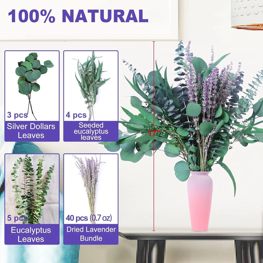 52 PCS Mix Dried Eucalyptus & Lavender Flowers Bundles for Shower, 17'' Green Product Details Color: Green Plant or Animal Product Type: Eucalyptus, Lavender Brand: beerfingo Specific Uses For Product: Home SPA, Shower Decor Unit Count: 52.0 Count Best Eucalyptus Shower Set: The package includes 12 pcs 3 kinds of eucalyptus and 40 pcs (about 0.7oz) dried lavender, 5 large stem eucalyptus, 3 silver dollar leaves, 4 Seeded eucalyptus. Satisfy your need for shower plants and bring you a fragrant Home SPA Natural Plants: Select high-quality eucalyptus and lavender. Lengths 15''-17'' (measured and packaged by hand, please allow a slight difference in size and quantity). Unpacking, there will be some scattered Lavender seeds in it, which are particularly easy to fall off. This is also a characteristic of natural plants. You can hang lavender with the bag to avoid soiling your floor Home SPA Enjoyment: Eucalyptus & silver dollar leaves have a menthol-like distinct scent that is used in aromatherapy to encourage relaxation and anxiety relief. Dried lavender has a calming scent, soothing effect. Enjoy a moment of peace in your busy day with this Shower Plants Set and enjoy the simple pleasure of aromatherapy in every shower Perfect Shower Hanging Decor: Eucalyptus and lavender are the ideal choice for various places. They are the most original aromatherapy machines. They are suitable for making wall hanging decor, decorations for bedrooms, bathrooms, restaurants, etc., as well as wedding bouquets and party decoration to create a warm and comfortable family environment Care Tips: The special preservation technology makes them look like fresh plants. If kept in a humid environment for a long time, green glycerin liquid may be separated, don't worry, that's a normal phenomenon. Hang it between the shower head and the wall to prevent hot water from directly showering on the bundle, which can prolong the service time. Eucalyptus shower gives the stress relief and relaxation they need and deserve. Perfect present for friends, family, mom and dad