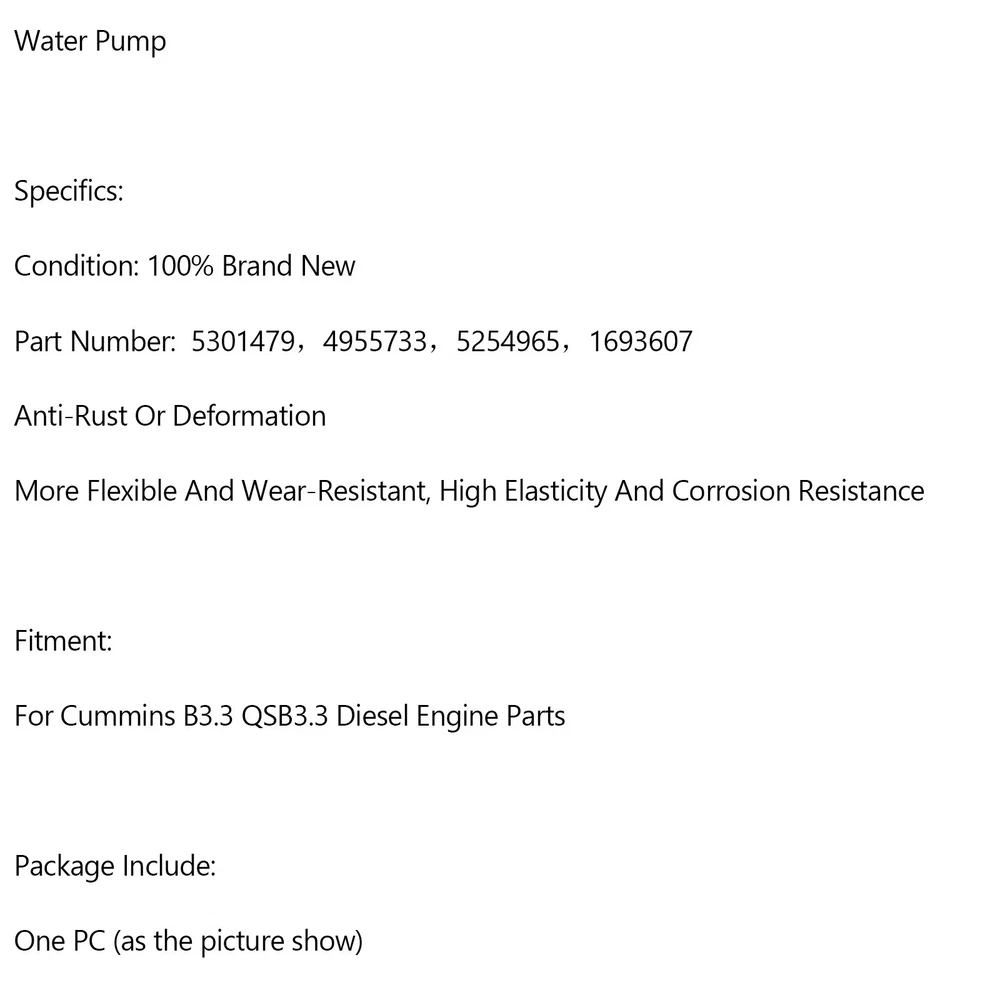 All Models For Honda For Suzuki For Kawasaki For Yamaha For BMW For Polaris For CFmoto For Ducati For Benelli For Trident For Triumph For Aprilia Other part You may also like 5473238 Water Pump 2881804 Fits For Cummins 6.7 Diesels 2007 thru 2012 #3 101.69 USD Free shipping 5.0 5.7 V-belts 21214596 3858229 Raw Sea Water Pump for Volvo Penta 4.3 115.69 USD Free shipping Water Pump 8503991 17437 18-684M 60658 For MerCruiser Circulation 4.3L 5.0L 5.7L 79.69 USD Free shipping 21214599 3812693 3862482 Water Pump For Volvo Penta 4.3L 5.0L 5.7L belts 60.69 USD Free shipping 2881688 5473237 Water Pump 5444110 Fits For Cummins QSB6.7L Diesel Engine #3 47.0 USD Free shipping PRODUCT DESCRIPTION Water Pump Specifics: Condition: 100% Brand New Part Number: 5301479,4955733,5254965,1693607 Anti-Rust Or Deformation More Flexible And Wear-Resistant, High Elasticity And Corrosion Resistance Fitment: For Cummins B3.3 QSB3.3 Diesel Engine Parts Package Include: One PC (as the picture show) About Us Payment Shipping Returns Contact Us About VIPIH VIPIH is one of the international leading distributors specialized in distribution of motor parts of the world's prime motorcycle part suppliers on a global scale with the full responsibility in procurement, shipping, sales and marketing and after sales service. VIPIH fulfills all needs of its clients completely and on a timely basis with the know-how it has built up since it was established and the comprehension knowledge of the sectors standards. The perfectionist approach in product quality, high service availability, strict principle of business follow-up, reliability and the good reputation which has gained strength as a result of customer satisfaction are the most striking components of VIPIH's success. VIPIH is presently capable of supplying all demands for motor parts from the petrol pump to rectifier in a wide range. Free delivery with worldwide shipping options available. If you need any further information before ordering,please get in touch with expert advice. About Item All items sold by us are being described to the best of our abilities, as accurate as possible, and with utmost conscientiousness on our part. However, to avoid any potential oversights, I respectfully request your assistance in helping us to make this a mutually satisfactory transaction by THOROUGHLY reviewing item description and photos, and asking all questions PRIOR TO BIDDING. Customer Satisfactory 1.We back our commitment with superb service, 100% full money back and a customer satisfaction guarantee. 2.I am here and ready to assist you with any questions or concerns you might have before or after the purchase. 3.My goal is to make sure you are a happy customer and pleasant shopping with us. Feedback If you are satisfied with the purchase and our total service, your comment is very important in our business success. Please take a minute to leave us a positive feedback with an overall Detailed Selling Rating (DSR) of 5. Our eBay account setup auto feedback, so eBay system gives you automatically Positive feedback back after your positive feedback left. If you plan to give us a neutral/negative feedback Or open ebay/paypal case, please write to us immediately so that we can do our best to resolve your problem. 1.We only accept PayPal. 2.PayPal is the only online payment method we accept. Please make sure you have a valid/confirmed PayPal account prior bidding. 3.Payment must be made within 3 days of the auction end time. Non-Paying bidders will be reported. 4.Our eBay account automatically open a dispute for a unpaid item, when we don't receive your payment after 4 days. United States Buyers Parcel will via USPS or UPS from us United States warehouse Shipping Time Usually ,Parcel will be delivered 2-10 working day include Handling time. Sometimes shiping time may has a little delay, such as Bad wether,Holidays We stand behind everything that we sell and will do everything possible to assure you are satisfied. When you receive your purchase if you are not 100% satisfied, please sent me ebay message and we will do our best to make you happy. If you still want to return your purchase, simply ship the item(s) back to us and we will refund your original purchase price and the original shipping charge. Buyers are responsible for the postal cost of returning the items. We must be notified of the intent to return your item within 30 days of receiving the item. Items returned must be in the same condition that they were received. How to return 1,Please ask us for return address . 2,Shipping back the package . The RMA#(Return Merchant Authorization Number = Your ebay ID) must be clearly written on the return package ,Otherwise the package will be refused. 3,Sent us the return tracking number. 4,All returns will be inspected prior to a credit being issued. Sent ebay message in English If you have any questions, our Customer Service staffs welcome you to sent me ebay message. We strive to answer all questions and resolve any problems as quickly as possible. Business Hours: HongKong Time GMT+8:00 Monday-Saturday 9:00-17:00 About Us About Item All items sold by us are being described to the best of our abilities, as accurate as possible, and with utmost conscientiousness on our part. However, to avoid any potential oversights, I respectfully request your assistance in helping us to make this a mutually satisfactory transaction by THOROUGHLY reviewing item description and photos, and asking all questions PRIOR TO BIDDING. Customer Satisfactory 1.We back our commitment with superb service, 100% full money back and a customer satisfaction guarantee. 2.I am here and ready to assist you with any questions or concerns you might have before or after the purchase. 3.My goal is to make sure you are a happy customer and pleasant shopping with us. Feedback If you are satisfied with the purchase and our total service, your comment is very important in our business success. Please take a minute to leave us a p