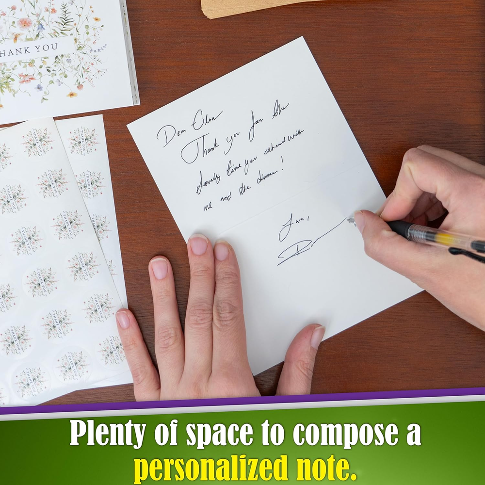 Premium Quality: Crafted with exquisite attention to detail and printed on premium thick cardstock, our floral thank you cards have a non-glossy finish that ensures no smudging or fingerprints. Ideal Dimensions: Measuring 3.5x5 inches when folded, our perfectly sized thank-you cards offer ample space to convey your thanks while also accommodating standard size photos within the envelope. These blank cards are perfect for expressing your gratitude for any occasion. Sleek and Chic: Our fliral thank you cards elevate your gratitude with sturdy kraft envelopes and matching stickers. Each set includes 52 cards in 6 distinct designs with 52 envelopes and stickers included, perfect for personal or professional use. Make someone's day with a heartfelt handwritten message. Moisture-Sealed Envelopes: Each envelope comes with a water-based adhesive seal and a matching peel-and-seal sticker for added adhesion and convenience. Perfect for everyday mailing and special occasions, these moisture-sealed envelopes keep your message safe and dry. Celebrate Any Occasion: Having a pack of thank you cards with envelopes on hand is always a good idea for weddings, engagements, bridal showers, baby showers, baptisms, birthday parties, anniversaries, customer gratitude, or any other occasion throughout the year. Express your appreciation with style and elegance. Express your gratitude in style with our Thank You Cards Bulk set. This set comes with 52 cards and matching Kraft envelopes to make your correspondence a breeze. Made with high-quality paper, these cards are designed for a smooth and easy writing experience. Adding a personal touch has never been easier, thanks to the included matching stickers. Whether you're expressing appreciation after a wedding, shower, or party, our Thank You Cards Bulk set makes it easy to cherish and share your gratitude. Don't settle for less when it comes to your thank yous; upgrade to our premium quality set today.