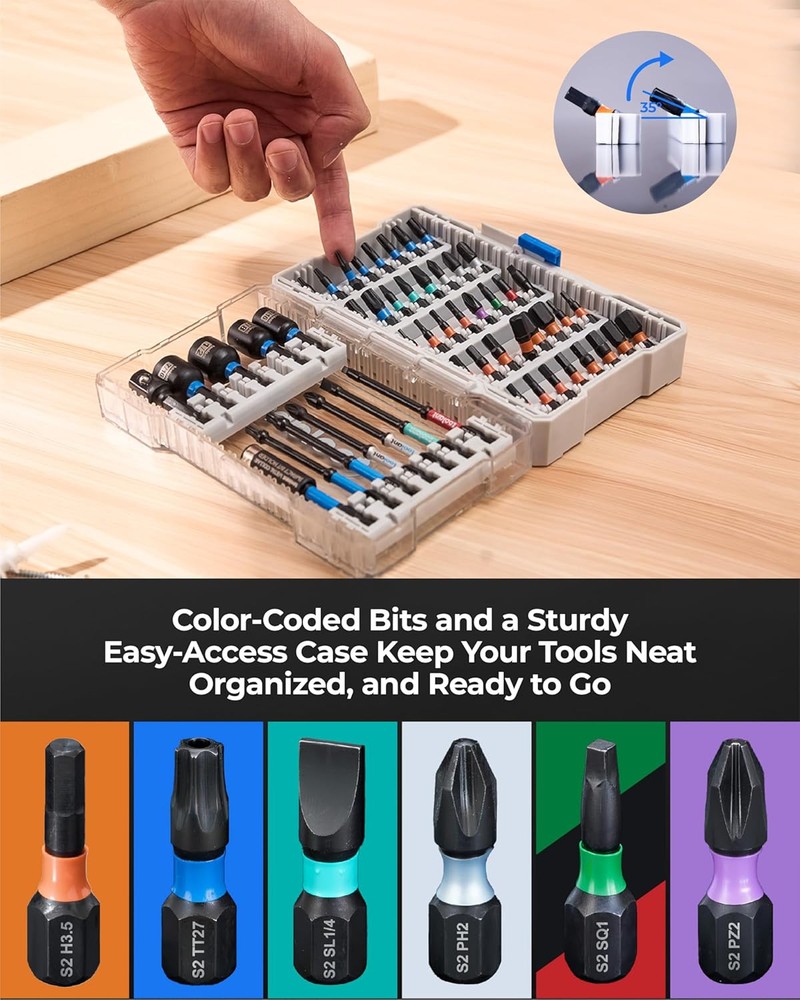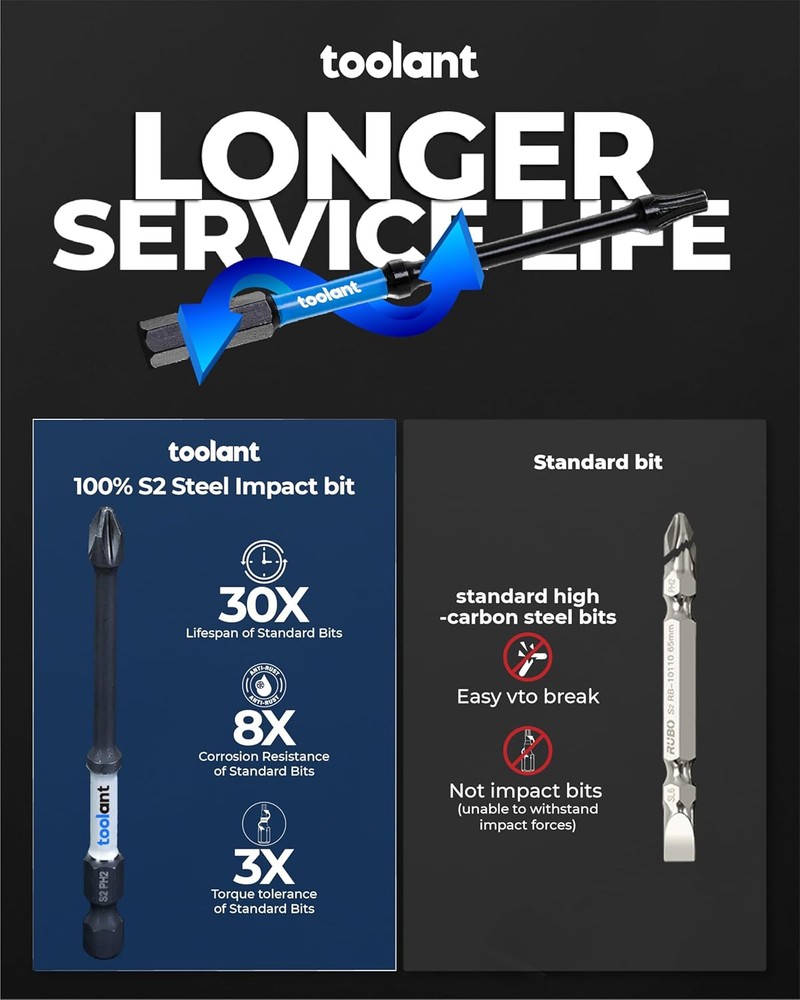 toolant Impact Driver Bit Set,52-Piece S2 Steel Screwdriver Bit Set,Hex,Torx,Phillips,Slotted,Square Bits and Nut Driver with Case Description Features: Complete range of products: The toolant impact driver bit set includes hex, torx, philips, SQ, SL, PZ screwdriver bits, nut drivers, bit holder and socket adapter, meeting the requirements for various screw fasteners.Compatible with all 1/4'' universal prower drills and impact drivers, such as Dewalt and Milwaukee Impact-resistant bits: The toolant impact bits are crafted using impact-resistant materials, capable of withstanding high torque, reducing the risk of breakage, and extending the lifespan well beyond that of standard bits.;Manganese Phosphate surface to prevent rust. Magnetic impact torx bits and nut driver helps you easy pick up screws.Magnetic bit holder can enhance the magnetic of 1" bits.The magnetism doesn’t decay after multiple uses. Easy identification: Different colors correspond to different types of screwdriver bits for easy identification. Additionally, each type in the set is marked with a colored ring following the toolant bit color-coding system for quick recognition. Thoughtfully designed:Screwdriver bit set with box for easy storage;Transparent box for clear visibility of contents, and a clip ensures secure closure. If you have any questions, please tell us and we will provide you with a solution Product Details: Manufacturer: toolant Item Weight: 1.57 pounds Package Dimensions: 8.86 x 8.66 x 1.34 inches Batteries Included?: No Batteries Required?: No Handling We will ship all orders within 3 business day of payment. Delivery We take pride in offering fast and reliable delivery for your orders! We are committed to getting your products to you as quickly as possible. Generally, we would like to inform you that all orders will be delivered to you within 1-3 business days after processing.However, in some cases, delivery times may vary depending on the buyer's location. Especially in remote or rural areas, the expected delivery time may be extended. In such situations, we do our best to ensure that your order reaches you as quickly as possible.If there are any delays, we will be happy to contact you to explain the situation. Our goal is to enhance your satisfaction with our fast delivery times. We work diligently to ensure that your order arrives safely.Trust us and enjoy our speedy delivery! Return Policy All items qualify for returns within 30 days of receipt. Buyer is responsible for return shipping on any item that is not damaged. Feedback We take our reputation seriously, we buy and sell online, so we understand the value of trust. If you are unsatisfied with your order, please contact us and we will work with you to resolve it to your satisfaction.