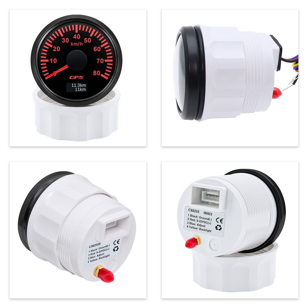 2" 52MM GPS Speedometer 0-80km/h Gauge for Motorcycle Boat Car Truck Waterproof 52mm Digital GPS Speedometer Speed Odometer Gauge 0-200Km/h for Car Boat Truck Specifications Item Name: 52mm GPS Speedometer Gauge 0-200Km/h Dial: Black Material: Stainless Steel 316L Bezel + Anti-fog Glass Install Diameter: Φ52mm or 2" Signal: GPS Working Voltage: 9~32V DC Working Current: ≤100mA Operating Temperature: -30℃ ~ 75℃ Storage Temperature: -40℃ ~ 85℃ IP67 waterproof and dustproof grade Indication Range: 0-200Km/h Backlight:7 Colors Backlight Product Descriptions High-brightness LED backlight. 316 stainless steel for long-term use even in acid-base, humid environment. IP67 waterproof and dust-proof grade. With curved glass( with anti-fog function). Suitable for all kinds of vehicle modification. Using stepper motor drive pointer, accurate display of the engine speed, and with the LCD display clear display mileage. Gauges have many kinds backlight color (red,yellow,orange,green,blue,purple,white),customers can adjust any color that you like. Connection: Black: Ground(-) Red: 9-32VDC Blue: Adjust Yellow: Backlight Package Includes: 1X 52MM Digital GPS Speedometer Gauge 1X Instruction 1X Wire Harness 1X GPS Antenna