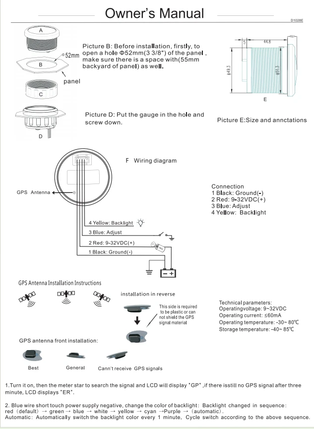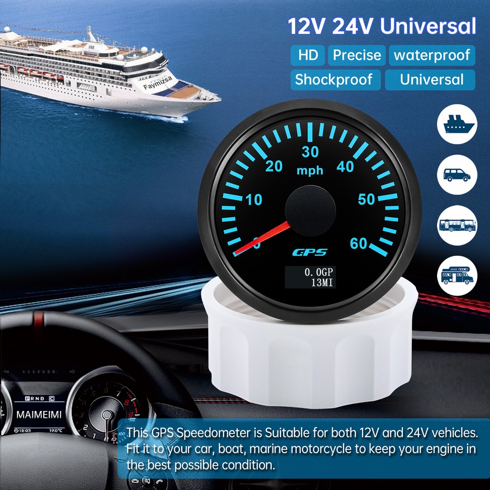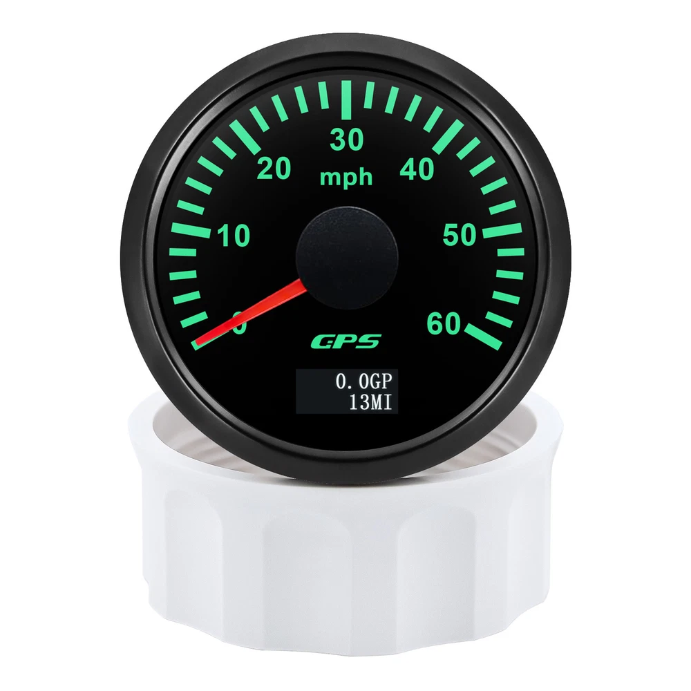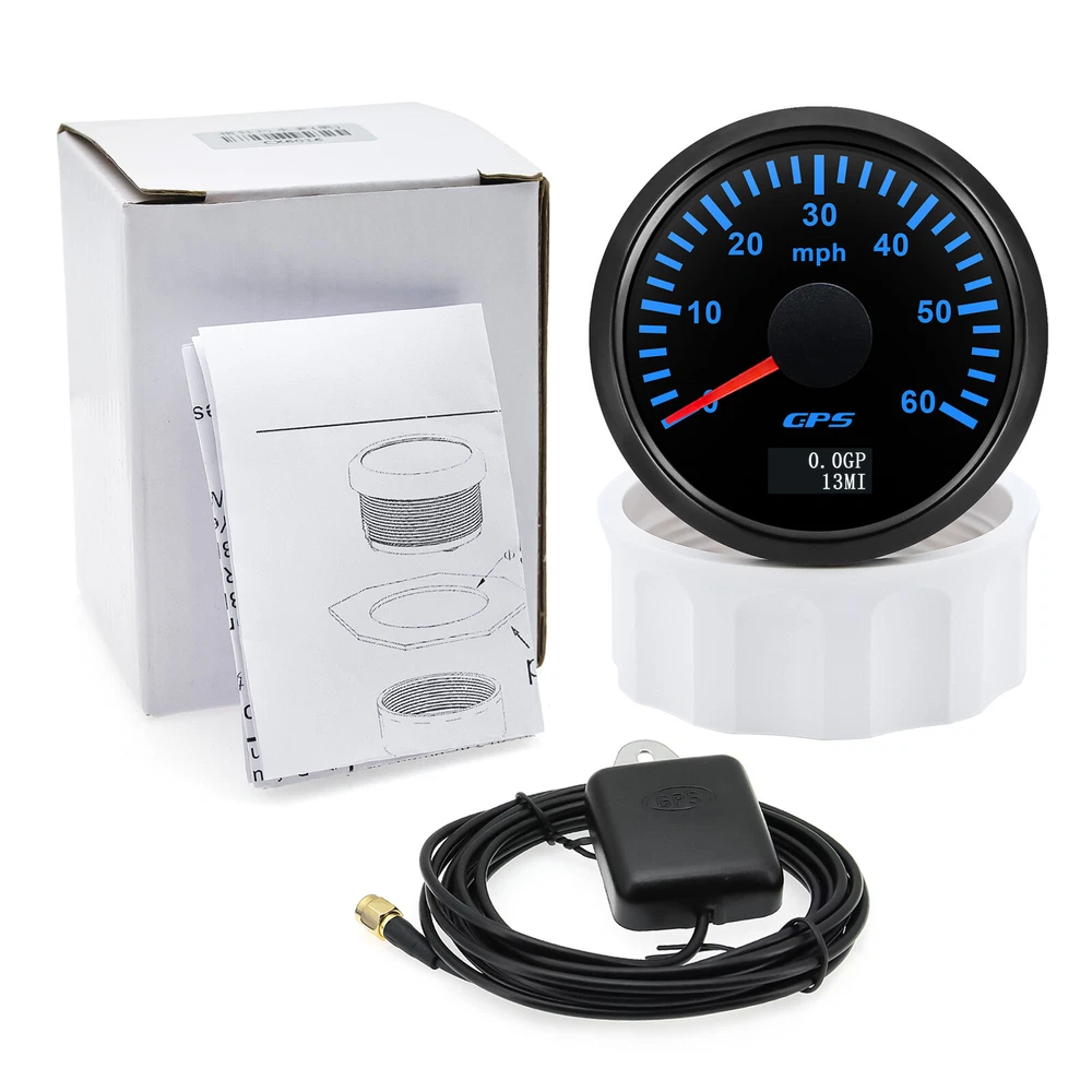 52mm Black GPS Speedometer Gauge 0-60MPH 7 Colors LED For Motorcycles Boat Car 52mm GPS Speedometer Gauge 0-60 MPH Speed Odometer Stainless Waterproof for Car Boat Truck Specifications: Name: GPS Speedometer Odometer Material: PVC+Stainless steel+Glass Panel Color:Black Backlight Color: 7Colors LED Fixing Dimension: 52mm(2") Working Voltage:9~32VDC Working Current: ≤100mA Operating Temperature: -30°~75° Storage Temperature:-40°~85° Levels Of Protection: IP67 Indicating Range: 0-60MPH Suitable for car truck boats off-roadvehicles boats Features: -Protection grade is IP67. -100% brand new and high quality -With polarity reverse protection function. -The durability is good, and the seismic performance is good. -Thesignal comes directly from the satellite signal receiver(GPS Speed Sensor) -The gauge has the advantages of high precision,quick location confirmation and short start up time. -With ultra-wide working voltage design(long-term operating voltage: 9~32V,Maximum up to:36V(≤ 1 min) Installation instructions: 1.Opening a hole in the panel (your cabin board and dashboard) with a diameter of 85mm,Insert meter into the hole,The panel corresponding to the instrument panel is marked with a convex table,and open a small notch in this location,To ensure that there is at least 85mm of the instrument panel at the back of the instrument. 2.After the instrument is mounted in the panel,Screw down with a fixed ring.Opening a hole in the panel (your cabin board and dashboard) with a diameter of 85mm,Insert meter into the hole,The panel corresponding to the instrument panel is marked with a convex table,and open a small notch in this location,To ensure that there is at least 85mm of the instrument panel at the back of the instrument. 3.Connect the wire,the instrument housing is directly connected to the 9~36V power supply. 4.Insert wire harness,Firmly locked in the table. Package List: 1 x GPS Speedometer 1 x Standard Cables 1 x GPS Receiver 1 x Installation Instruction