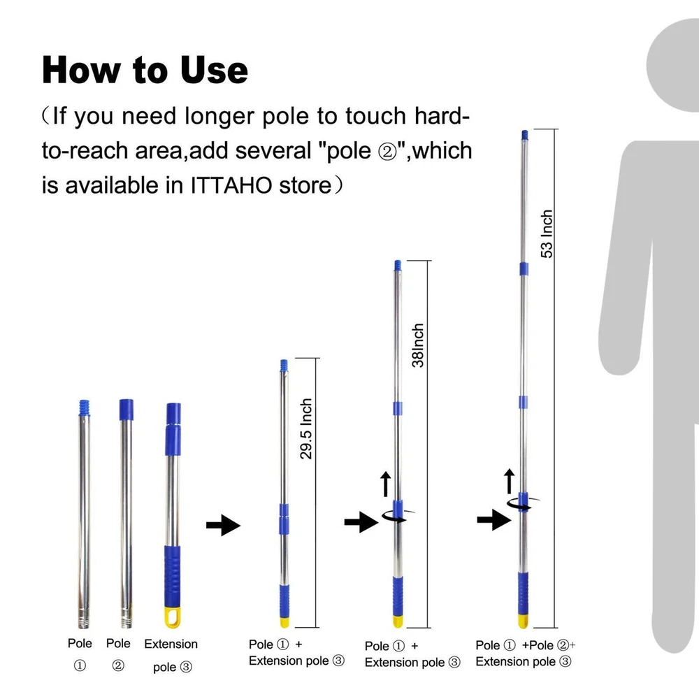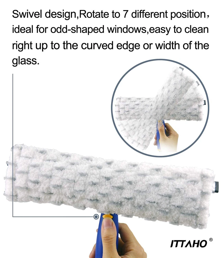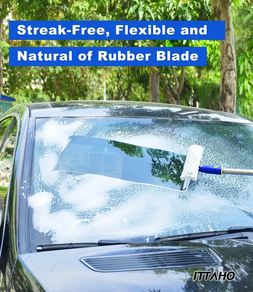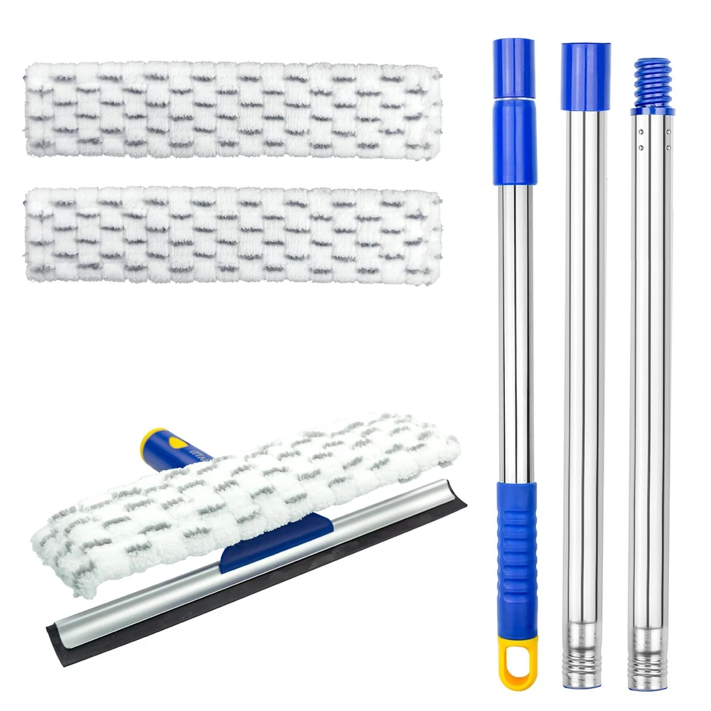 All-In-1 Window Cleaner Tool:Include 12 Inch window squeegee and 11 Inch microfiber scrubber in one unit with long handle.Natural rubber blade and special artwork of rubber provide you streak-free and squeak-free.The squeegee will effortlessly wipe away dirt and grime when combining with clean water and window cleaner.Thanks to 2-in-1 window squeegee,washing spot and wiping water,dont need to change the squeegee head. Desired for high windows, car windshield,shower glass doors Creative Swivel Design: What is the advantage of swivel design ? Not only for wide spaces, but also for narrow spaces. Press the yellow button to change the position of squeegee head,long handle squeegee enabling you to clean right up to width of the glass and the curved edge.A desired Spring cleaning tool for odd-shaped windows and narrow spaces.One outdoor window squeegee solve all window questions 53 Inch Long Sturdy Extenion Pole: Desired household window cleaning kit with 3 section of extension poles, you can adjust the length according to your needs.Easy to use Screw-on connection of pole. The stainless steel of pole is 30% studier than competitors. Not flimsy when cleaning high windows. All purpose squeegee window cleaner for auto,car windshield glass,household high window cleaning,indoor and outdoor,commercial and office cleaning Easy To Storage: Window squeegee with extension pole ,extension pole comes with rotating hook for convenient storage after finishing cleaning work. Re-usable microfiber scrubber support machine washable Easy To Storage: Window squeegee with extension pole ,extension pole comes with rotating hook for convenient storage after finishing cleaning work. Re-usable microfiber scrubber support machine washable