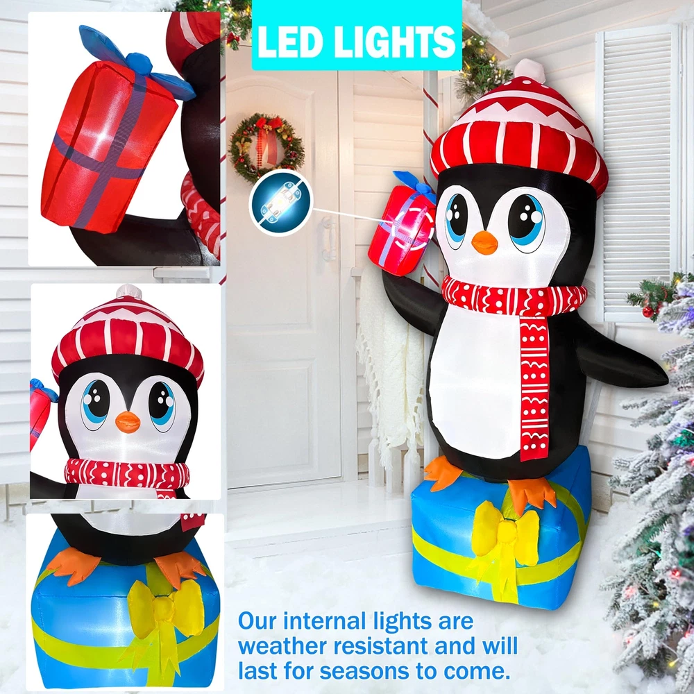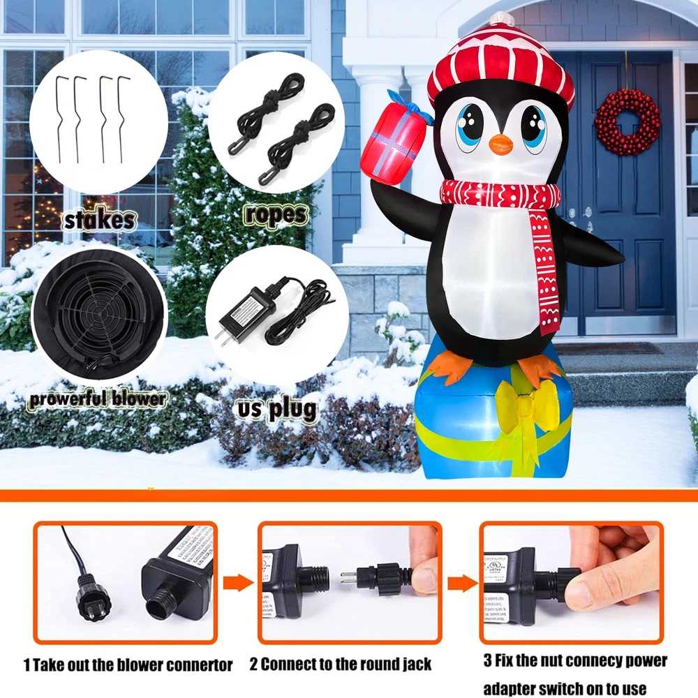 【5.5 FT Christmas Inflatable】Out Cute Penguin wearing hat standing on top of the gift is ideal christmas blow up decorations. The Christmas Inflatables will light up your home and welcome your lovely friend! 【Built-in LED light】Christmas inflatable outdoor decoration equipped with LED light, large and bright enough to illuminate the cheerful atmosphere of Christmas Night! Easy to spot! This inflatable outdoor holiday yard decorations would be an ideal host to welcome your Xmas guests. 【Stable Design & High-quality Materials】The inflatable christmas decorations are designed to be stable and inflatable during the holiday. The christmas blow up yard comes with ropes and stakes to ensure the stability of the inflatables. 【Inflated Quickly&Space-saving】Just plug this christmas inflatables decorations in, it has a built-in fan and in only seconds it will be fully inflated, then secure it to the ground. 【After Service】If you're unsatisfied or have any problems with Xmas Blow Up Yard Decoration please contact the seller through Amazon.