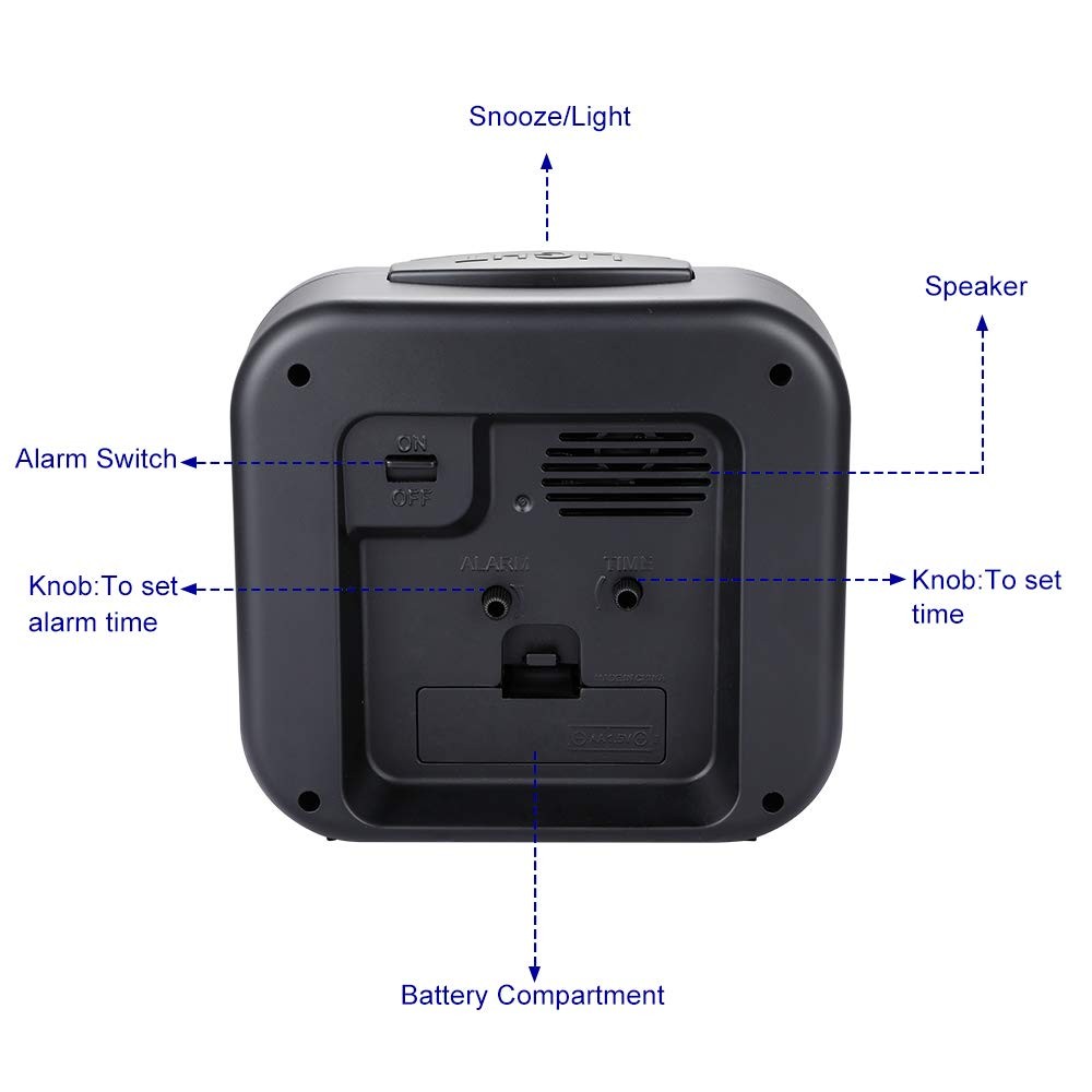 Large analog Alarm Clock Big and intuitive number display on a white dial enable you see the time across the room. Ascending Beep Alarm Ascending four beep alarm volume increases in four stages and lasts for 50 minutes until the alarm is turned off or snooze bar is depressed. Built In Nightlight Simply press the front button to activate for night viewing. Easy to Read Display, Easy to Setup Black numerals on a white dial enable you to see the time Easy. Easy to set up, One knob to set time and another to set alarm time . Made By High Quality Hard Plastic Made by high quality hard plastic ,durable and long last use. Package 1* alarm clock 1* User manual Large Size-- Size: 5.5" x 5.5" x 2.2". Alarm clock stands up at an angle, high quality plastic, square face with white dial, black Arabic numerals, good decoration for tabletop, desk & shelf, bedrooms. Also large size screen and clear bold digits to display time, perfect alarm clock for elderly. Completely Silent-- Super quiet concise design alarm clock without annoying tick tock sound, ideal for those who need complete silence to fall asleep. Snooze and Manual Light-- Snooze and light button locates on easy-to-find top place. Hold button down for 5 minutes snooze or to light up the clock face on demand to see the dial momentarily in the darkness. PRESS TO LIGHT- NO auto-light. Gentle Wake Increasing Volume-- Classic beep alarm sounds, designed to ascending four stages for gentle wake at first, then ascend in volume with more and more hurried sounds, which last for nearly 1 hour or stop/suspend when alarm is turned off or snooze bar is depressed. Battery Powered-- Runs on 1 "AA" Battery (not included ).