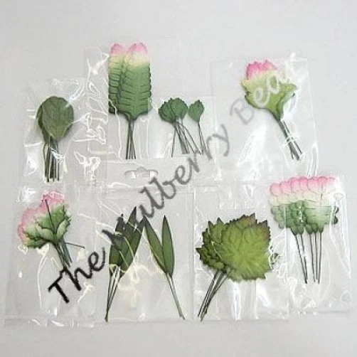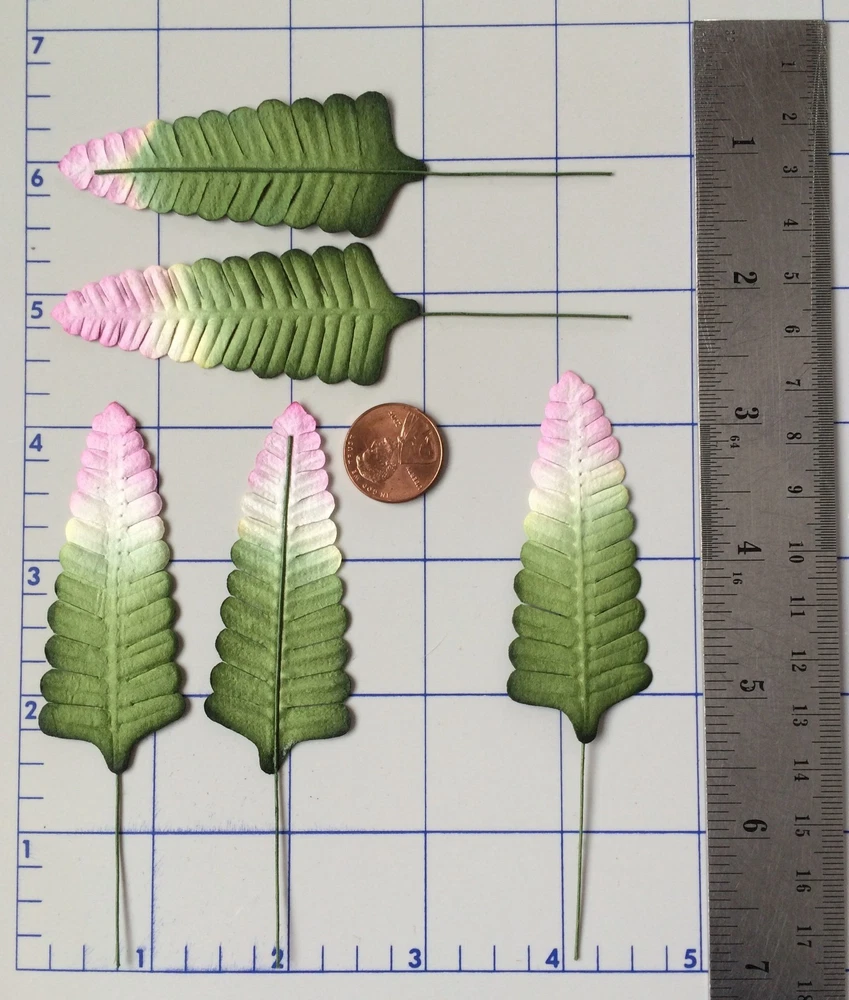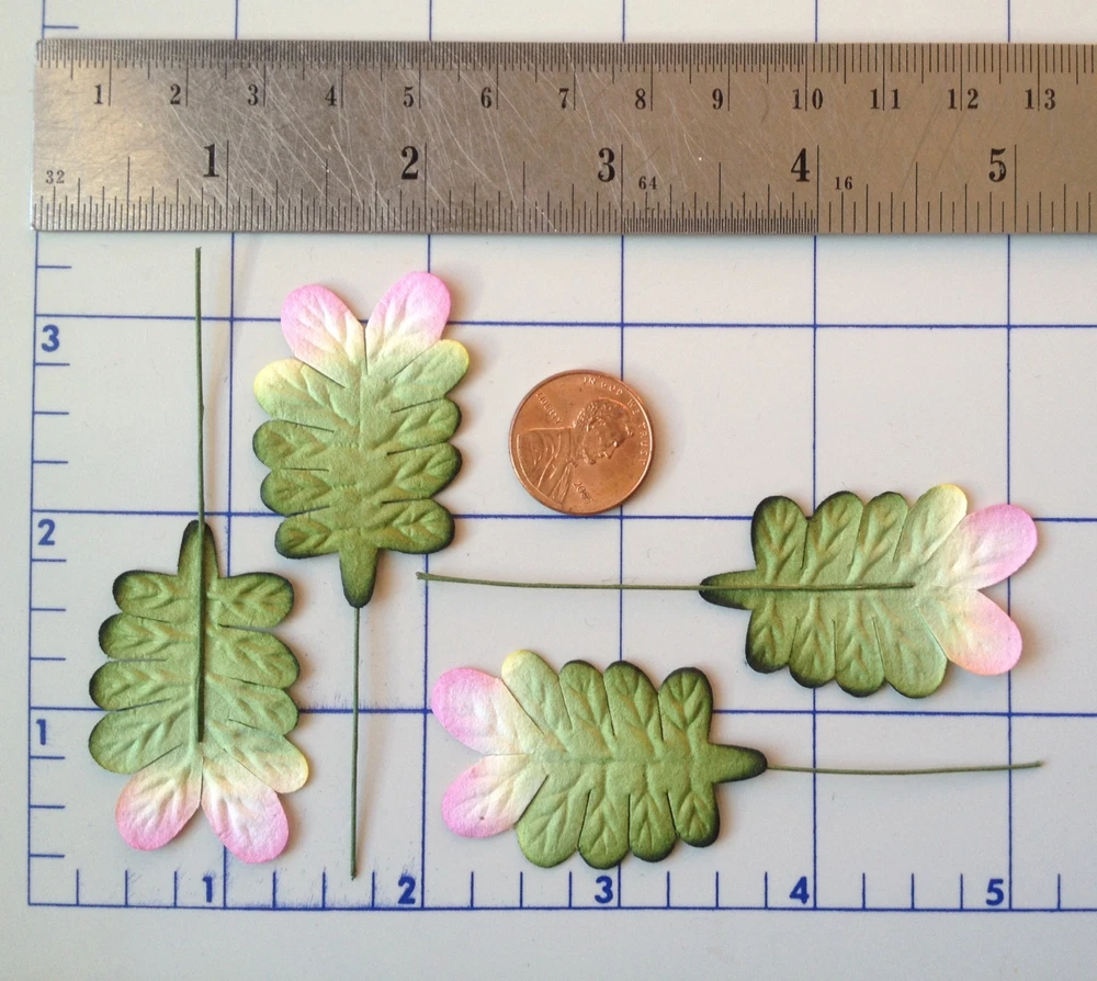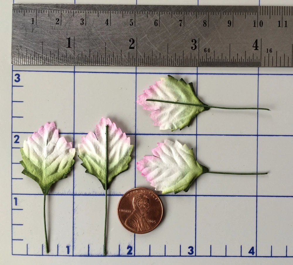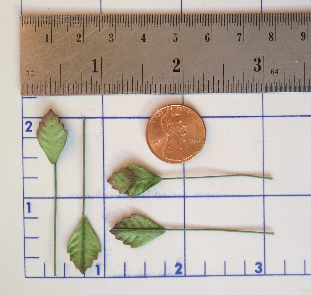 55 assorted leaves. These leaves are packaged separately by style. The leaves range in size from approximately 1 1/8"-2 3/4" in length, excluding the wire stems. Photo 3- Quantity 5 leaves. Approximately 3 13/16" (4.6cm) long x 5/16" (8mm) widest point. Photo 4- Quantity 10 leaves. Approximately 1 1/4" (3.2cm) long x 15/16" (2.4cm) widest point. Photo 5- Quantity 5 leaves. Approximately 1 3/4" (4.5cm) long x 1 3/4" (4.5cm) widest point. Photo 6- Quantity 10 leaves. Approximately 5/8" (1.7cm) long x 7/16" (1.1cm) widest point. Photo 7- Quantity 5 leaves. Approximately 1 11/16" (4.3cm) long x 1 1/16" (2.7cm) widest point. Photo 8- Quantity 5 leaves. Approximately 2 1/8" (5.3cm) long x 1 5/16" (3.4cm) widest point. Photo 9- Quantity 10 leaves. Approximately 1 1/8" (3cm) long x 15/16" (2.4cm) widest point. Photo 10- Quantity 5 leaves. Approximately 2 3/4" (7cm) long x 1 1/16" (2.7cm) widest point. Mulberry paper is acid and lignin free and suitable for long lasting projects.