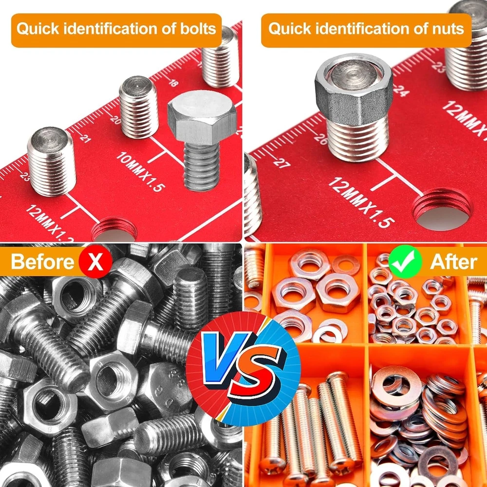 Upgraded 36 Thread Gauge Sae and Metric: Have you ever had to repeatedly dash to the hardware store, just to determine the right bolt or nut size? Now, say goodbye to guesswork with our nut and bolt thread checker. our bolt size and thread gauge covers a wide range, encompassing 17 metric thread sizes from m2 x 0.4 to m14 x 2.0, as well as 19 standard threads, spanning from 2-56 to 5/8 -18 fine. This thread checker should become a must-have tool for your garage, workshop or home storage room Upgraded 19 Drill Bit Gauge: When faced with a bunch of different sizes of bits that are hard to distinguish, our upgraded 19-in-1 Drill Gauge Set is the ideal choice. It includes 6 metric (4mm, 6mm, 8mm, 10mm, 12mm, 14mm) and 13 imperial (1/16“ to 1/2”) drill gauges to ensure you find the size you need quickly and accurately. With a compact design, scales and pre-drilled holes on both sides for easy wall mounting, placement or storage, this thread checker is a handy addition to your toolbox Excellent Quality Screw Thread Gauge: Our bolt identifier board are CNC machined from anodized 6601 Aluminum, and the bolts are made from high quality steel, machined with extreme precision to ensuring each bolt and thread complies with the Go & No Go Class 2B ANSI Standard gauge Precise and clear marking: The bolt identifier board is designed with white lettering on a red background and laser-etched imperial and metric dimensions underneath the bolts and nuts, which are clear and easy to read, making identification of various thread sizes fast, accurate and easy Your must-have Thread Checker Tool: This nut and bolt thread checker is an indispensable tool and gift choice for professionals and a white elephant gift for adults. Its one-piece design ensures that all parts stay securely and organized on the tool, eliminating the worry of misplaced or tangled parts. Whether you are an auto mechanic, carpenter, welder, plumber or shop technician, this comprehensive set of bolt size and thread gauge will be your most reliable companion