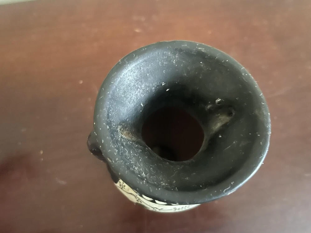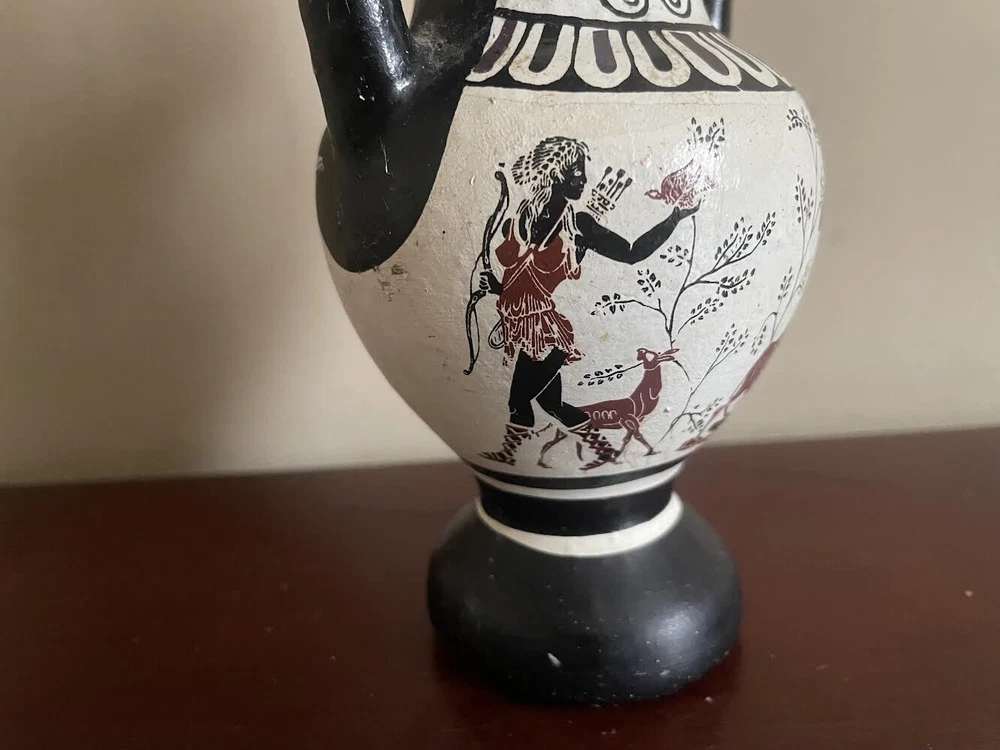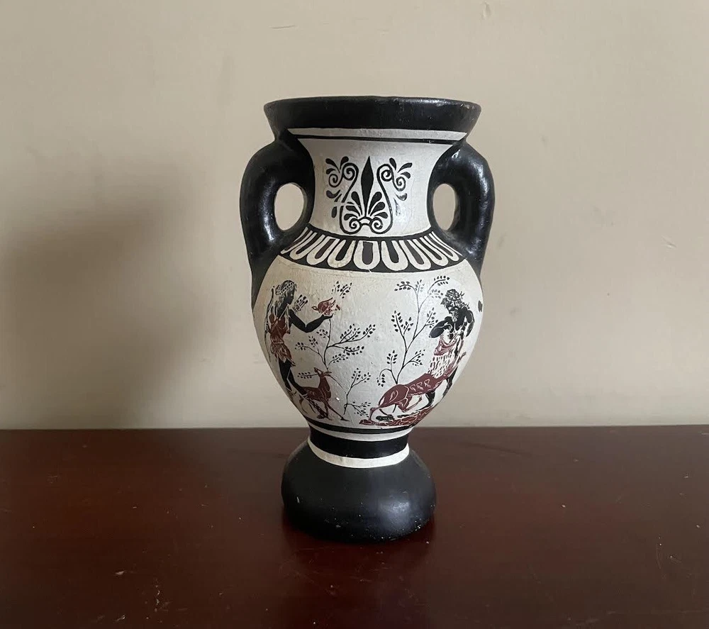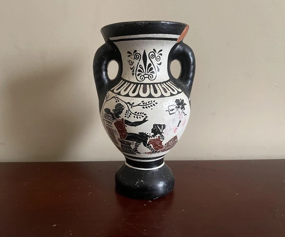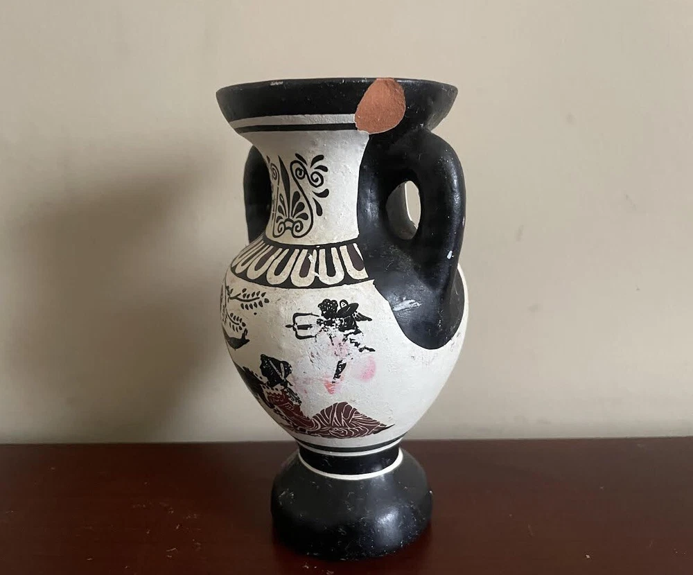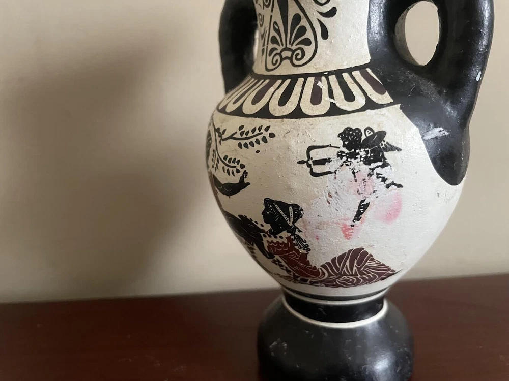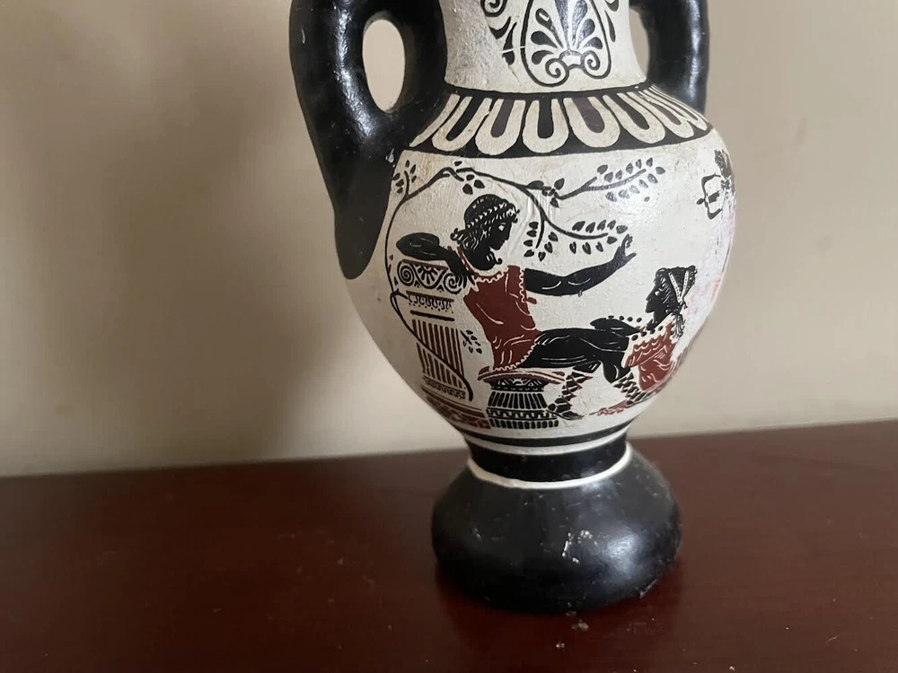 VASE HAS MINOR DAMAGE AND A SMALL CHIPPED PIECE. PLEASE CHECK PHOTOS!! This vintage vase is a beautiful piece of art hand-painted in Greece. Measuring 5.5 inches in length, it is the perfect size for display in any room. The multicolor design adds a touch of elegance to any decor. The vase is made in Greece, adding to its unique and authentic charm. It is a great addition to any collection, and its features include a hand-painted design. This vase is perfect for those who appreciate vintage art and want to add a touch of sophistication to their home.