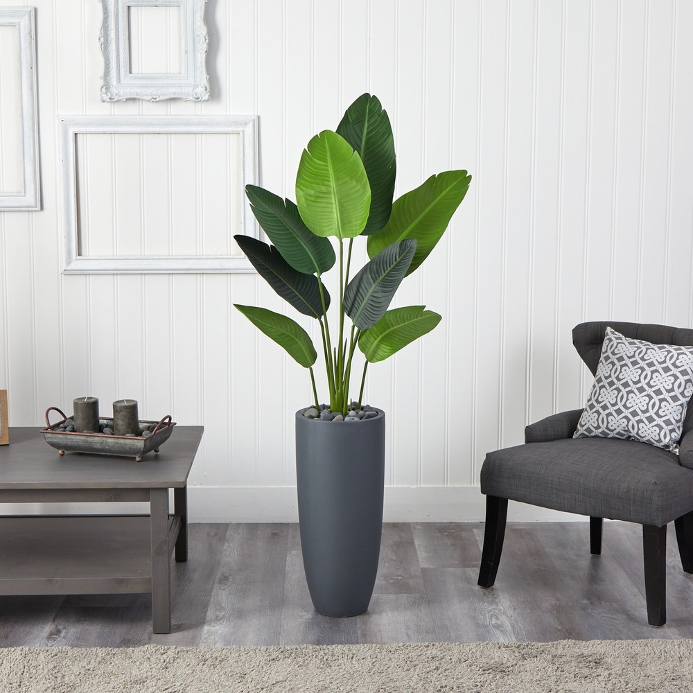 Made with close attention to detail, the green foliage of the traveler's artificial palm tree is large and ample in appearance--much like the leaves found in nature that are known to collect rainwater. It comes with a complementary, modern gray cylinder planter that makes it a perfect addition to an office setup. Place it next to a storage unit, book shelf, or a desk with dark vases for a sleek finish. Silk trees are manufactured using synthetic materials, such as polyester material or plastic, and are well designed and constructed to be life-like in appearance. This item will need to be re-shaped when removed from the secure box to allow it to reach its fullest size. Your artificial tree will look beautiful for years to come; simply wipe clean with a soft dry cloth when needed. Free Shipping Over $49.99* Details 5.5' Traveler's Palm Artificial Tree in Gray Planter - Green - h5.5 ft. w28 Product Description: Made with close attention to detail, the green foliage of the traveler's artificial palm tree is large and ample in appearance--much like the leaves found in nature that are known to collect rainwater. It comes with a complementary, modern gray cylinder planter that makes it a perfect addition to an office setup. Place it next to a storage unit, book shelf, or a desk with dark vases for a sleek finish. Silk trees are manufactured using synthetic materials, such as polyester material or plastic, and are well designed and constructed to be life-like in appearance. This item will need to be re-shaped when removed from the secure box to allow it to reach its fullest size. Your artificial tree will look beautiful for years to come; simply wipe clean with a soft dry cloth when needed.