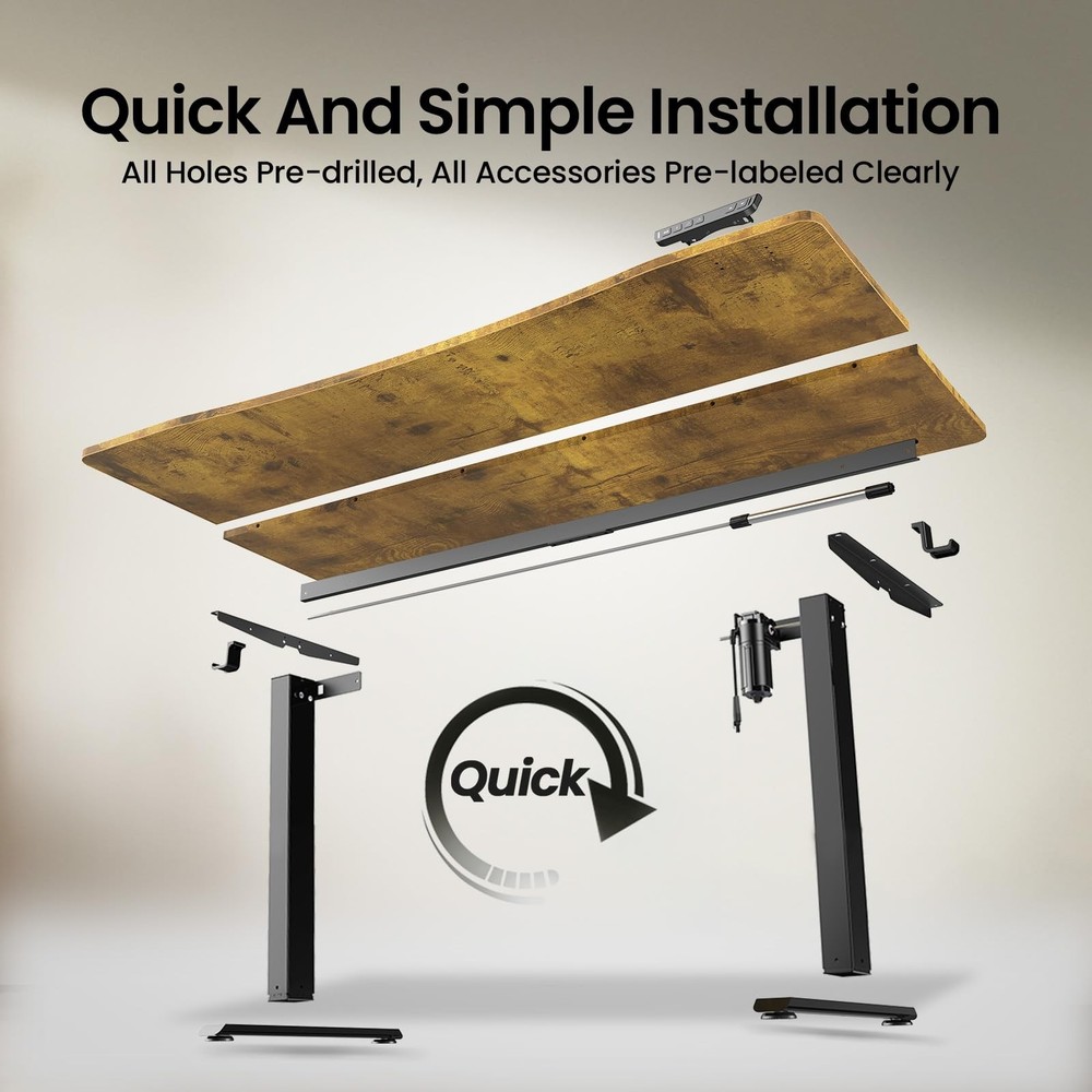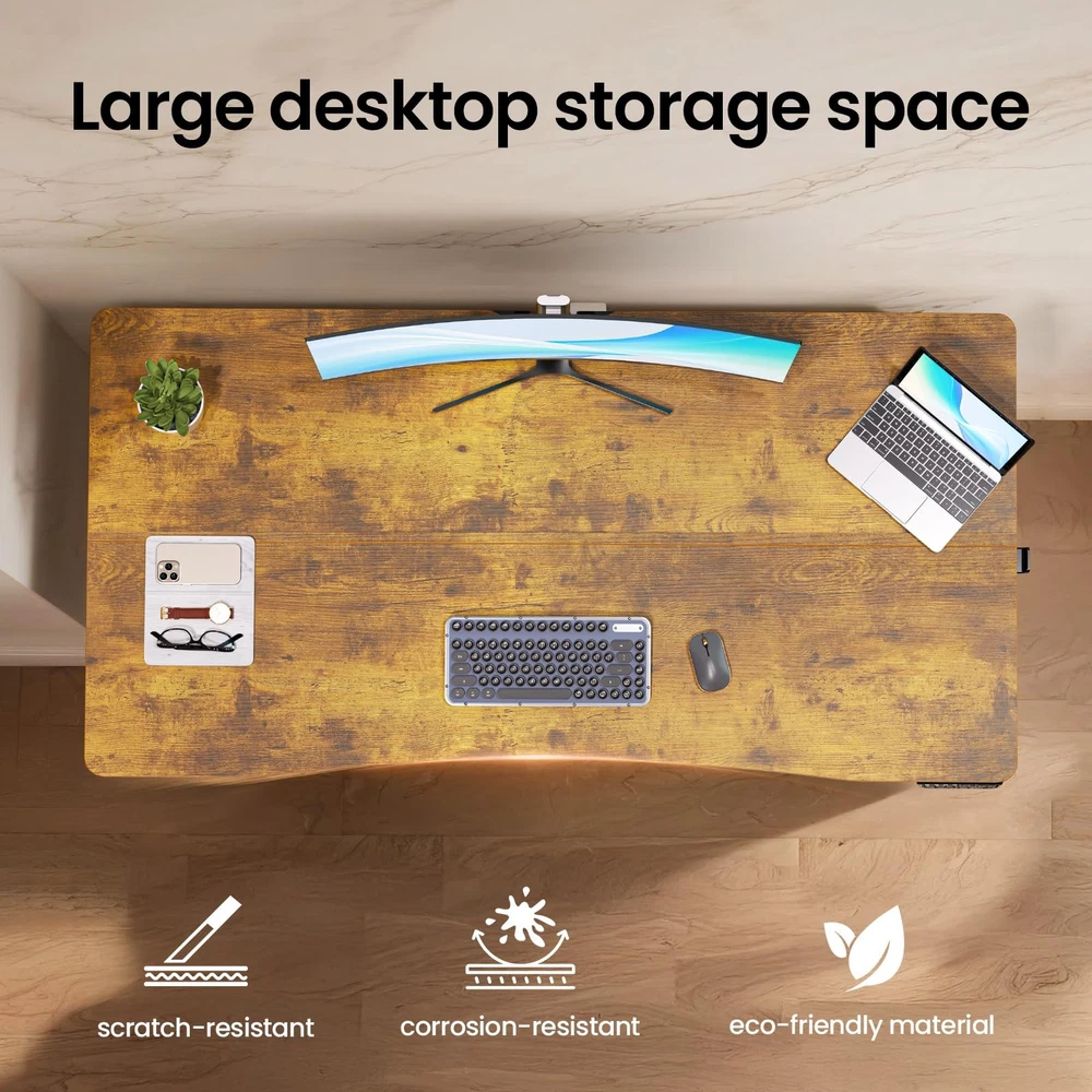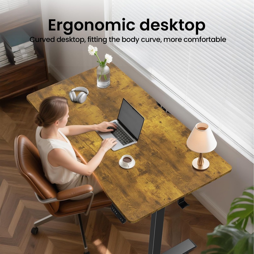 【Friendly Remind】This standing desk is built with joined pieces (not whole) . Spacious Worksurface: With its expansive 55" x 28" desktop, this standing desk effortlessly accommodates multiple monitors and office supplies, providing ample space for an organized and efficient workflow. Ergonomic Curved Edge: Designed with a smooth, human-centric curved edge, it reduces arm strain and allows easy access to items, enhancing comfort and productivity during long work hours. Rock-Solid Stability: The reinforced structure ensures exceptional stability and shake-operation, even at full height, keeping you focused without distractions. Heavy-Duty Metal Frame: Constructed with premium steel, the desk legs offer robust load-bearing capacity and long-lasting durability, supporting your daily work needs reliably. Smooth Height Adjustment: Easily switch between sitting and standing with a wide height range from 27.9" to 45.6", promoting movement and reducing fatigue throughout the day.