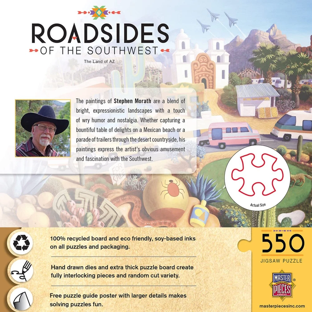 These 24" x 18" 550PC Roadsides puzzles are created by the talented Steven Morath. Tucson Arizona shimmers in the desert sun. Whether capturing a bountiful table of delights on a Mexican beach or a parade of trailers through the desert countryside, his paintings express the artist's obvious amusement and fascination with the Southwest. To reduce their impact on our environment, the chipboard used in these puzzles is made of recycled material. For 25 years, has enjoyed making quality jigsaw puzzles, games, toys & Works of Ahhh craft kits. Innovation and premium quality is the hallmark. We pledge to always provide earth friendly products. Our puzzles are made from recycled paper and soy based inks. Green is not just a color, it’s a commitment. Matte Finish – Our matte finish helps reduce glare for an improved puzzling experience. Random Cut - All puzzles have varying shapes to create a variety with tight and thick interlocking pieces. Ensuring a variety of challenges with every puzzle! The perfect way to keep game night fun. Environmentally Friendly - Our puzzles are made from 100% recycled material and non-, soy-based inks for eco-friendly fun! Bonus Poster - This puzzle comes with a poster for a large and detailed view to help guide puzzlers through solving this puzzle. We create puzzles using a thick puzzle board in a wide variety of piece counts for both children and adults to enjoy! Quality - is an American Puzzle & Game Company. We support you with our missing piece 100% . If you have any questions, you can us directly for additional support.