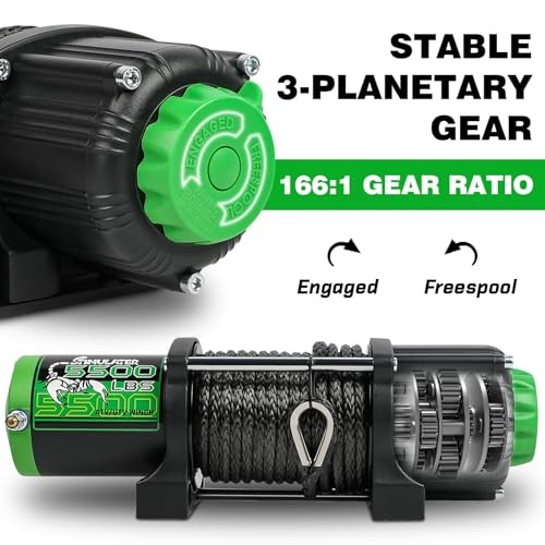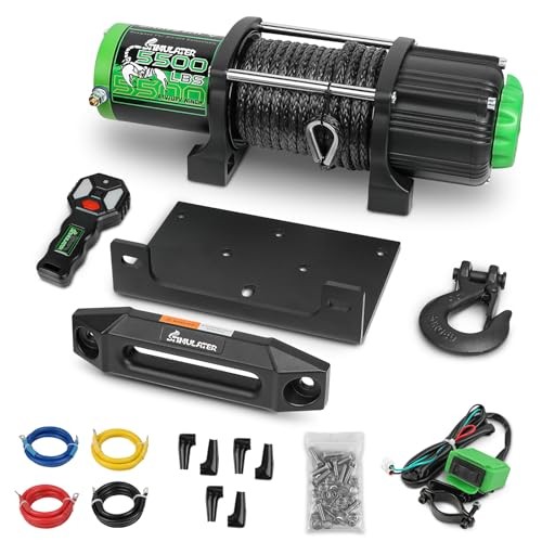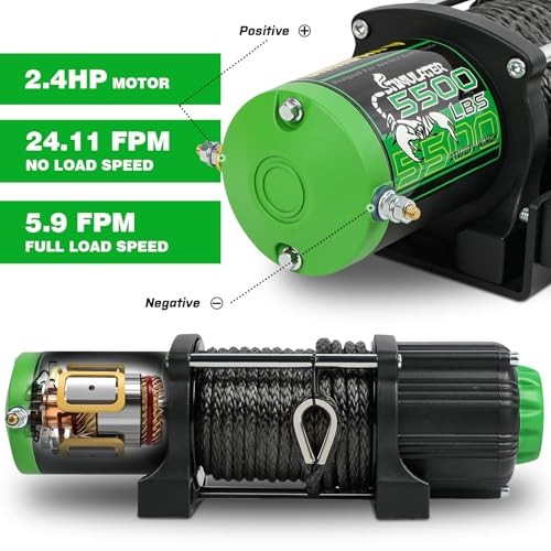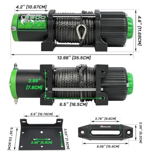 5500Lb ATV UTV Electric Winch 12V with Synthetic Rope Wireless Remote Wired Switch Hawse Fairlead Hook Waterproof for Most ATVs and UTVs 5500Lb ATV UTV Electric Winch 12V with Synthetic Rope Wireless Remote Wired Switch Hawse Fairlead Hook Waterproof for Most ATVs and UTVs 12V DC motor with 1.79KW/2.4HP output delivers a maximum line pull of 5500lb for efficient operation. Designed for use in challenging conditions such as mud, rain, rocks, and sand without performance loss. Easy to install with detailed instructions; compatible with most ATVs, UTVs, boats, cars, trucks, and utility vehicles. Wireless remote control operates within an 82ft radius, with an optional wired remote for added flexibility. Features Dyneema synthetic rope, 3-stage planetary gear system, and IP-67 rated waterproof, corrosion, and UV resistance.