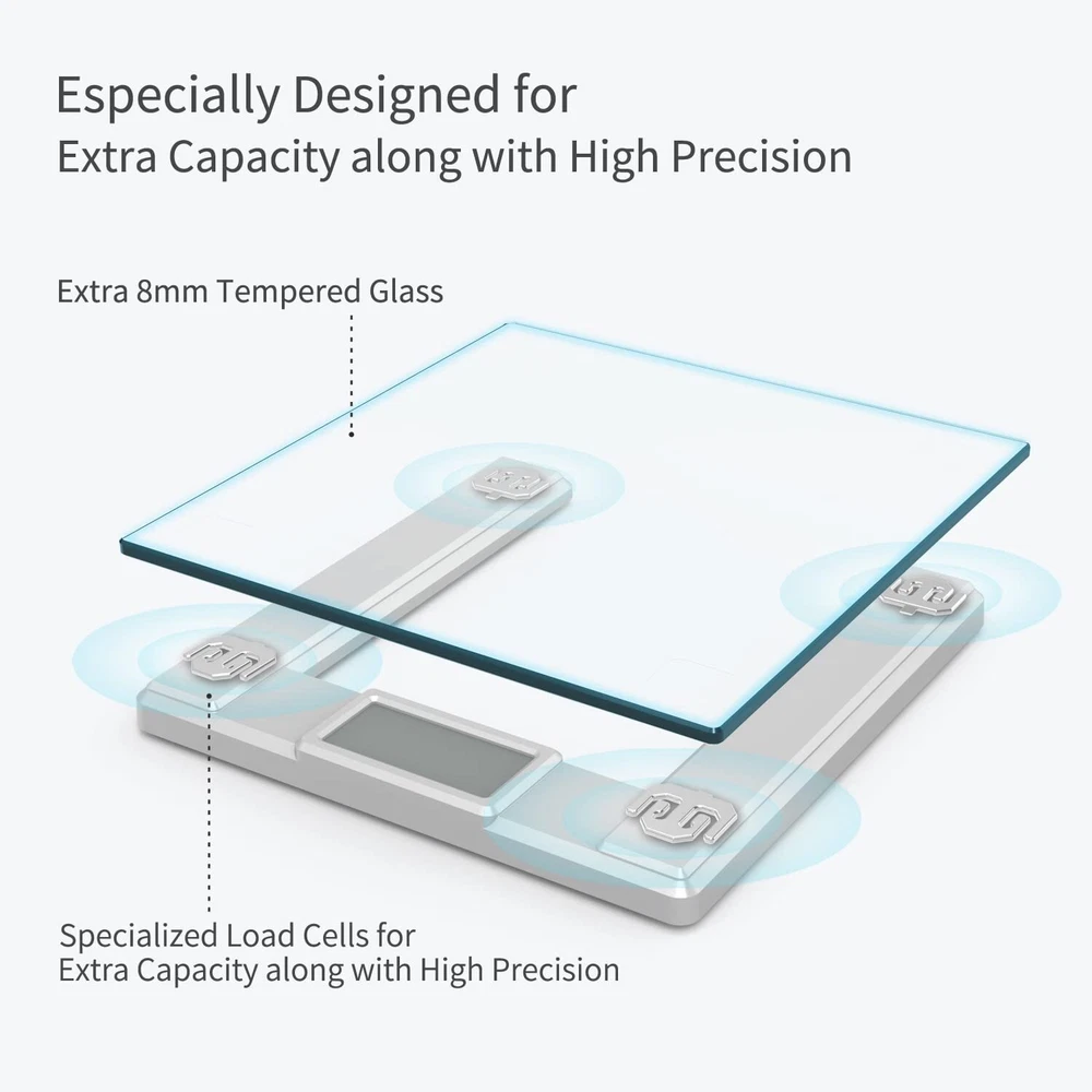 AMAZING ACCURACY UP TO 550LB/250KG - Benefiting from over 20years scale professional experience, we made the scale with best-in-class technology and expertise, and proudly guarantee high accuracy in 0.1lb/0.05kg increments up to extra-high capacity: 550lb/250kg/39st6lb. EASY SETUP AND PRIVACY - The smart bathroom scale is not only super convenient setup for yourself, but also for your family and friends to create unlimited users. All user data of App are secured and stored in US and EU Cloud Server via AWS(Amazon Web Services). We protect your personal privacy by best-in-class standard. SMART WEIGHT AND BMI TRENDS -The premium friendly app clearly put forward the weight and BMI trends after body weight measuring. Conveniently share your progress on major social media by one touch. And seamlessly sync your data with apps including Apple Health, Google Fit, and Fitbit after your permission. Please enjoy your healthy journey. ORIGINAL DESIGN - The smart weight scale is our original design with the idea: Extra Sturdy and Precise, along with the superb comfortable size 12.6 x 12.2in (320x310mm) tempered glass in superb 8mm thickness. Our whole team sincerely wishes it is not only the perfect scale for your fit, but also the perfect decoration for your power. BEYOND OUR SMART SCALES - Our factory was established in 2001. Our first-class quality and social management system has been certified by ISO and Social Accountability. All products are supported by our US customer service center in the heartland state Missouri. : Inspired by Life, for Better Life.
