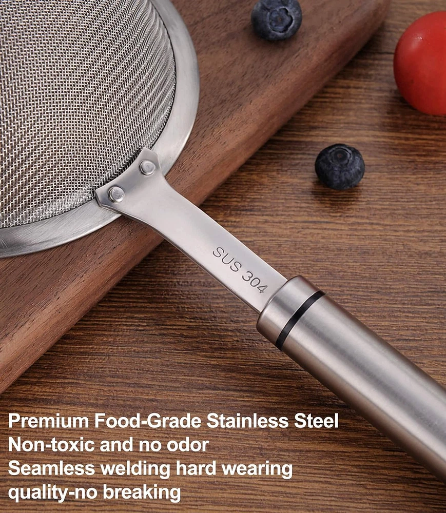 Food-Grade 18/8 Stainless Steel: INCLUDED: 5.5″skimmer spoon. Made of premium 304 stainless steel, which is known for its excellent rust resistance and durability. Built to Last: Feature broad rimmed framework design and rivet connection technology makes the fine mesh strainer more robust and not easy to loosen. 30-Mesh Fine Mesh with No Burrs: Allows for easy filtering and sieving various ingredients, such as tea, coffee, rice, milk, cocktails, sugars, pasta, flour, fruits, vegetable, Oil,juice,making your food smoother and more refined. Easy to Clean: The fine mesh design allows for easy cleaning. Hand wash or Dishwasher safe. Easy to Store: Top quality kitchen utensils. Lightweight enough to store in a kitchen cupboard or hang up for easy access. Instructions: 1.Before using the Fine Mesh Strainer, please clean it first. 2.Pour the ingredients that need to be filtered into the Fine Mesh Strainer. 3.Gently shake the Fine Mesh Strainer to let the ingredients pass through the fine mesh. 4.Take out the filtered ingredients and clean the strainer with soap and water. The Fine Mesh Strainer is a must-have kitchen tool suitable for filtering and sieving various ingredients. Made of food-grade 18/8 stainless steel, this product is known for its excellent rust resistance and durability. The 30-mesh fine mesh design allows for easy filtering of tea, coffee, rice, milk, cocktails, and other ingredients, making your food smoother and more refined. The product is easy to clean and suitable for various kitchen tasks, such as cooking, baking, and cocktail making. With the Fine Mesh Strainer, your cooking experience will be more enjoyable!