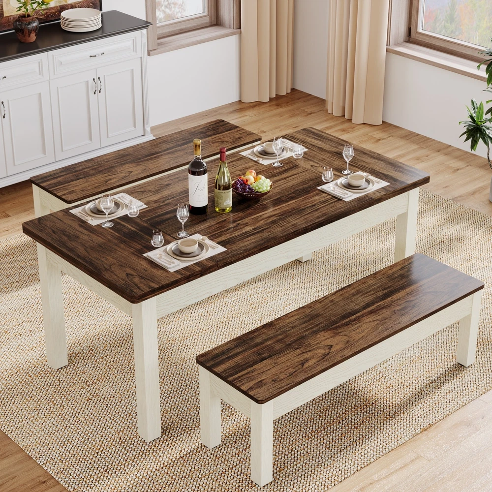 Embrace the rustic charm of the wood kitchen table and benches, which bring warmth and character to your space. The spacious seating of this dining table set creates a cozy atmosphere for mealtime, allowing you to share family experiences. Whether it's a casual breakfast or a festive dinner, this set will provide a welcoming environment in your home.Features: The kitchen table comes with 2 benches and one of the benches can be easily stored under the table when not in use. This space-saving design allows it to comfortably accommodate 4-6 people without taking up too much room. Made of high-quality engineered wood, this rectangle kitchen table set is built to last. The thick table legs provide strong load-bearing capacity and stability, ensuring worry-free enjoyment of your meals. Free Shipping Over $49.99* Details 55-Inch Dining Table Set for 4-6, Wood Kitchen Table with 2 Benches Product Description: Embrace the rustic charm of the wood kitchen table and benches, which bring warmth and character to your space. The spacious seating of this dining table set creates a cozy atmosphere for mealtime, allowing you to share family experiences. Whether it's a casual breakfast or a festive dinner, this set will provide a welcoming environment in your home. Features: The kitchen table comes with 2 benches and one of the benches can be easily stored under the table when not in use. This space-saving design allows it to comfortably accommodate 4-6 people without taking up too much room. Made of high-quality engineered wood, this rectangle kitchen table set is built to last. The thick table legs provide strong load-bearing capacity and stability, ensuring worry-free enjoyment of your meals. The dining table set is carefully designed with rounded corners to reduce the risk of accidental bumps or injuries during daily use. The matching adjustable foot pads make it easy for the table to adapt to uneven floors, making it convenient for daily use. Our dining table set is not just for meals, it's a versatile centerpiece. Its size and simple design make it a seamless fit for various rooms such as kitchens, dining rooms, living rooms, apartments, and more. Our dining room table set has a simple assembly process, eliminating concerns about complex instructions. You can quickly assemble the set and enjoy a meal with your loved ones. Specification: ColorBrown&White MaterialParticleboard Product Size55.11" L x 27.56" W x 29.52" H (Bench45.86" L x 13.77" W x 17.71" H) Product Weight110.23 lbs Package Include1 * Dining Table Set, 1 * User Manual, 1 * Hardware Assemble RequireYe