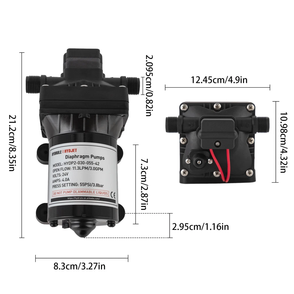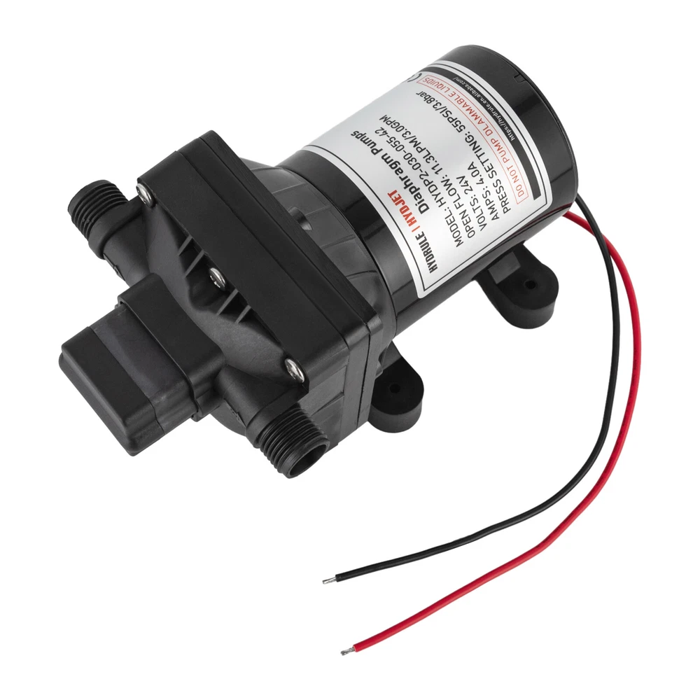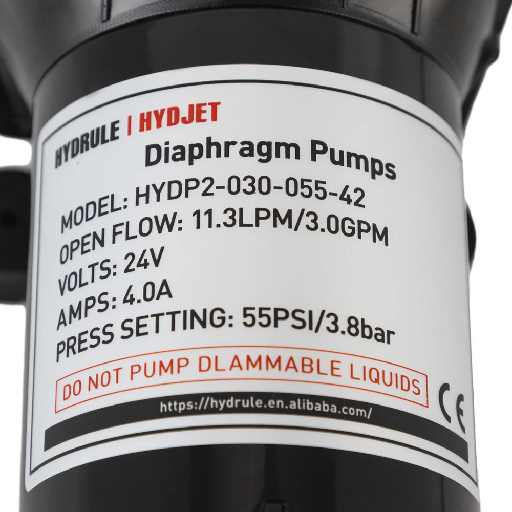 Specifications Color: Black Process: Painting Material: ABS+EPDM Motor: Pure Copper Motor Assembly Required: Yes Control: Pressure Switch Model: HYDP2-030-055-42 Max. Temperature: 60°C/140°F Voltage: 24V Current: 4.0A Noise: 70-80dB Suction Range: 3m/9.84ft Pressure Setting: 55PSI/3.8Bar Flow Rate: 11.3LPM/3.0GPM Port: 1/2" -14MNPT Gross Weight: 2.25kg/4.96lbs Package Size: 26*15*13cm/10.24*5.91*5.12inch Product Size: 21.2*8.3cm/8.35*3.27in Package Included 1* Water Diaphragm Pressure Pump Other Accessories for Installation 55PSI 24V Diaphragm Self-priming Pressure Pump Booster Sprayer For RV/Marine Description A high-performance water diaphragm pressure pump can significantly enhance the functionality and utility of your caravan or yacht, transforming it into a maritime or road-trip sanctuary of efficiency and convenience. This sophisticated piece of equipment possesses the prowess to efficaciously draw water from tanks and elevate pressure levels, thereby ensuring a seamless flow and reliable supply wherever your adventures may take you. Key Features Build to Last : The product is made of high-quality ABS+EPDM and adopts a painting process, making it solid, and not prone to rust and corrosion, so it can keep beautiful and practical for a long time. High Efficiency: The pure copper motor, 11.3LPM/3.0GPM flow rate, and 55PSI pressure will accommodate 3-4 faucet water supplies and make your pumping faster and easier. Safety Guard: It has overheating protection, overload protection, and grounding protection, automatic start/stop, which guarantees the stability of the product's operation and at the same time ensures safety when using it. Economical and Practical: With it , you'll be able to extract water better and increase pressure levels, which can be extremely convenient and cost-effective for you for living. Easy to Clean: The simple construction, smooth surface, and stain-resistant black color allow you to clean it with a damp rag. Simple Installation: With complete accessories and simple construction, you can put it together yourself and put it to use right away! Protective Package: Our product is packaged with air bubble bags to maximize protection from damage during shipping. Customer Service: We aim to provide quality products and services. If you have any problems, please feel free to contact us. We will reply and solve the problem for you as soon as possible. Details Stable Base: The rubber base can better maintain the stability of the product and ensure smoother operation. Standard Port: It uses a 1/2" -14MNPT large diameter port, which makes it practical to match different types of water pipes. Application It can be used for caravans, agricultural irrigation, yachts, dishwasher boosters, equipment water cooler pressurization, water purification machines, shower booster, and more. Specifications Color: Black Process: Painting Material: ABS+EPDM Motor: Pure Copper Motor Assembly Required: Yes Control: Pressure Switch Model: HYDP2-030-055-42 Max. Temperature: 60°C/140°F Voltage: 24V Current: 4.0A Noise: 70-80dB Suction Range: 3m/9.84ft Pressure Setting: 55PSI/3.8Bar Flow Rate: 11.3LPM/3.0GPM Port: 1/2" -14MNPT Gross Weight: 2.25kg/4.96lbs Package Size: 26*15*13cm/10.24*5.91*5.12inch Product Size: 21.2*8.3cm/8.35*3.27in Package Included 1* Water Diaphragm Pressure Pump Other Accessories for Installation Notes Please note that the product will be tested before leaving the factory, so the product with a small amount of residual moisture is a normal phenomenon. For use in environments with sewage, please be sure to install a filter at the water inlet for use! Please allow the slight color difference caused by the shooting light and 1-3cm error due to manual measurement, and make sure you do not mind before ordering. Payment Delivery details Terms of sales About us Contact us Payment We accept ebay payment 。 Fees such as import duties, taxes are not included in the item price or shipping costs. These charges are the buyer's responsibility. Delivery details Shipping: 2-9 working days to: USA Terms of sales We maintain high standards of excellence and strive for hundred percent customer satisfaction. Feedback is very important to us. We hope that you contact us immediately before you give neutral or negative feedback, so that we can address your concerns. It is impossible to address issues if we do not know about them! About us Your satis faction is our ultimate goal. We work hard to earn your trust and future business. Our certified technicians have tested each item before shipping. The unit comes with 1 year limited warranty on all manufacturing defects. a) If you receive a defective item, you may return it or ask for a discount. Please contact us within 14 days after you receive the package. b) What you returned must be intact and in its original packaging as re? u. Customer is responsible for shipping costs of the returned item. c) We will cover the cost of shipping back t with the shipping rate indicated in the registration page. We will send you a new unit or refund the full payment you paid. Thank you. Contact us Business Hour Business Hour: Monday To Friday: 8:30 AM to 5:00 PM (Beijing China time) Due to time zones, our reply to your questions may not be immediately. But within above working time, we will reply your email within 24 hours. If it's non-workdays, please kindly be patient and wait till Monday. Please contact us with ebay message. Please feel free to contact us if you have any questions. Monday To Friday: 8:30 AM to 5:00 PM (Beijing China time) Due to time zones, our reply to your questions may not be immediately. But within above working time, we will reply your email within 24 hours. If it's non-workdays, please kindly be patient and wait till Monday. Please contact us with ebay message. Please feel free to contact us if you have any questions. Brand Unbranded MPN Does not apply Material ABS+EPDM Motor Pure Copper Motor Assembly Required Yes Control Pressure S
