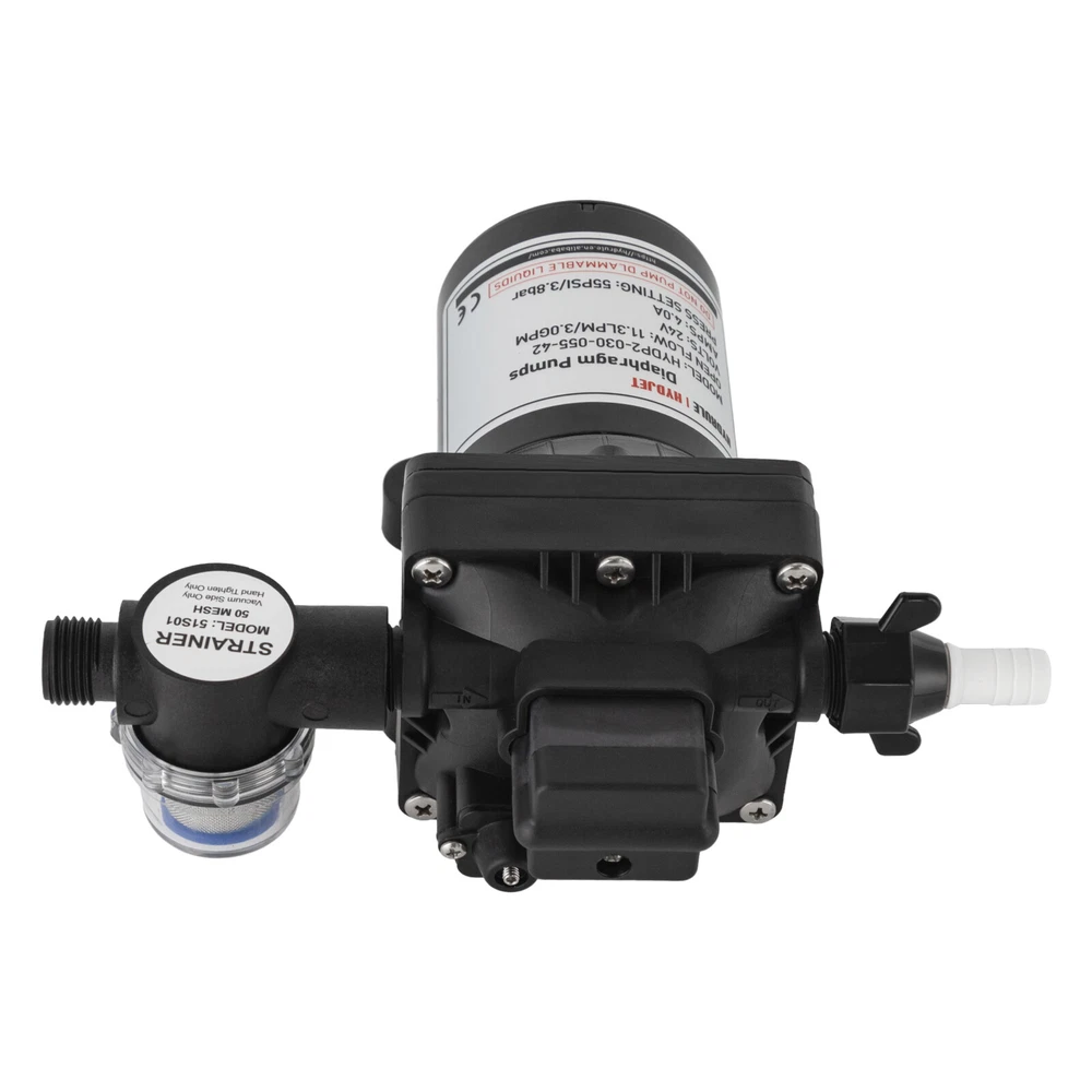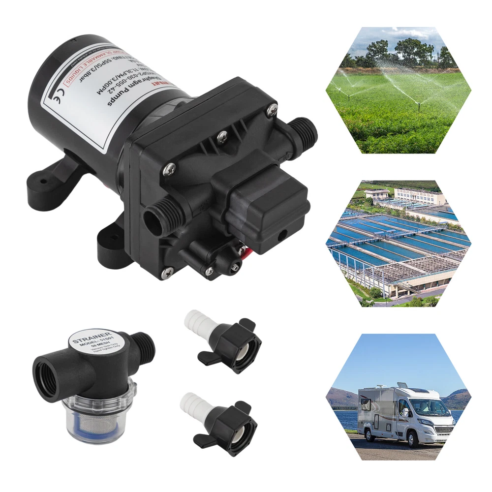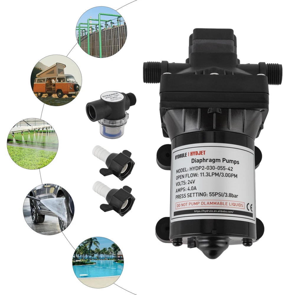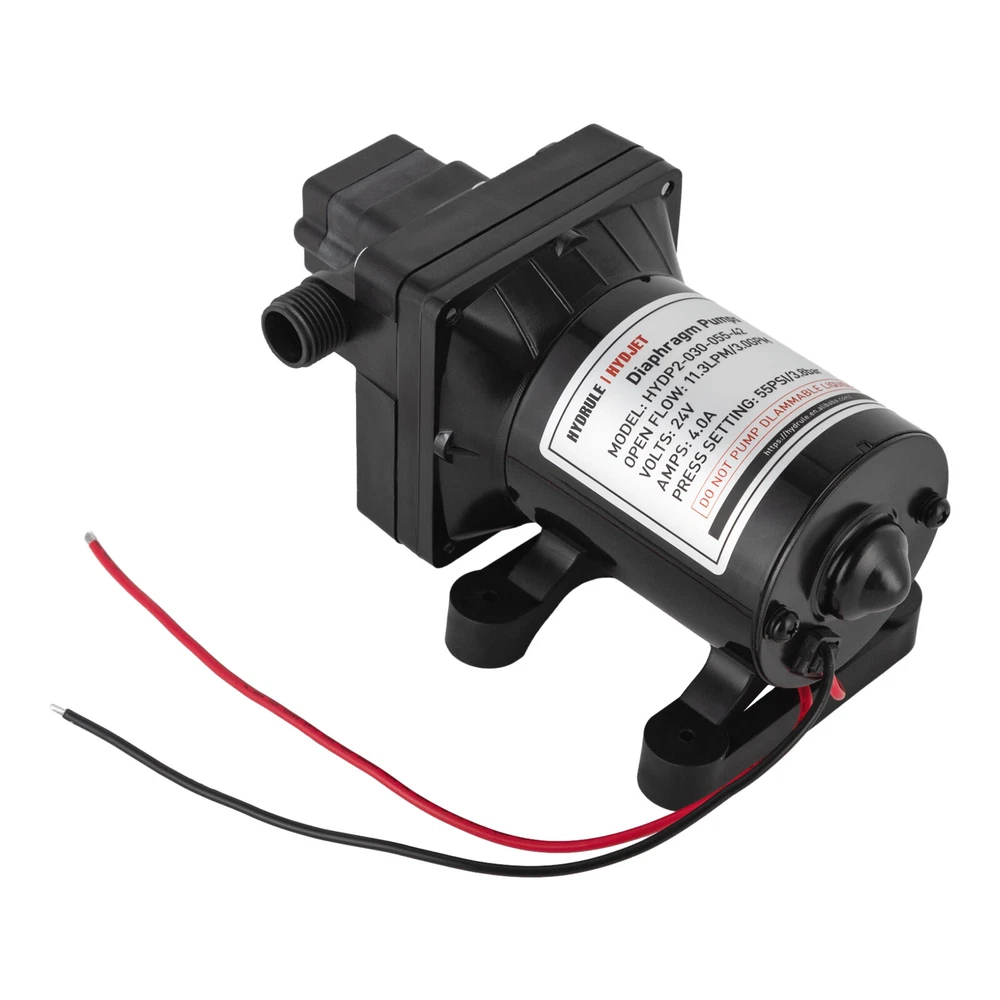 Specifications Color: Black Process: Painting Material: ABS+EPDM Motor: Pure Copper Motor Assembly Required: Yes Control: Pressure Switch Model: HYDP2-030-055-42 Max. Temperature: 60°C/140°F Voltage: 24V Current: 4.0A Noise: 70-80dB Suction Range: 3m/9.84ft Pressure Setting: 55PSI/3.8Bar Flow Rate: 11.3LPM/3.0GPM Port: 1/2" -14MNPT Gross Weight: 2.25kg/4.96lbs Package Size: 26*15*13cm/10.24*5.91*5.12inch Product Size: 21.2*8.3cm/8.35*3.27in Package Included 1* Water Diaphragm Pressure Pump Other Accessories for Installation 55PSI 24V Diaphragm Self-priming Pressure Pump Booster Sprayer For RV/Marine Description A high-performance water diaphragm pressure pump can significantly enhance the functionality and utility of your caravan or yacht, transforming it into a maritime or road-trip sanctuary of efficiency and convenience. This sophisticated piece of equipment possesses the prowess to efficaciously draw water from tanks and elevate pressure levels, thereby ensuring a seamless flow and reliable supply wherever your adventures may take you. Key Features Build to Last : The product is made of high-quality ABS+EPDM and adopts a painting process, making it solid, and not prone to rust and corrosion, so it can keep beautiful and practical for a long time. High Efficiency: The pure copper motor, 11.3LPM/3.0GPM flow rate, and 55PSI pressure will accommodate 3-4 faucet water supplies and make your pumping faster and easier. Safety Guard: It has overheating protection, overload protection, and grounding protection, automatic start/stop, which guarantees the stability of the product's operation and at the same time ensures safety when using it. Economical and Practical: With it , you'll be able to extract water better and increase pressure levels, which can be extremely convenient and cost-effective for you for living. Easy to Clean: The simple construction, smooth surface, and stain-resistant black color allow you to clean it with a damp rag. Simple Installation: With complete accessories and simple construction, you can put it together yourself and put it to use right away! Protective Package: Our product is packaged with air bubble bags to maximize protection from damage during shipping. Customer Service: We aim to provide quality products and services. If you have any problems, please feel free to contact us. We will reply and solve the problem for you as soon as possible. Details Stable Base: The rubber base can better maintain the stability of the product and ensure smoother operation. Standard Port: It uses a 1/2" -14MNPT large diameter port, which makes it practical to match different types of water pipes. Application It can be used for caravans, agricultural irrigation, yachts, dishwasher boosters, equipment water cooler pressurization, water purification machines, shower booster, and more. Specifications Color: Black Process: Painting Material: ABS+EPDM Motor: Pure Copper Motor Assembly Required: Yes Control: Pressure Switch Model: HYDP2-030-055-42 Max. Temperature: 60°C/140°F Voltage: 24V Current: 4.0A Noise: 70-80dB Suction Range: 3m/9.84ft Pressure Setting: 55PSI/3.8Bar Flow Rate: 11.3LPM/3.0GPM Port: 1/2" -14MNPT Gross Weight: 2.25kg/4.96lbs Package Size: 26*15*13cm/10.24*5.91*5.12inch Product Size: 21.2*8.3cm/8.35*3.27in Package Included 1* Water Diaphragm Pressure Pump Other Accessories for Installation Notes Please note that the product will be tested before leaving the factory, so the product with a small amount of residual moisture is a normal phenomenon. For use in environments with sewage, please be sure to install a filter at the water inlet for use! Please allow the slight color difference caused by the shooting light and 1-3cm error due to manual measurement, and make sure you do not mind before ordering. Payment Delivery details Terms of sales About us Contact us Payment We accept ebay payment 。 Fees such as import duties, taxes are not included in the item price or shipping costs. These charges are the buyer's responsibility. Delivery details Shipping: 2-9 working days to: USA Terms of sales We maintain high standards of excellence and strive for hundred percent customer satisfaction. Feedback is very important to us. We hope that you contact us immediately before you give neutral or negative feedback, so that we can address your concerns. It is impossible to address issues if we do not know about them! About us Your satis faction is our ultimate goal. We work hard to earn your trust and future business. Our certified technicians have tested each item before shipping. The unit comes with 1 year limited warranty on all manufacturing defects. a) If you receive a defective item, you may return it or ask for a discount. Please contact us within 14 days after you receive the package. b) What you returned must be intact and in its original packaging as re? u. Customer is responsible for shipping costs of the returned item. c) We will cover the cost of shipping back t with the shipping rate indicated in the registration page. We will send you a new unit or refund the full payment you paid. Thank you. Contact us Business Hour Business Hour: Monday To Friday: 8:30 AM to 5:00 PM (Beijing China time) Due to time zones, our reply to your questions may not be immediately. But within above working time, we will reply your email within 24 hours. If it's non-workdays, please kindly be patient and wait till Monday. Please contact us with ebay message. Please feel free to contact us if you have any questions. Monday To Friday: 8:30 AM to 5:00 PM (Beijing China time) Due to time zones, our reply to your questions may not be immediately. But within above working time, we will reply your email within 24 hours. If it's non-workdays, please kindly be patient and wait till Monday. Please contact us with ebay message. Please feel free to contact us if you have any questions. Brand Unbranded MPN Does not apply Material ABS+EPDM Motor Pure Copper Motor Assembly Required Yes Control Pressure S