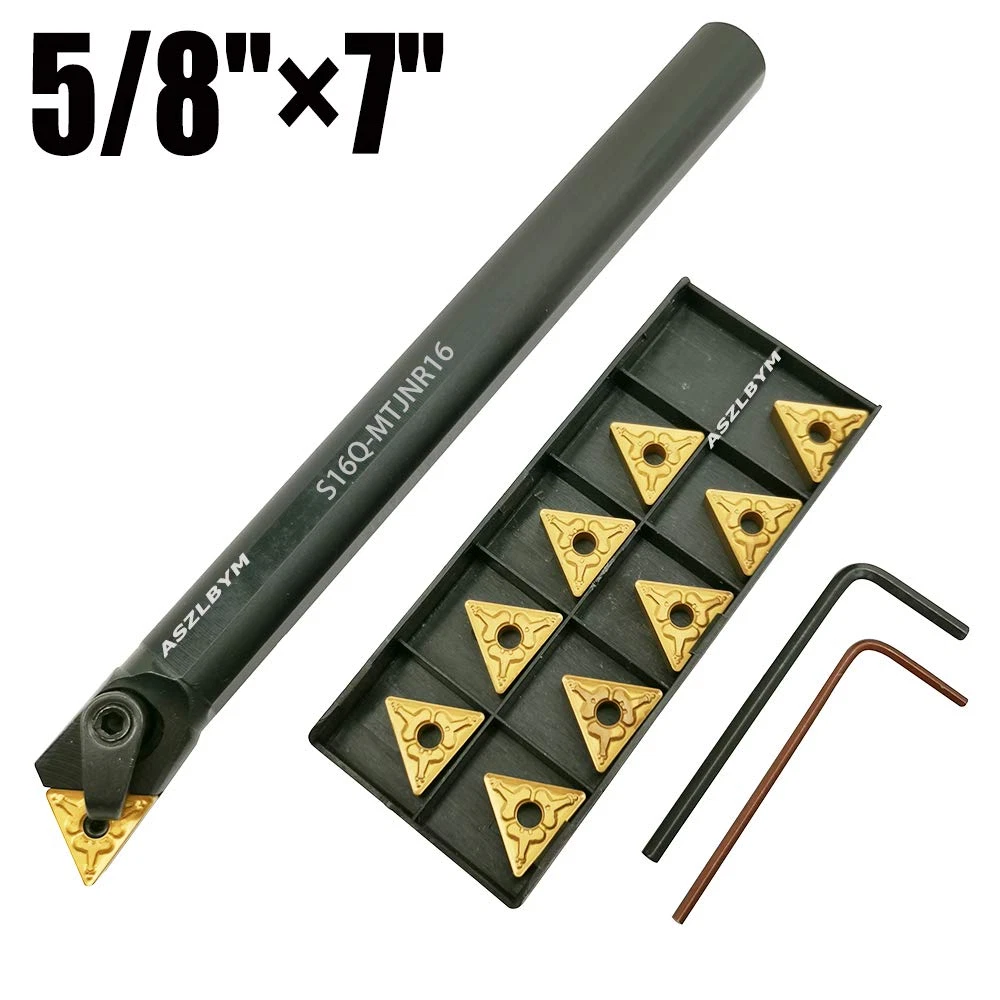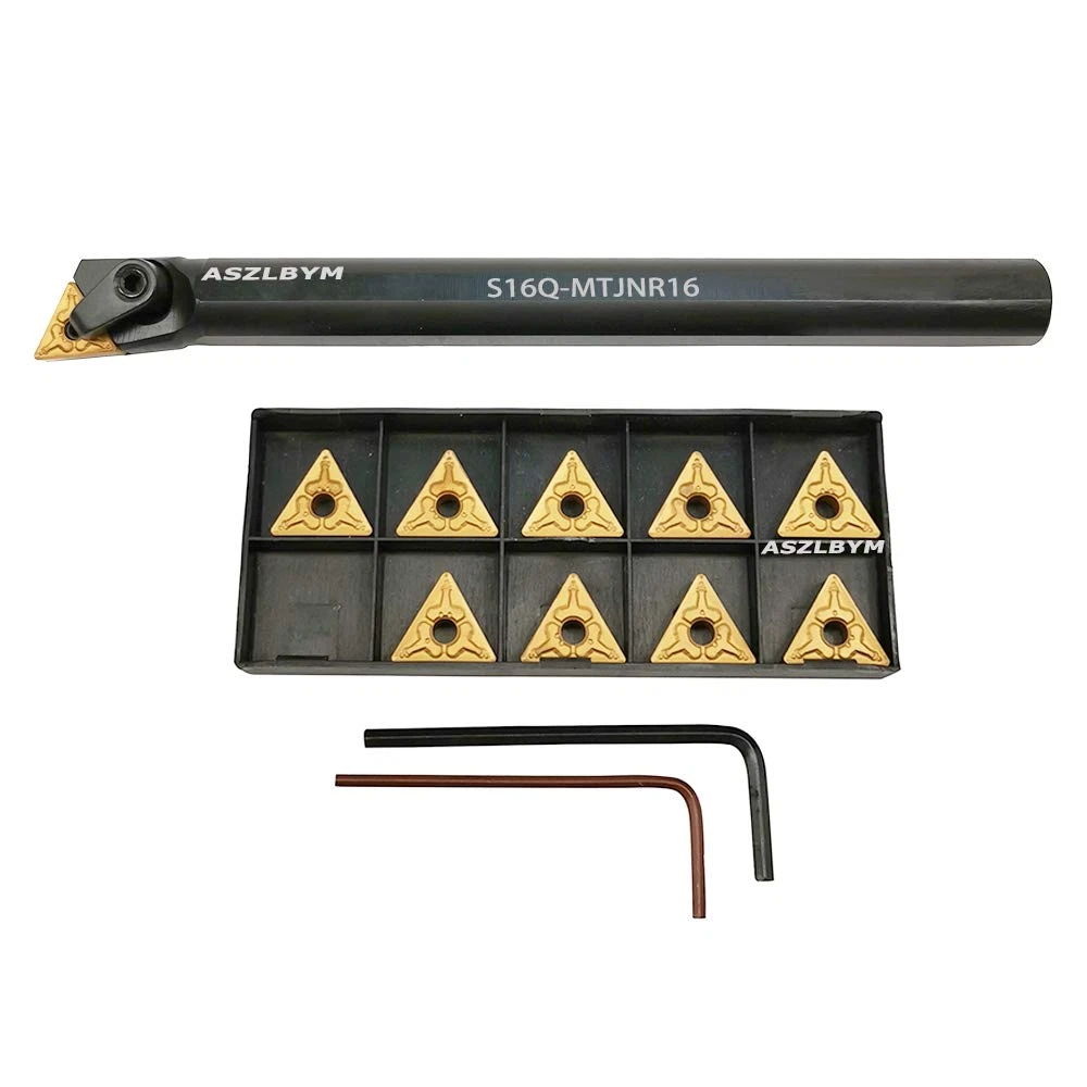 ★S16Q-MTJLNR16 boring bar : material is alloy steel, shank Diameter 5/8'' , overall Length 7'' ,cutting direction:right hand. ★TNMG331 turning insert : material is carbide, coating is TIN, can be used to process stainless steel, cast iron, steel parts. ★The carbide inserts and turning boring bar are packed in plastic containers, safe and easy to store . ★Package : 1pc S16Q-MTJLNR16 boring bar + 10pcs TNMG331 carbide insert + 2pcs wrench Product Description ASZLBYM 5/8'' x 7'' Carbide Indexable Boring Bar Turning Tool Holder S16Q-MTJNR16 with 10pcs TNMG331 / TNMG160404 Indexable Carbide Turning Inserts -----S16Q-MTJNR16 Material: 40Cr , Lead Cutting Angle: 93Degree Cutting direction: right hand Full length: 180mm≈7.08inch , Diameter: 20mm≈3/4" Dmin(Minimum machining diameter): Φ25 Pin: CTM510 , Wrench: L2.0 , L3.0 Screw: ML0620 ,Clamp: HL1810 -----TNMG331/TNMG160404 Material: Carbide , Coating : TIN ,can be used to process stainless steel, cast iron, steel parts.