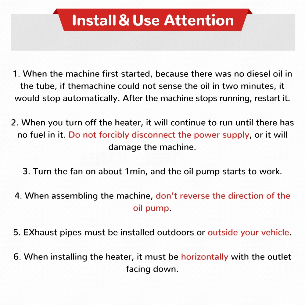 Product Description The air diesel heater can be used for truck, boat, car trailer, motorhomes, touring car, campervans, caravans and all kinds of other diesel vehicles. Diesel air heater is also suitable for indoor use, such as for home, warehouse, factory, office, etc. Tips: The smaller the space, the faster the warmth. If the space is large, it is recommended to buy a few more heaters to heat it. Remote control can Preheating, oil quantity, temperature and wind speed can be adjusted, window's frost can be eliminated. Environmentally air diesel heater, low emissions, low fuel consumption. NOTE: The remote control needs to be set before it can be used. You can see the steps in the Product Description. Compact structure, easy to install. When the vehicle is replaced, it can be disassembled to the new car. The LCD dynamic display will clearly show the running state of the machine. Fuel, electricity, temperature can be set arbitrarily. The engine coolant can be preheated to avoid engine wear and tear at low temperatures. Volatile technology, by the ceramic ignition plug will fuel heating evaporated into gas, fast ignition, full combustion. Specification: Heater power: 8KW Fuel gasoline: diesel Car air conditioning type: Heating Rated voltage: 12V Working temperature of the heater: -40℃~+50℃ Working temperature of the oil pump: -40℃~+40℃ Item Size: about 15.3" x 5.7" x 5.7" inch (As picture shows) Features: The air diesel heater can be used for truck, boat, car trailer, motorhomes, touring car, campervans, caravans and all kinds of other diesel vehicles. Environmentally air diesel heater, low emissions, low fuel consumption. Remote control can Preheating, oil quantity, temperature and wind speed can be adjusted, window's frost can be eliminated. Compact structure, easy to install. When the vehicle is replaced, it can be disassembled to the new car. Fuel, electricity, temperature can be set arbitrarily. The LCD dynamic display will clearly show the running state of the machine. The engine coolant can be preheated to avoid engine wear and tear at low temperatures. Volatile technology, by the ceramic ignition plug will fuel heating evaporated into gas, fast ignition, full combustion. Full kit includes everything needed for standard installation. (As picture shows) Package Included: 1 x Air Heater 1 x Silencer 1 x LCD screen 1 x Remote Control 1 x Tank(10L) 1 x Wire Bundle 1 x Vent 1 x Air Outlet Pipe 1 x Intake Pipe 1 x Exhaust Pipe 1 x Oil Pump 1 x Fixed Plate 1 x White Oil Pipe 1 x Oil Nozzle 1 x Fastener 1 x Installation Kit Note: Since it is a manual measurement, please allow an error of 1-3 cm. Picture is slightly different in color, which mainly lies in different light effect and computer monitor. The remote control needs to be set before it can be used. Please follow the steps below: 1. With the air heater stopped working, press the "▲" button and keep pressing until the "HFR" appears on the screen. 2. When the "HFR" appears on the screen, press the unlock button on the remote control, and then press the "ok" button. 3. Note: The above steps can only be performed if the air heater is stopped. Any question please email to us. Tip: It is normal for the machine to fail to ignite the first time . Please wait patiently. restart the machine after the machine stops , wait for a few minutes and do not press the key. when the oil pump works, it will be accompanied by ignition. if the ignition is successful, hot air will be emitted in 3 minutes. Remote control batteries not included!