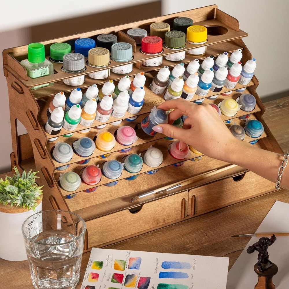 Specific Uses For Product Paint Bottles Material Wood Special Feature Portable Color Wood Finish Type Engineered plywood Product Dimensions 9.8"D x 16.1"W x 10.2"H Shape Rectangular Capacity 0.06 Kilograms Package Type Ships in a box with protective packaging for individual parts See less Mounting Type Tabletop Mount Item Weight 2.7 Pounds Number of Compartments 58 Unit Count 1.0 Count About this item Paint accessories – This Vallejo paint supply storage organizer is made from sturdy plywood without plastic or acrylic - only natural materials. Also, Plydolex painter paint rack is very capacious, we designed 2 extra large holes, 12 holes by 1.57" diameter, 20 holes by 1.37" diameter, and 24 small holes by 1" diameter. On the backside stand of the wooden craft paint storage rack, you can place bottles of any extraordinary diameter. Removable upper shelf – The unique construction of Plydolex Vallejo paint storage allows choosing your use case. Thanks to the removable upper shelf of the paint storage organizer you can store you can either store more bottles of paint or put on the shelf ready painted miniatures and paint bottles with a larger diameter that do not fit in the paint station's holes. Easy to assemble – In the package you will find details of Vallejo paint organizer that should be assembled and step-by-step instructions. Our advantage is that the Plydolex wooden craft paint storage rack is assembled without glue, and wooden fasteners are included in the set, so the finished construction of Citadel paint rack will be sturdy and durable. We are also convinced that the process of assembling Plydolex Citadel paint holders and organizers can also be a fascinating DIY activity! Complete set – Our Citadel paint rack has two drawers for a wide range of art tools, one of which has a removable 8-part divider! It's incredibly convenient cause you can organize the space of craft paint holder rack to your own taste. Also, the backside of Plydolex paint rack organizer isn't one-piece, but has a stand for large paint bottles that do not fit into the main holes. But that's not all, to make it easier for you to paint the miniatures, the kit includes 4 special miniature stands! Convenient design – Plydolex paint station produced for miniature painting set and other tools. In our paint holder, you can store Citadel paints, Vallejo paints, Barrel paints, FolkArt paints, Tamiya paints, and others. The laconic design of the painter paint rack organizer decorates your workplace and makes it more organized. If you like working with paints, you will appreciate the necessity of miniature paint rack. Also, our painter paint rack organizer will be a great gift!