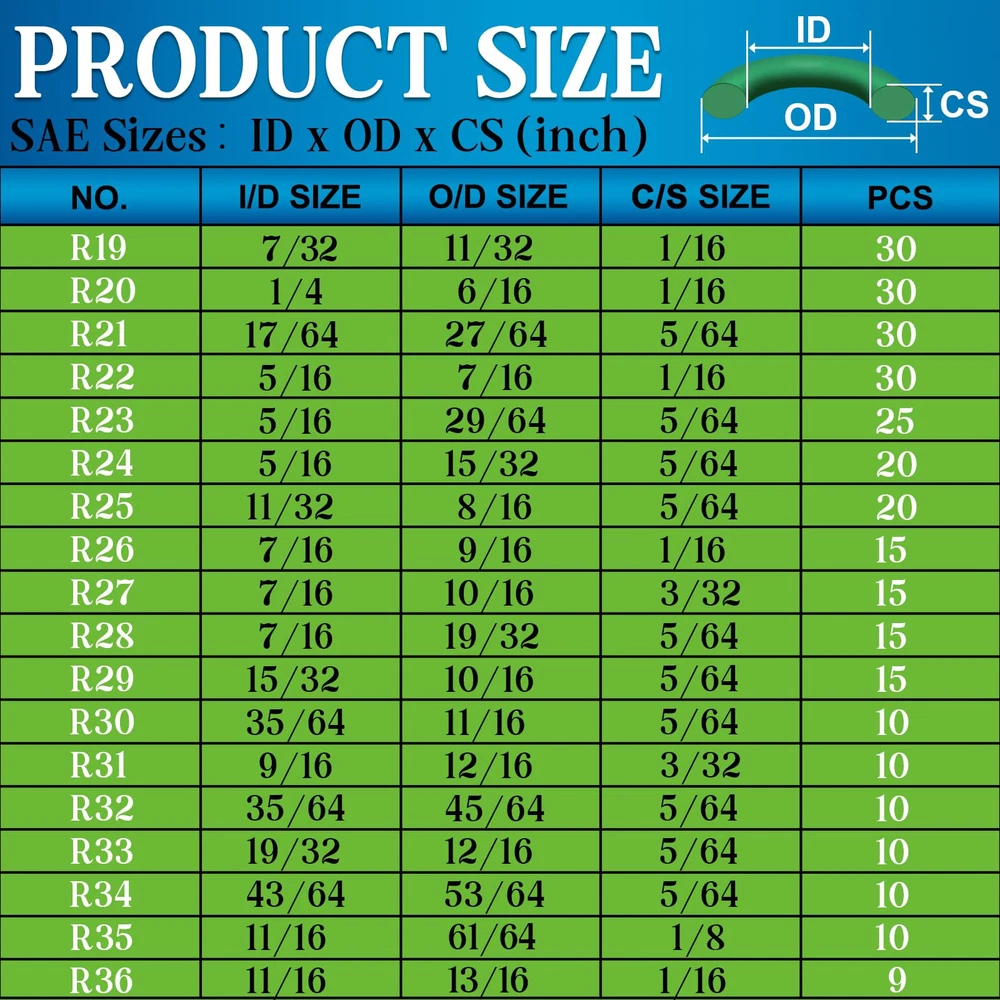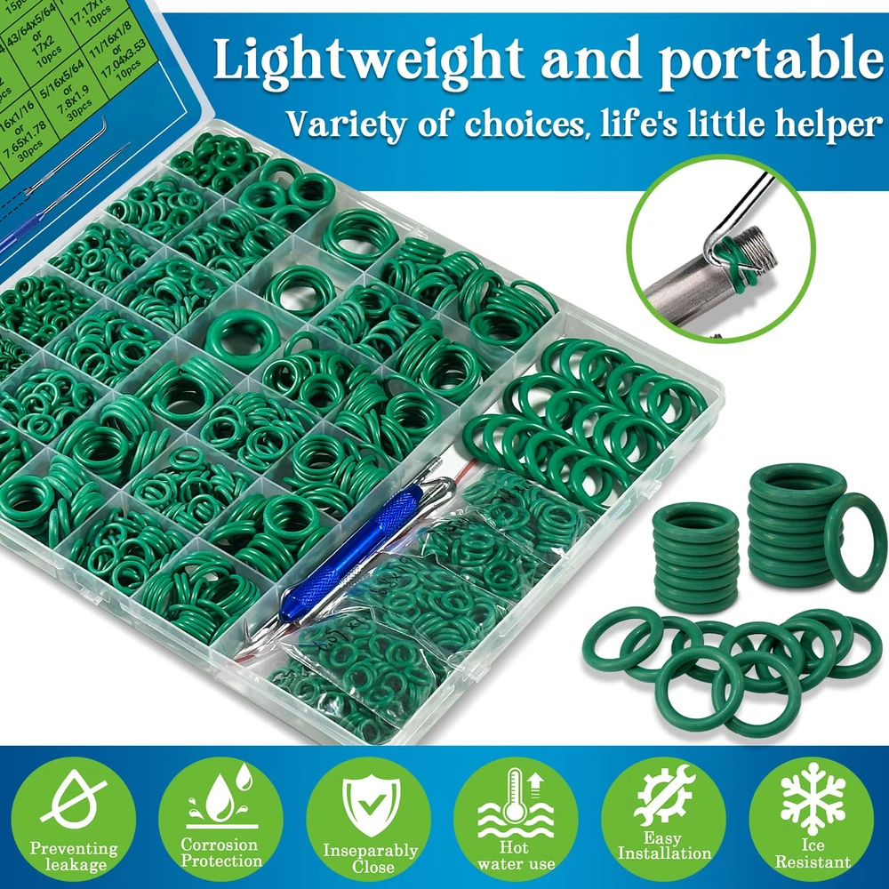 High-quality materials: air conditioning o-rings are made of high-quality commercial-nitrile rubber (nbr) 70, wear-resistant, automotive air conditioning o-rings are widely used in automotive, machinery, electronics, hot water and other industries. Multiple sizes: automotive air conditioning o-ring kits contain a wide range of sizes of metric and inch o-rings, which can meet almost all your different repair needs Wide applications: ac o ring kits are suitable for sealing leaks in automotive air conditioning (air conditioning systems), compressors and specialty faucets, all types of water pumps, high pressure washers, filters, electrical and electronic equipment, solenoids, mechanical bearings, and kitchen and bathroom water fittings Various advantages: good corrosion resistance, sealing, water resistance, deformation resistance, heat resistance, abrasion resistance, especially gasoline and oil resistance, preventing air, oil, gas and water leakage, good choice for repair and maintenance of air conditioner o-ring seals air conditioning o-ring: 36 sizes green o-ring automotive air conditioning compressor seals combo kit, great for automotive, faucet, pressure washer, duct seal repair!