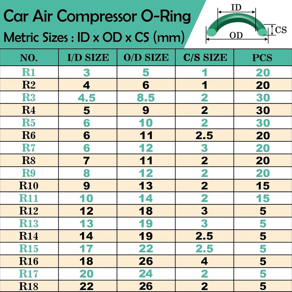 Store New Arrivals Add to Favorite View Feedback Contact 595 Pcs Metric and SAE Air Conditioning O-Ring Kit for Automotive A/C Compressor Description Style Air Conditioning O-Rings Color Green Material Rubber Country of Origin China Temperature Range -40℉ to 248℉ Degrees Fahrenheit Package Dimensions 9.61 x 8.15 x 0.79 inches; 10 ounces High-quality materials: air conditioner O-ring kits are made of Nitrile Rubber (NBR) 70, no contact corrosion, no contaminated media and no odor Advantages: good corrosion resistance, sealing, heat resistance, deformation, water resistance, abrasion resistance, especially gasoline and oil resistance, can prevent air, oil, gas and water leakage Wide application: NBR is widely used as O-ring material in the world. Widely used in a variety of water pumps, faucets, pressure washers, automotive air conditioning (A/C system), electronic appliances, workshop solenoid valves, mechanical bearings and other parts of the sealing DIY maintenance Multiple Sizes: Air Conditioner O-Ring Kits 36 different sizes of o-rings to meet almost all your different needs.The o-ring kits come in a plastic organizer box, which makes it easy to choose the size you need, very easy to use and find Air Conditioning O-Ring: Rubber O-Ring Automotive Air Conditioning Compressor Seal Repair Kit Product Description 595 Pcs Metric and SAE Air Conditioning O-Ring Kit for Automotive A/C, Compressor and Professional Faucet Plumbing Seal Orings Repair with O-Ring Picks ,Resist Oil and Heat (Green) Air Conditioning O-Ring Advantages Multiple Sizes 36 popular sizes of air conditioning o-ring kits for virtually all of your automotive air conditioning repair needs With o-ring removal hook Easy to use and remove the o-ring, it is a maintenance assistant Excellent kit One box storage, regular arrangement, with stickers corresponding to the size, easy to use Multiple sizes for your repair needs 275 PCS 18 Sizes Metric Air Conditioning O-Ring Sizes: ID x CS (MM) 3x1mm、4 x1mm、4.5x2mm、5x2mm、6x2mm、6x2.5mm、6x3mm、7x2mm、8x2mm 、9x2mm、10x2mm、12x3mm、13x3mm、14x2.5mm、17x2.5mm、18x4mm、20x2mm、22x2mm 320 PCS 18 Sizes SAE Air Conditioning O-Ring Sizes: ID x CS (INCH) 7/32x1/16、1/4x1/16、17/64x5/64、5/16x5/64、5/16x1/16、5/16x5/64、11/32x5/64、7/16x1/ 16、7/16x3/32、7/16x5/64、15/32x5/64、35/64x5/64、9/16x3/32、35/64x5/64、19/32x5/64、43/64x5/64、 11/16x1/16、11/16x1/8 Wide range of applications in life Air conditioner O-ring kits Widely used in automotive air conditioning (A/C system), compressors and faucets, water pumps, high-pressure washers, electronic and electrical appliances, workshop solenoid valves, mechanical bearings and other parts of the seal DIY repair ABOUT US We offer the best prices around on high quality products. Our E-store includes media such as books, movies, music and games while offering electronics, toys, sporting apparel, clothing, tools, general home, garden items and more. SHIPPING We are always working hard to ensure your package arrives as soon as possible. Please understand that some factors like weather, high postal traffic, and the performance of shipping companies are outside of our control. We offer free shipping to the lower 48 states and ship within 2 business days of payment, usually sooner. We do not accept P.O. Boxes. Please provide a physical address. RETURNS We offer a 30-Day Return Policy on items which you are not completely satisfied with. You have the option for a full-refund or an exchange of the item. No returns are available on items shipped outside of the USA. PAYMENT We accept PayPal. CONTACT US This page content is yet to come Please ad us to your favorite seller and visit again later Thank You CUSTOMER SATISFACTION We try our very best to make sure every customer is completely satisfied. If there's a problem, message us! We're happy to help.