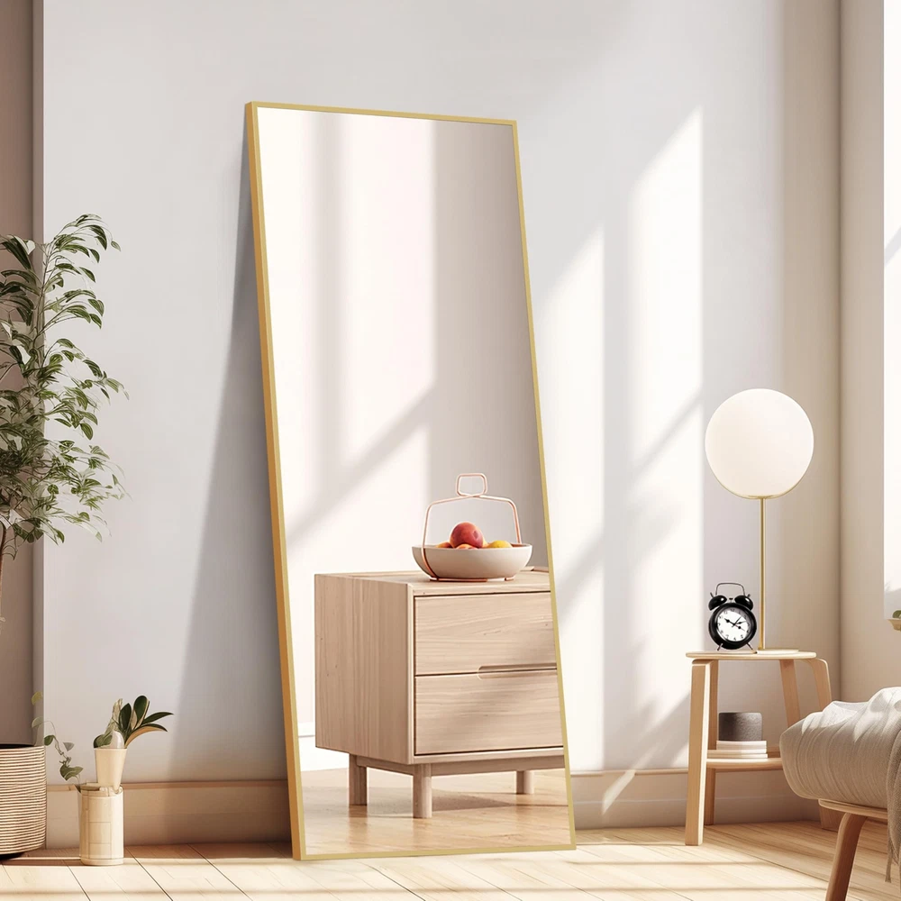 About this item Glass Full-Length Mirror:59" x 16" full-size mirror, enough for you to see your entire figure in a single glance and bring you light, beauty, and confidence Safety Glass: Our full length mirror is made of HD-definition glass, explosion-proof materials, The glass is reinforced with an explosion-proof layer, offering enhanced safety by preventing shattering upon impact Elegant Design: The top of the floor mirror is designed with a unique smooth arched-top frame, which especially attracts people's attention and highlights the beauty of the mirror. The thin aluminum alloy frame makes the mirror looks more classic and it is suitable for dressing in any room Multiple Placement Options: This full-body mirror offers three placement options: floor-standing, wall-mounted, or leaning against a wall. The included bracket allows for easy positioning, making it ideal for bedroom, living room, closet, home gym, hallway, and retail spaces Easy to Install: Some pre-drilled holes on the frame, removable bracket, and we also provide dry wall rivets and screws, which ensuring that you can hang the mirror on the wall