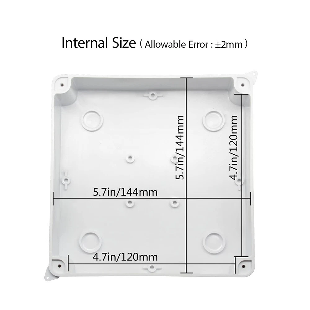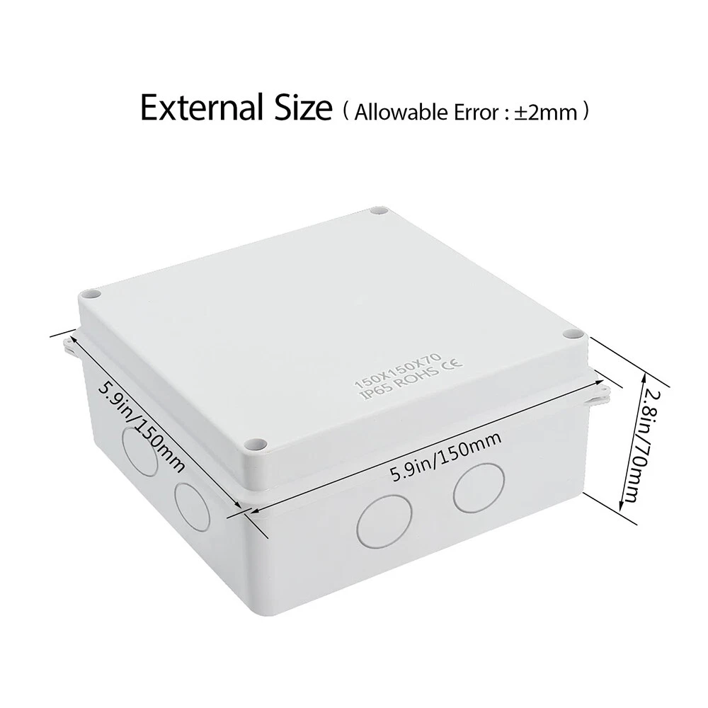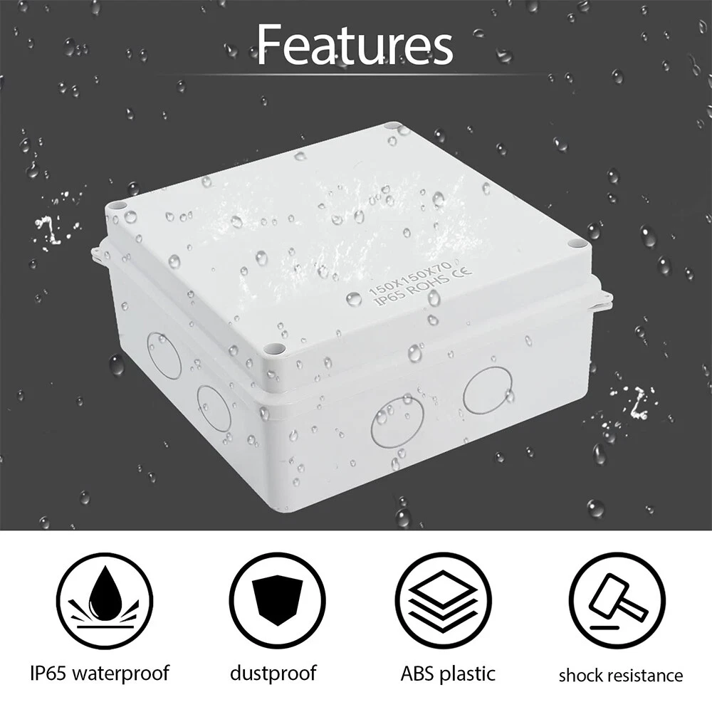 Material: ABS/Plastic Box Shape: Rectangular Resistance Properties: Child Resistant, Corrosion Resistant, Dustproof, Dust Resistant, Impact Resistant, Moisture Resistant, Rustproof, Rust Resistant, Scratch Resistant, Shockproof, Sunlight/UV Resistant, Tear Resistant, Waterproof, Water Resistant, Weatherproof, Weather Resistant Size: 5.9"x5.9"x2.75" Room: Any Room Protection Properties: Wire Protection Color: White UPC: Does Not Apply Suitable For: Ceiling, Exterior, Interior, Wall gtin13: Does Not Apply Features: Waterproof Application: Automotive, Branch Circuit, Charging/Power, Commercial, Control Equipment Panels, Conveyance Lines, Cooker, Data Centers, Electrical Wiring, Electronics, Fan Control, Home/Garden, Home Appliance, Industrial, Instruments, Large Appliances, Light Control, Multi-Outlet/Power Splitter, Outlet, Portable Generator, Power Transformers, Small Appliances, Telecommunications, Transportation, Voltage Conversion Type: Small Junction Box Brand: Unbranded MPN: Does Not Apply IP Rating: IP65 Mounting Style: Ceiling, Fixed, Modular, Panel, Surface, Suspended, Unit, Wall