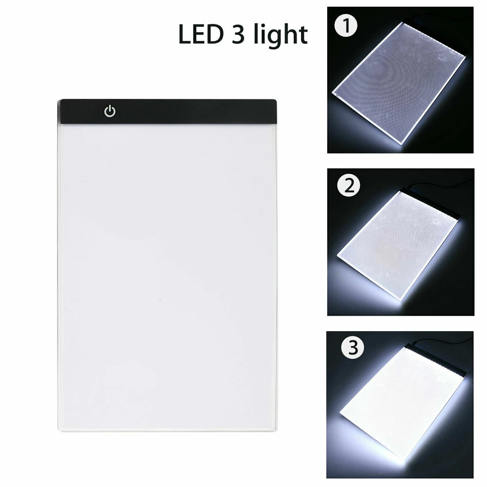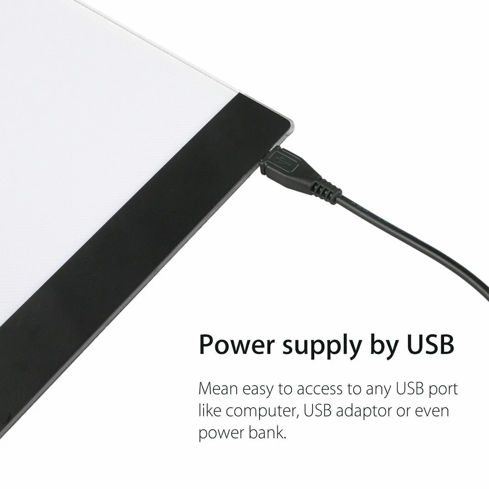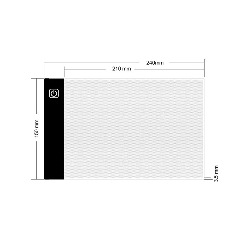 Description: Portable & Ultra Slim:The thickness is only 3.5mm which makes it portable. USB Powered:Comes with a USB cable, easily power the light box from any Computer, Power Bank or USB Plug that connects directly into a wall outlet. The light is3 brightness levels:You can adjust the bright, flicker-free, evenly distributed illumination pad is ultra-thin and light weight. Intelligent Touch Control: with a slight touch, it can be turned on/off. NOTES: 1.Handle with care. Do not use sharp metal objects. Protect working surface from scratches. And only use on a safe stable working surface. 2. After use always store in a safe dry place. 3. Please tear the protective film Features: Material: Acrylic Light Type: LED Dimension: A5:240*150*3.5mm Working Voltage: DC 5V Rate Power: 2.8W Interface: mirco-usb Net Weight: 210g Package Includes: 1x A5 LED Tracing Board 1x Power Adapter 1x Instruction Manual