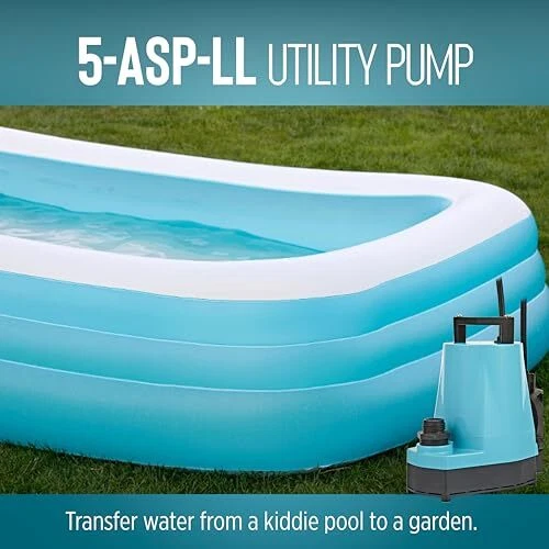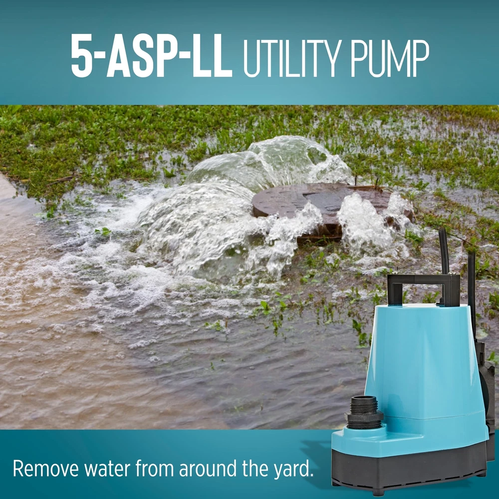 The 1/6 HP 5-ASP-LL 1500 GPH continuous duty submersible utility pump comes with a piggy-back diaphragm switch than can be easily by-passed for manual operation. This low level switch activates the pump when the water level reaches 2 to 3 inches and shuts the pump off when the water falls between 0.5 and 1.5 inches. To by-pass the switch, unplug the pump from the back of the switch and plug directly into the outlet. This pump is ideal for emergency water removal, water transfer, water recirculation or hydroponic use in homes, commercial or industrial applications. It comes with a removal screen and removes water down to 1/8-inch with screen in place or 1/16-inch with the screen removed. This pump comes equipped with an 18-foot cord. A 3/4-inch garden hose adapter is included. This unit is not designed to filter out sewage, mud, soil, or similar matter. If you are looking for a pump that can filter out sewage, mud, soil, etc., consider an effluent, sewage, or trash pump. AUTOMATIC UTILITY PUMP: For submersible use only; comes with a piggyback diaphragm switch with 18-ft. cord; 1-inch FNPT discharge and 3/4-inch garden hose adapter SUBMERSIBLE PUMP: Typical applications for the 5-ASP-LL pump include commercial, industrial, and home uses where liquid must be transferred or recirculated; this pump is for submersible use only BUILT TO LAST: epoxy coated die-cast aluminum with a 1/6 HP permanently lubricated, oil-free, energy-efficient PSC motor with overload protection, triple-lip seal, upper and lower ball bearings Portable and compact weighing 8 lbs. with built-in carry handle; piggyback switch allows easy conversion to a manual pump SPECIFICATIONS: 1/6 HP, 1500 GPH, 115-Volt, 25-foot cord, 2.0 running Amps, 220 Watts, 26-foot shut-off, 11.43 PSI, automatic operation - on at 2 to 3 inches; off at 0.5 - 1.5 inches